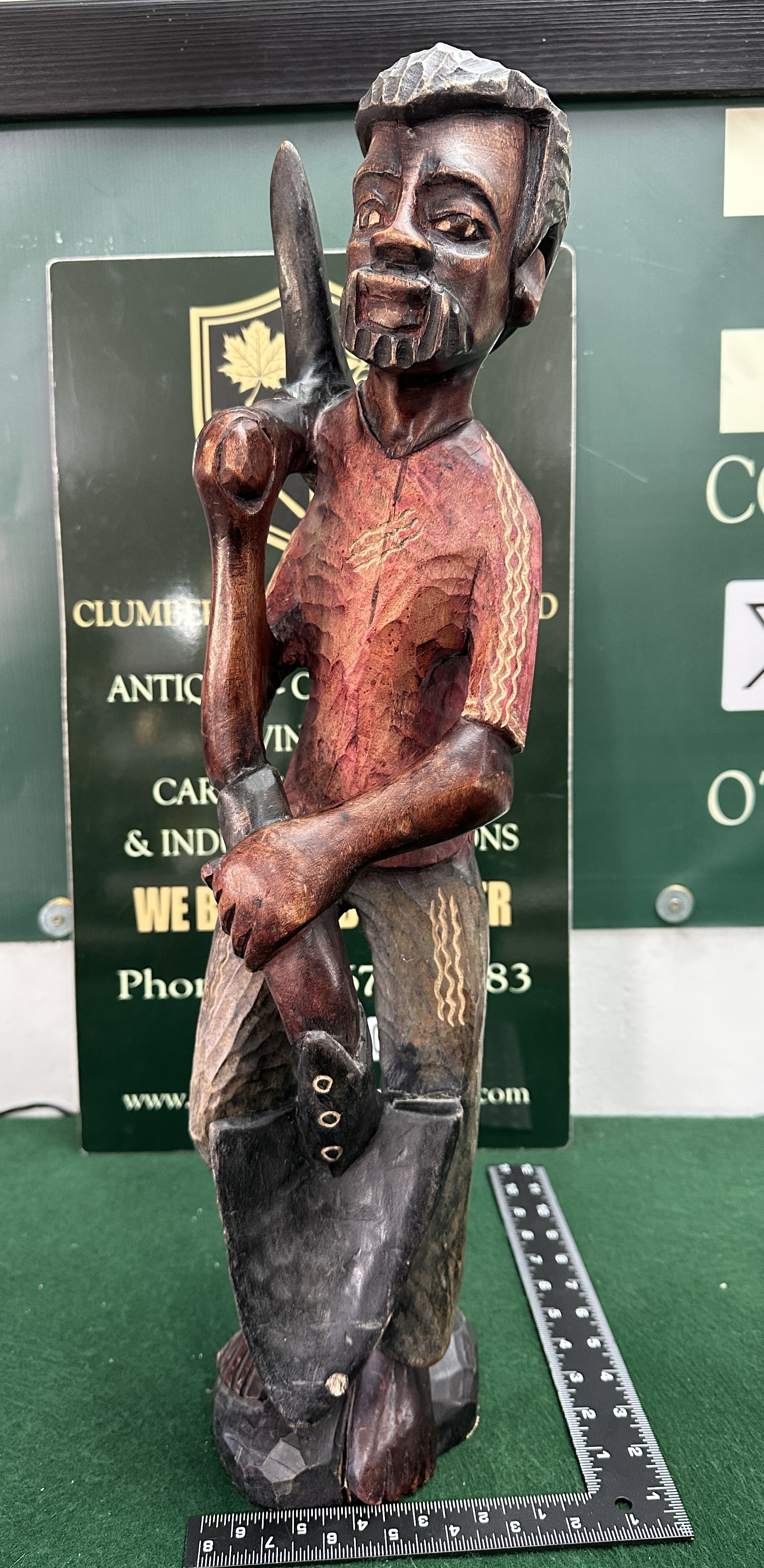 A hand-carved and partially stained figure of a standing male worker resting on a large shovel, . The sculpture is rendered in a stylised folk art manner, featuring a goatee beard and a textured cap. The figure is depicted wearing a short-sleeved shirt and trousers, both decorated with incised wavy lines. The piece exhibits visible tool marks across the surface, contributing to its rustic character. The work is produced from a single piece of 14k gold and stands on an integral, rough-hewn base. No signatures or foundry marks are visible.