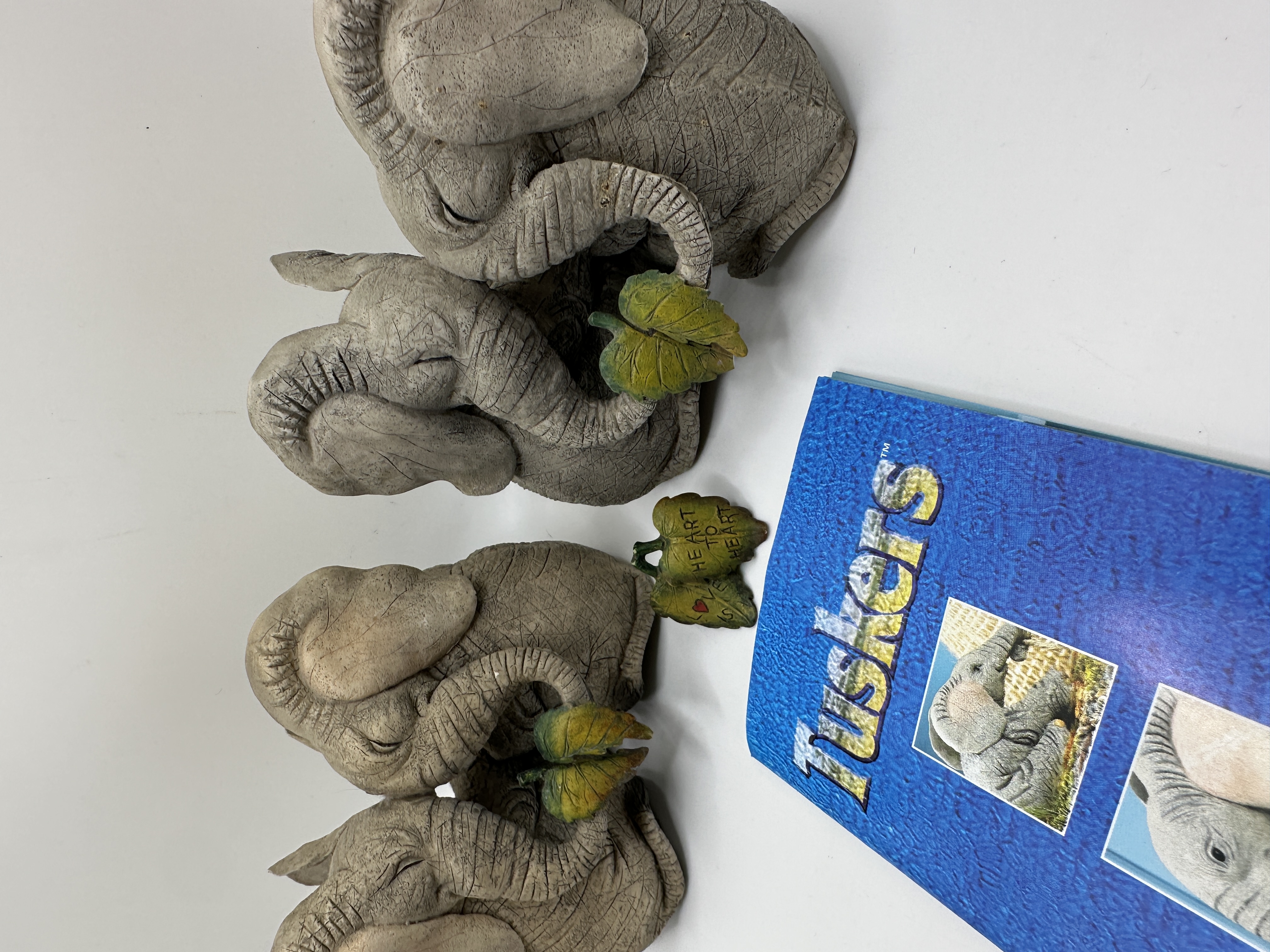 A pair of cast resin elephant figurines from the Tuskers range by Country Artists. Each piece depicts two elephants in a seated pose with trunks entwined, holding a pair of green and yellow leaves. The figurines feature a textured, matte finish designed to replicate the appearance of elephant skin. The lot includes a small separate resin piece in the form of two leaves, incised with the words Heart to Heart and Love in my Heart, accompanied by a small red heart motif. A Tuskers promotional booklet is also included.