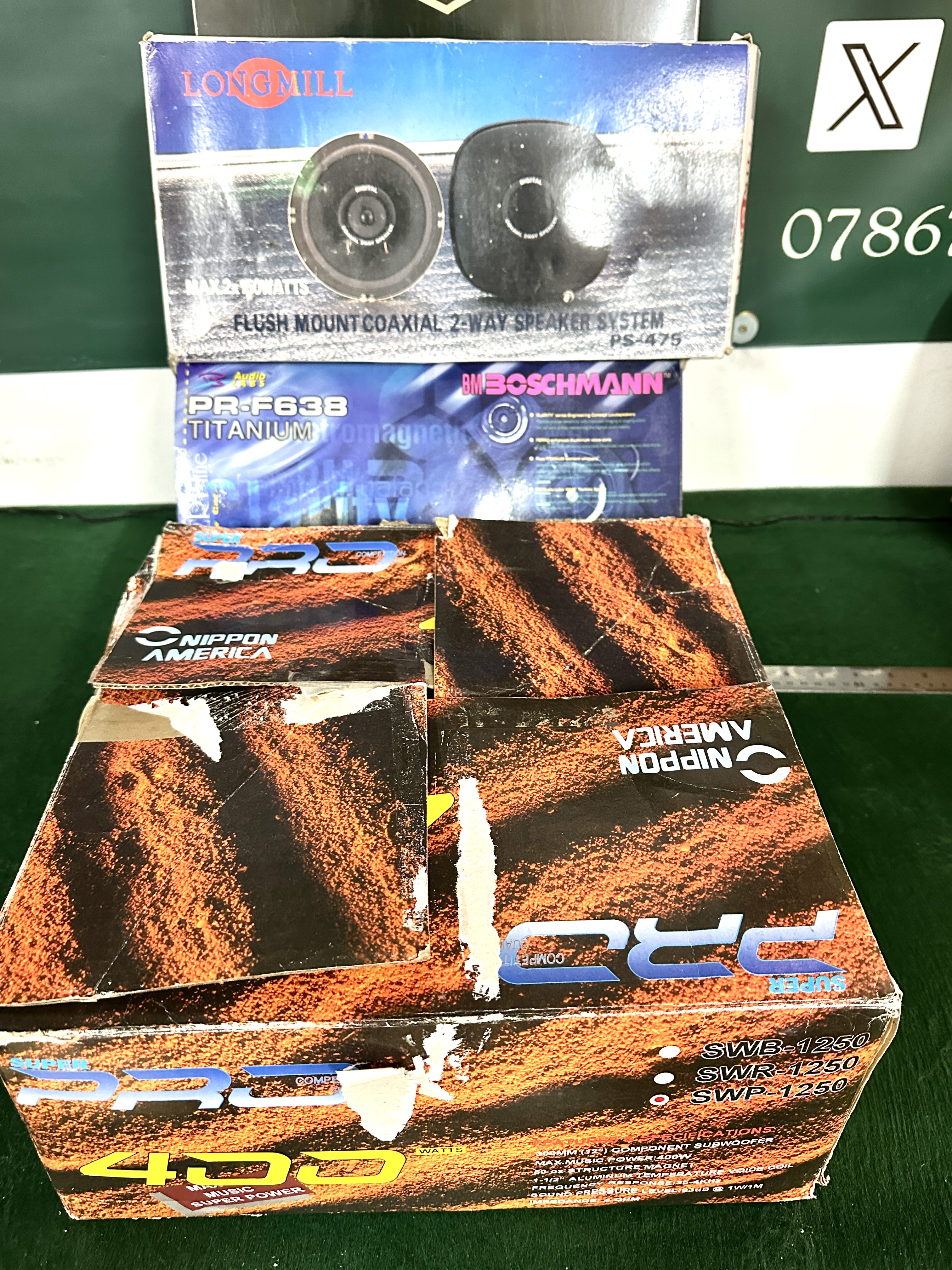 The speakers appear to be in unused cosmetic condition. Operation has not been tested and power-on status is not demonstrated. The Longmill and BM Boschmann boxes exhibit moderate shelf wear. The Nippon America packaging is in poor condition with extensive tearing, creasing, and surface damage.