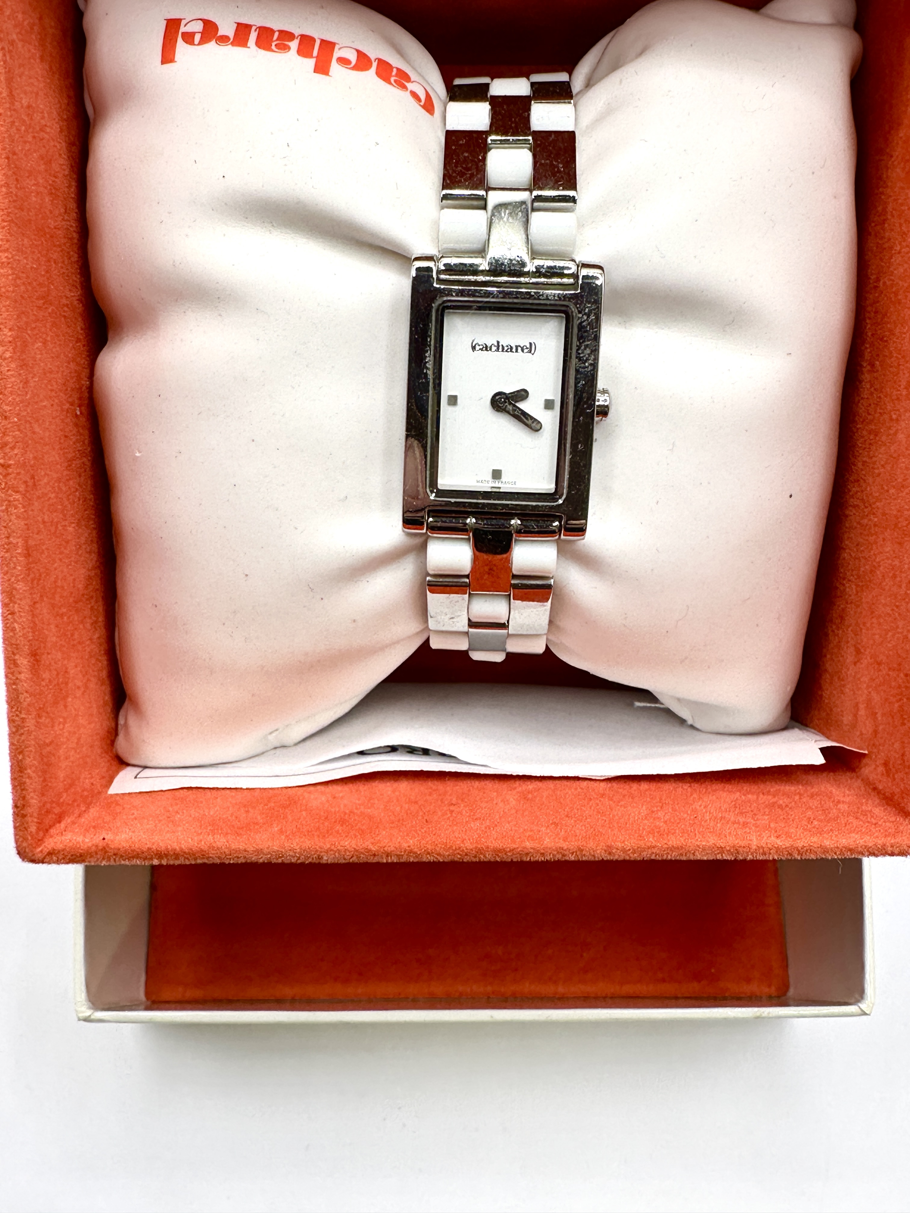 A ladies quartz wristwatch by the French fashion house Cacharel. The timepiece features a rectangular polished silver-tone metal case and a white dial. The dial is printed with the brand name Cacharel and is marked Made in France at the six o’clock position. The watch is fitted with an integrated articulated bracelet featuring alternating polished metal and white links, secured with a fold-over clasp. The item is presented in its original white and orange branded box with a display cushion and an instruction or warranty leaflet.