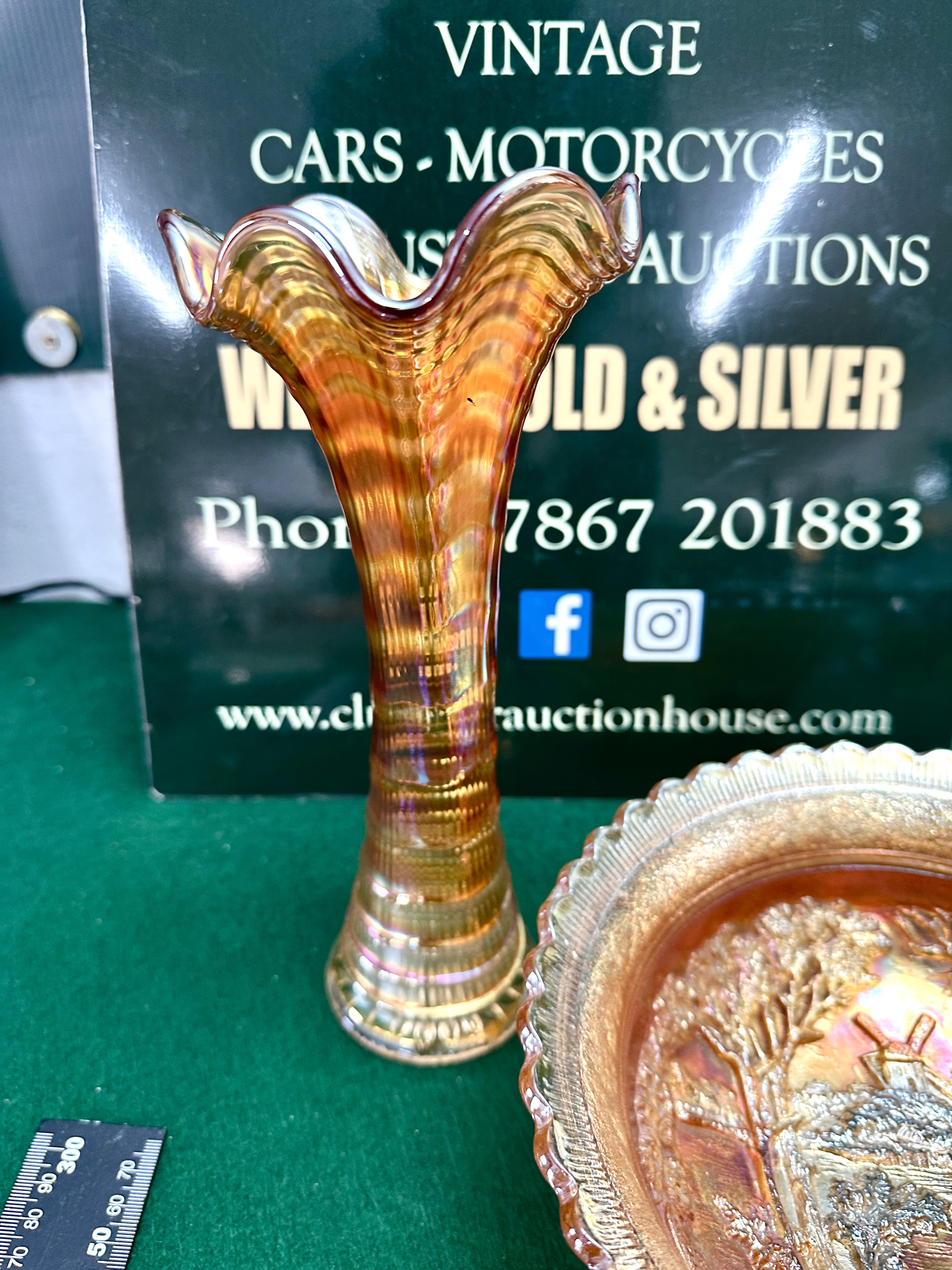 Both items appear to be in good condition. There are no visible chips, cracks, or restorations. The iridescent marigold finish shows no significant signs of wear or surface loss.