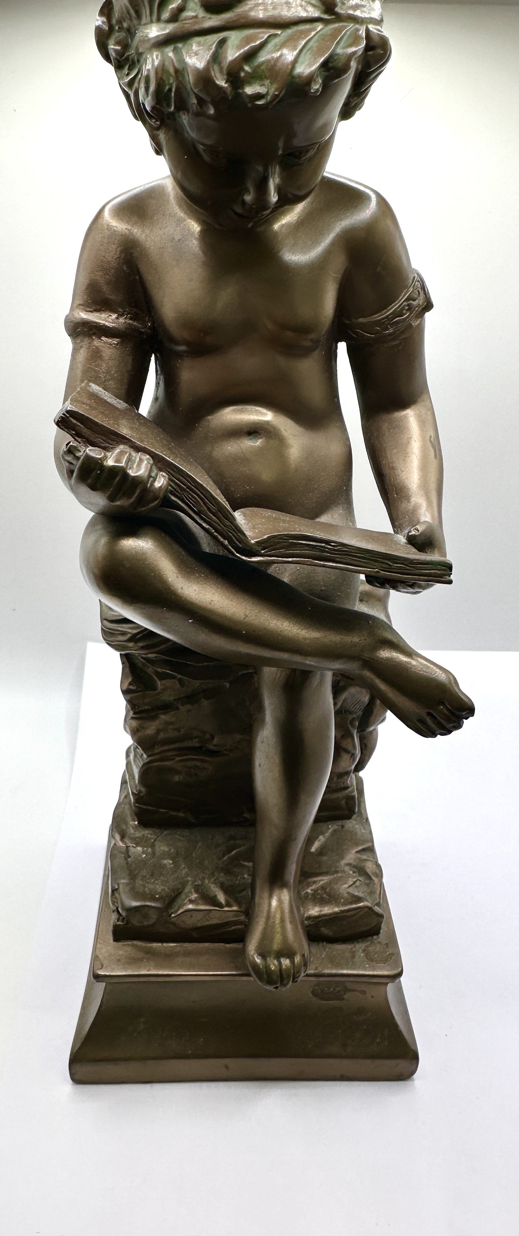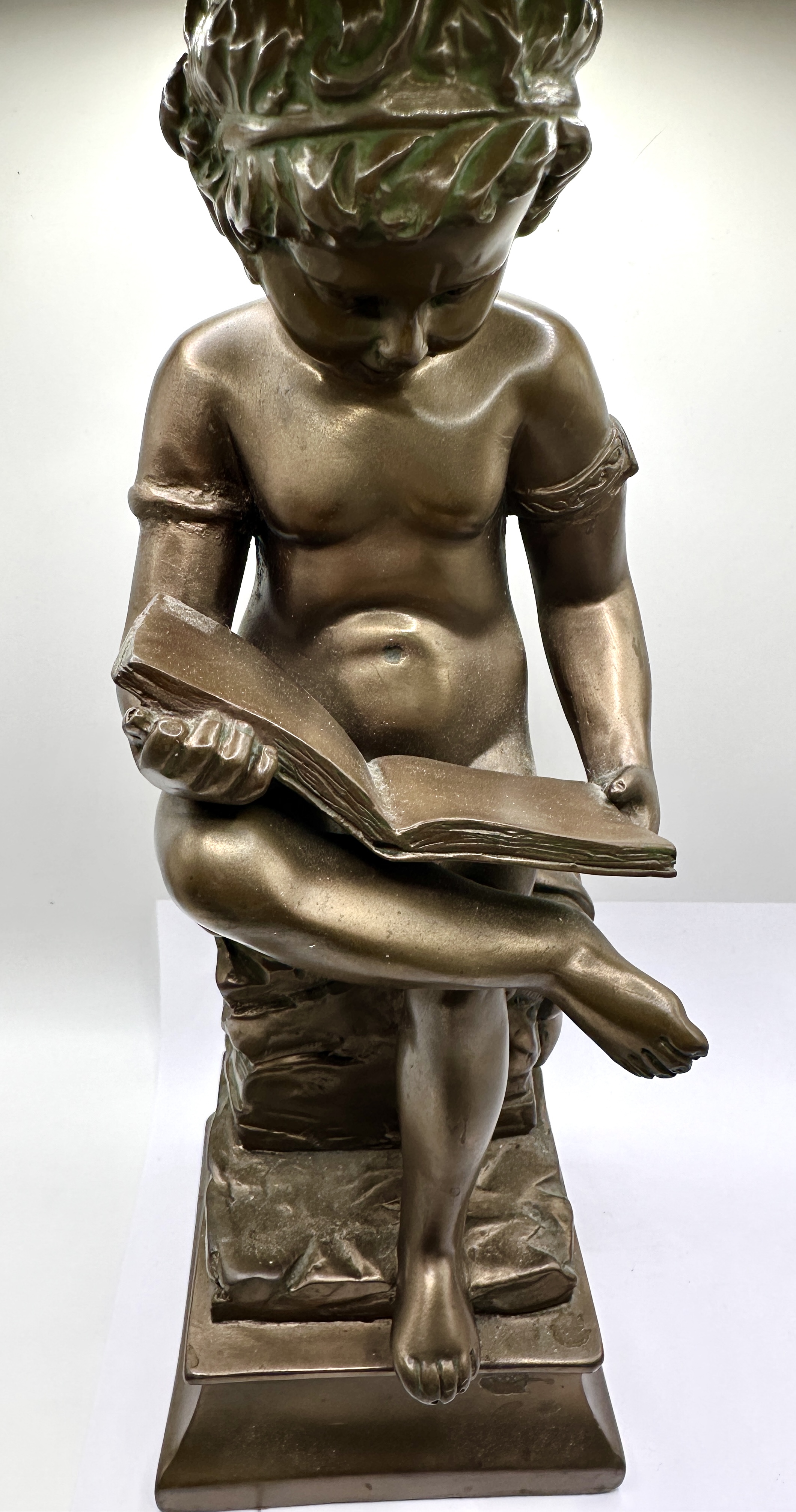 A Neoclassical style patinated metal sculpture, , depicting a seated young boy or putto. The figure is portrayed in a focused pose, reading from an open book held across his crossed legs. The subject is adorned with a leafy wreath upon his head and matching foliate bands on his upper arms. The sculpture is executed with an integral rocky base that sits atop a tiered rectangular plinth with a concave profile. No signatures, foundry marks, or edition numbers are visible on the exterior surfaces. The work is finished with a dark brown patina.