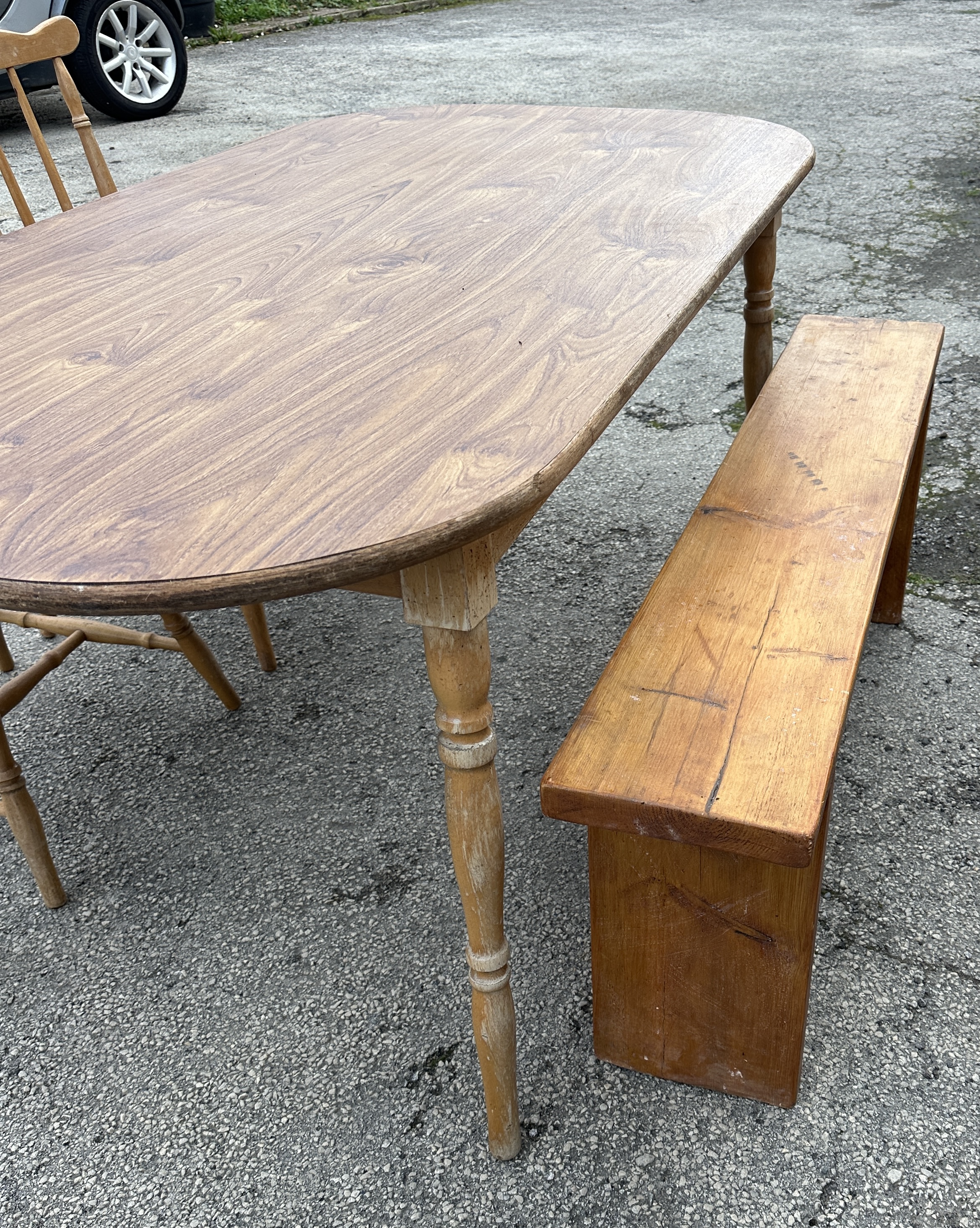The set is in used, fair condition. The table top exhibits wear to the edges and various surface scratches. The table legs show significant wear to the finish, particularly towards the feet, with staining and loss of varnish. The chairs show general surface wear and light scuffing to the legs and stretchers. The bench top has several visible scratches and marks consistent with regular use.