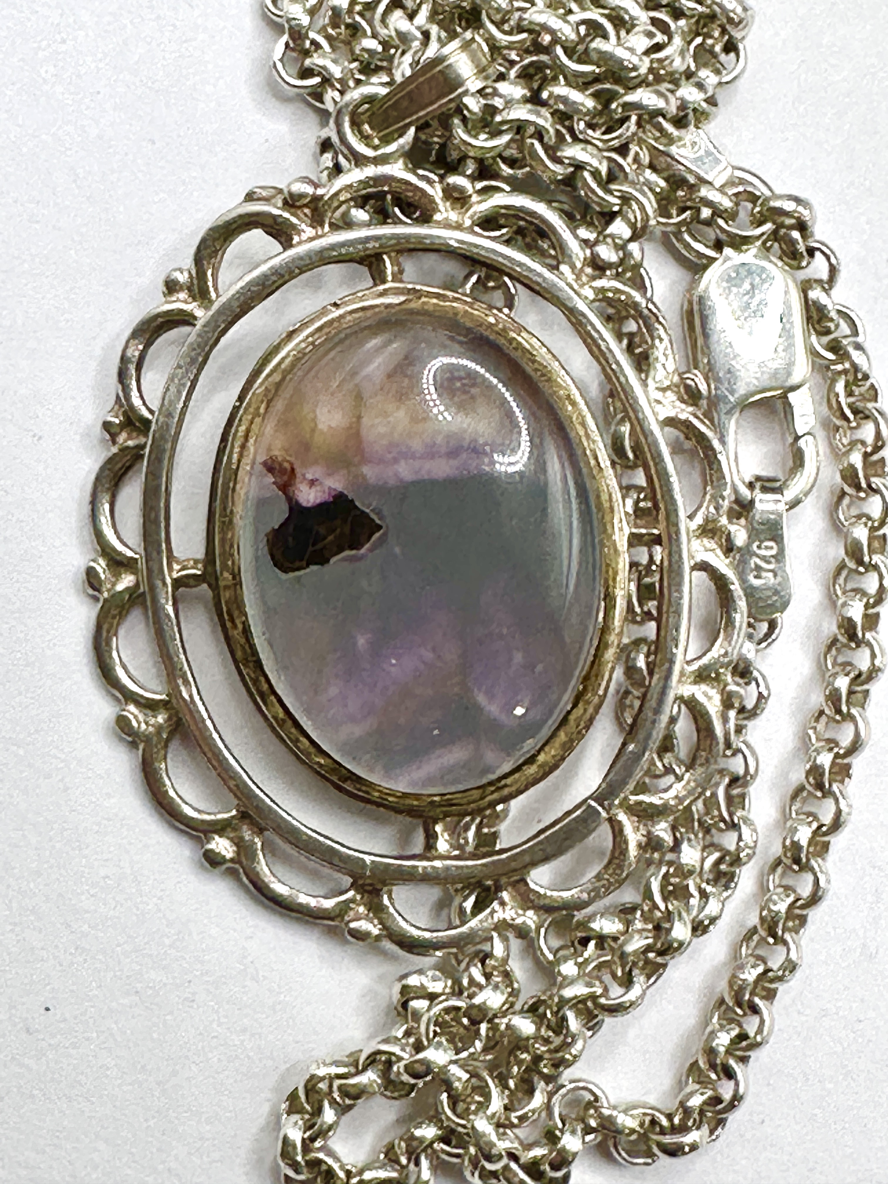 A 925 silver necklace featuring a central oval pendant. The pendant is set with a single oval cabochon Blue John stone, displaying characteristic purple, cream, and translucent banding with dark internal inclusions. The stone is held within a rub-over bezel setting, bordered by a decorative openwork frame with a scalloped and looped design. The pendant is suspended from a silver belcher link chain, which is secured by a lobster claw clasp. The clasp is incised with the mark 925. Blue John is a rare variety of fluorite found exclusively in the Castleton area of Derbyshire, England.