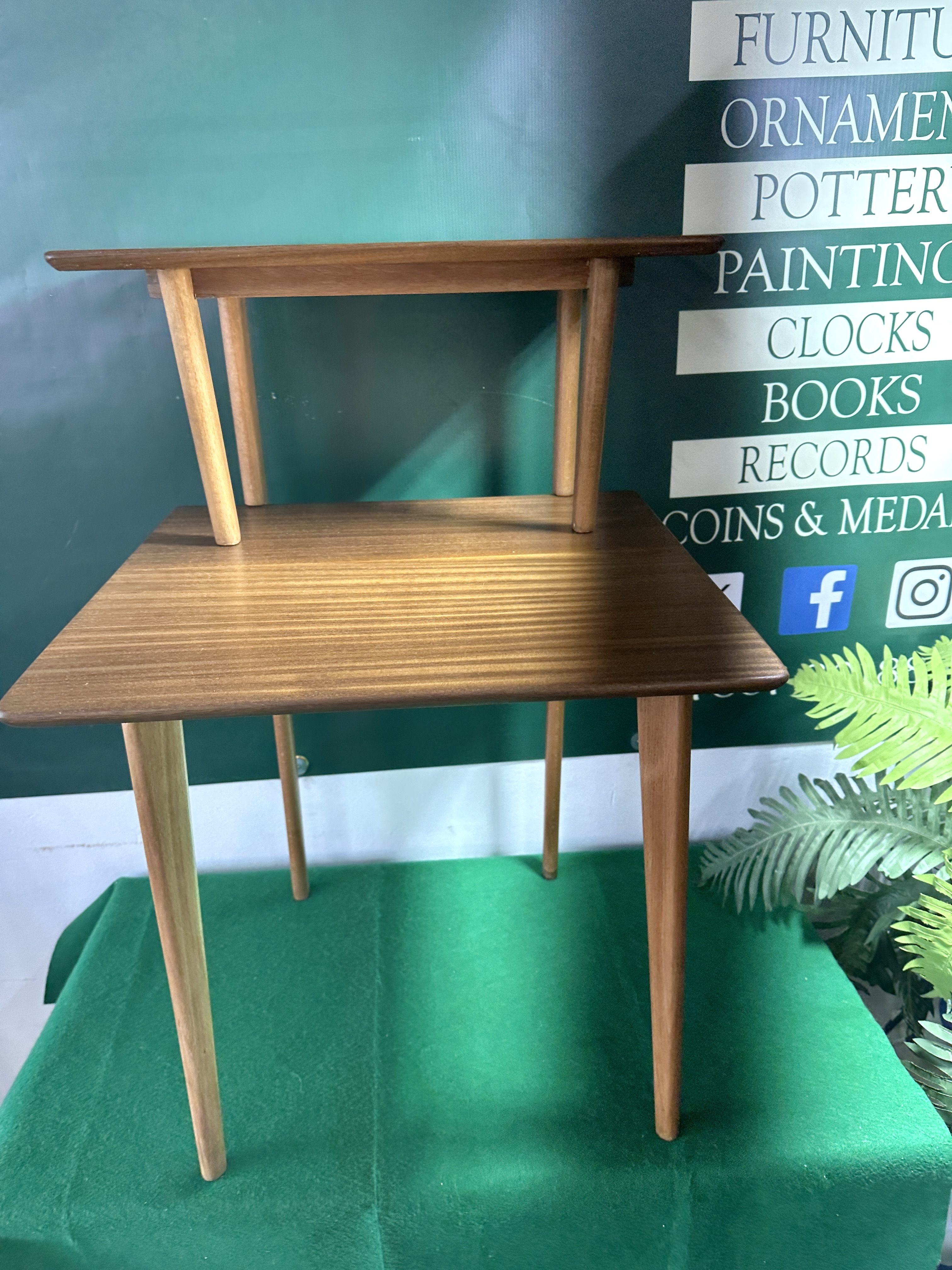 A mid-century modern two-tier side table designed by Peter Hayward for Vanson and manufactured by W.G. Evans and Sons Ltd in the United Kingdom.. The design features two rectangular tiers with rounded corners and edges, with the upper tier being smaller in scale than the lower tier. The upper tier is supported by two angled, out-swept tapered legs that join to the surface of the lower tier. The lower tier is supported by four classic tapered legs. The underside of the frame bears a small black rectangular label with silver-coloured text reading THIS IS A Vanson PRODUCTION.