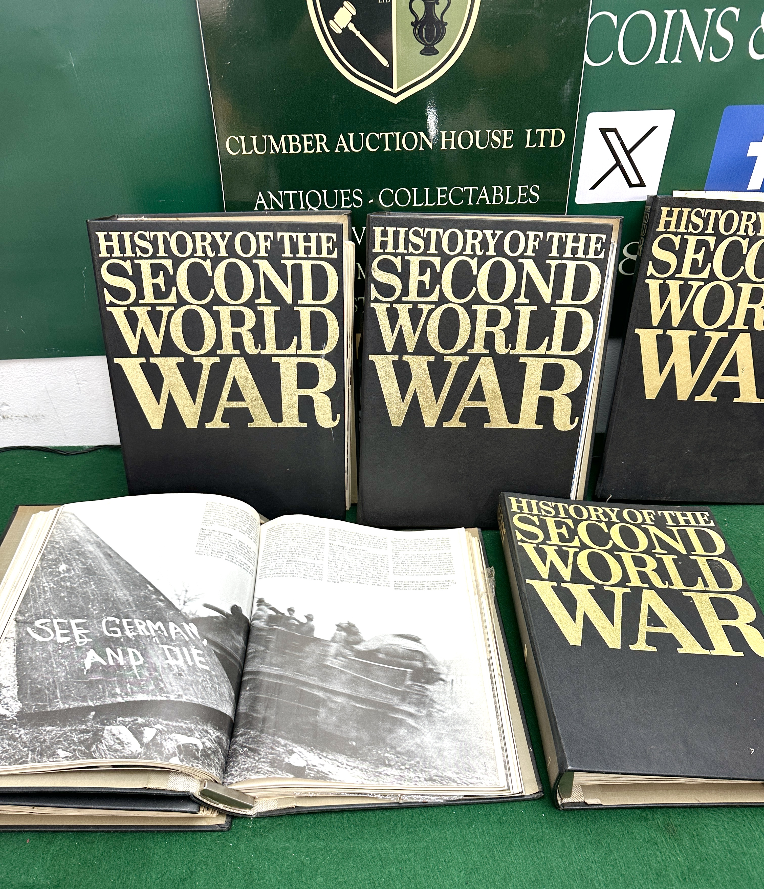 A multi-volume set of Purnell’s History of the Second World War, edited by Captain B.H. Liddell Hart in association with the Imperial War Museum. This collection comprises the bound editions of the weekly partwork magazine series originally published in the late 1960s. The volumes are quarto in format and bound in the publisher’s black cloth or paper-covered boards with large, blocky gilt-effect lettering to the front covers and spines. The work is noted for its comprehensive archival documentation, featuring a profusion of black and white photographs, maps, and tactical diagrams. Internal pages include a double-page spread featuring a concrete structure with the painted slogan SEE GERMAN AND DIE. The spines bear the publisher’s name, PURNELL’S, at the head followed by the title.