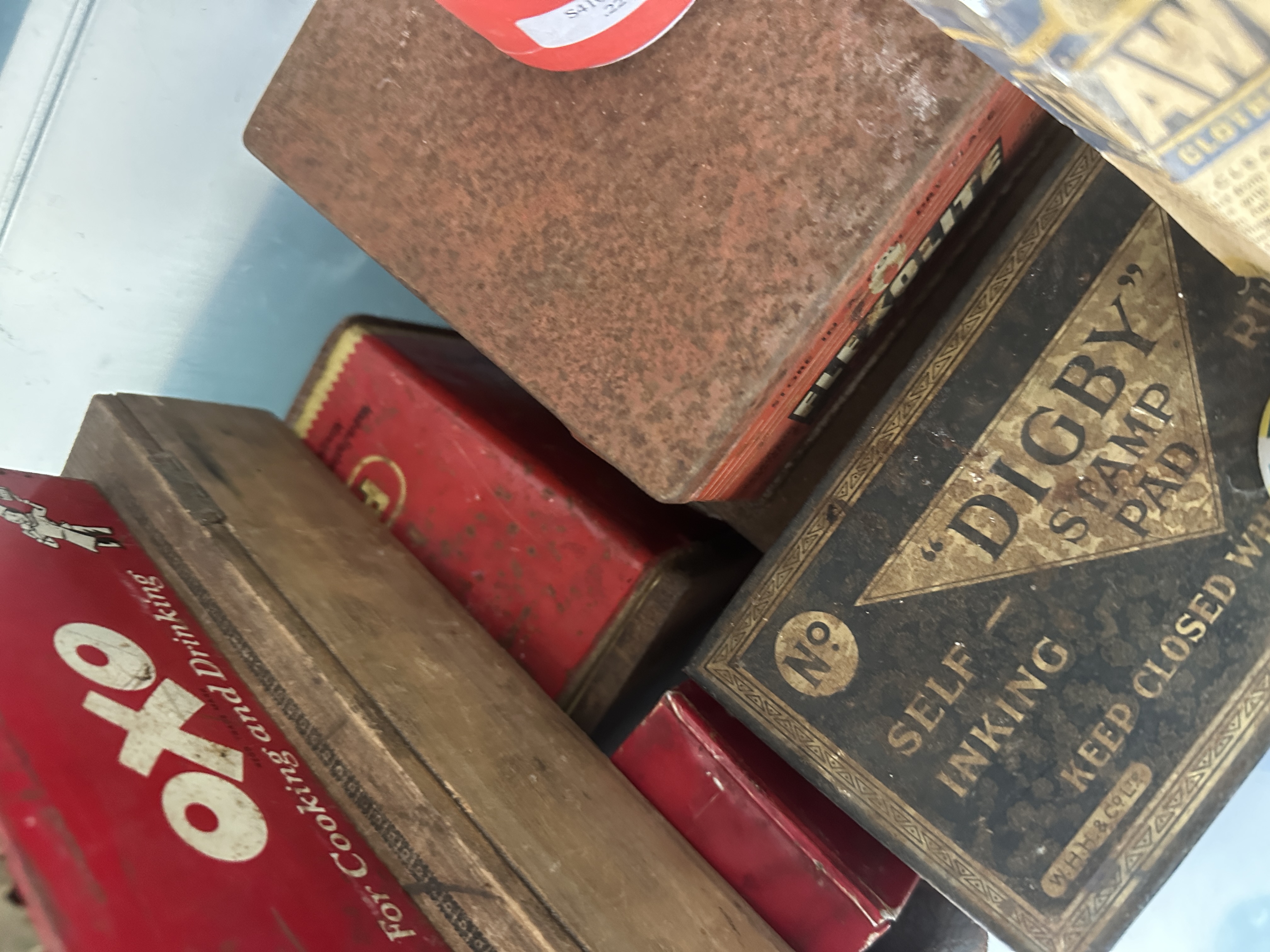 Items show varying degrees of age-related wear. Significant corrosion is present on the Gun Gum tin, with general surface oxidation and scuffing across other metal containers. Cardboard packaging displays edge wear, soiling, and minor structural deformation. The wooden box shows surface staining and abrasions.