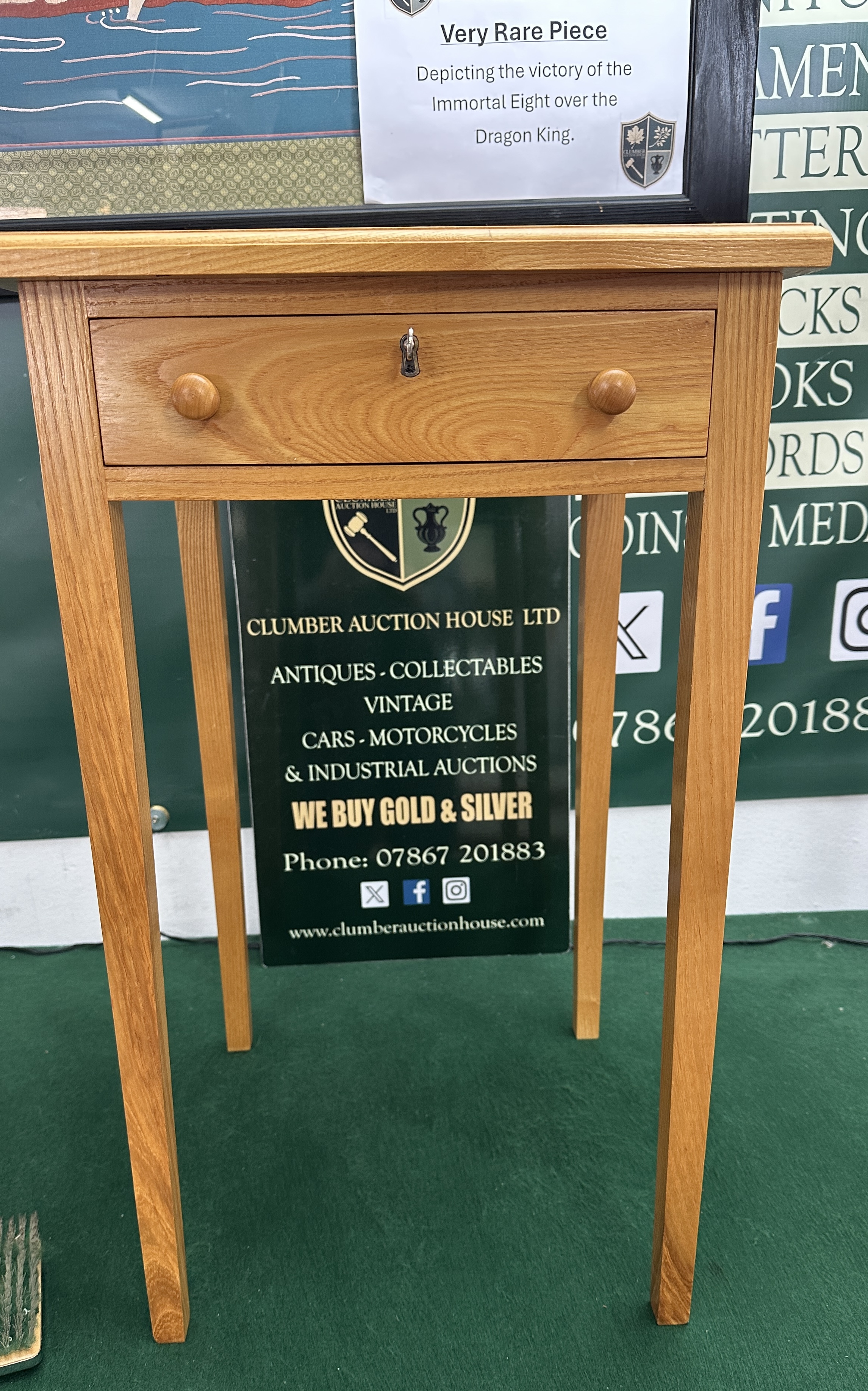 A contemporary side table of solid oak construction, designed in a minimalist Shaker style. The rectangular top features square edges above a single frieze drawer. The drawer construction features exposed dovetail joints at the front corners and is fitted with two turned wooden knob handles and a central keyhole with a metal escutcheon. A key is present. The table is supported by four slender, square-section legs that taper towards the floor. The piece is finished in a light, natural oak colour. No maker’s marks or labels are visible on the exterior or the drawer sides.