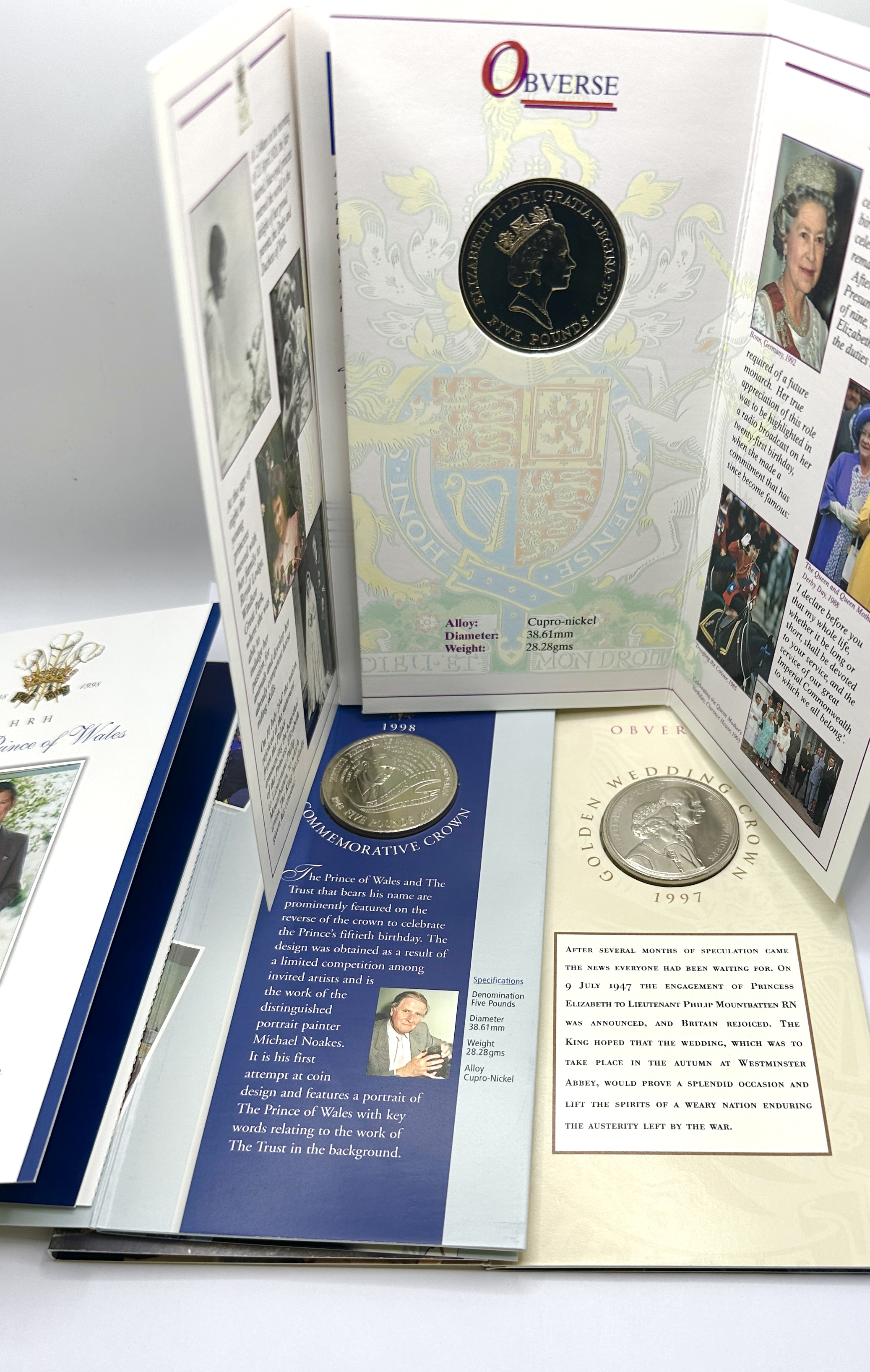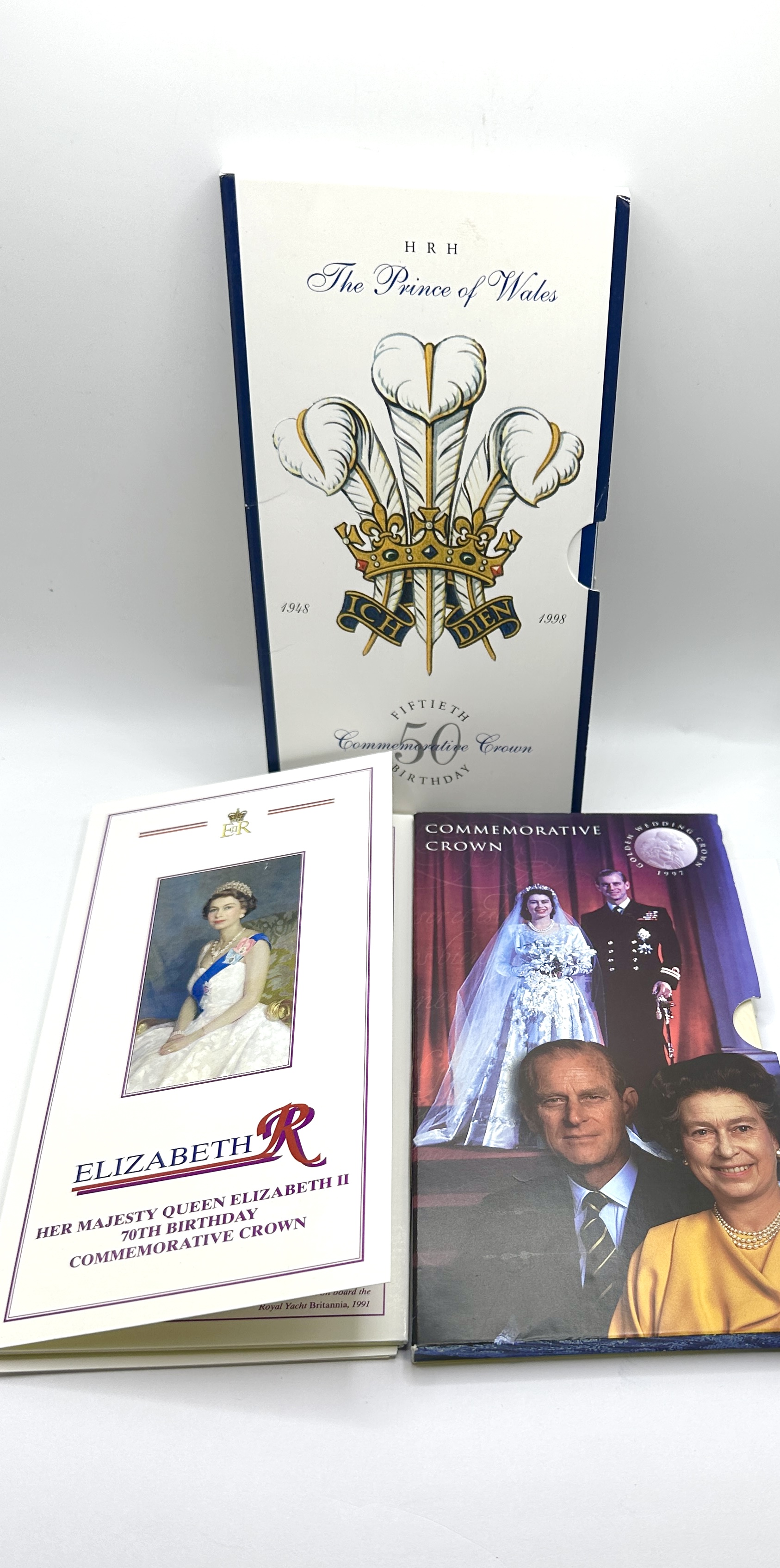 A trio of Royal Mint commemorative five-pound crown coins in their original illustrated card presentation folders. The collection includes a 1996 crown commemorating the 70th birthday of Queen Elizabeth II, a 1997 Golden Wedding Anniversary crown, and a 1998 crown commemorating the 50th birthday of HRH The Prince of Wales. The 1996 issue features the obverse legend ELIZABETH II DEI GRATIA REGINA F D, which translates as Elizabeth II by the Grace of God Queen, Defender of the Faith. The 1997 issue features the dual portraits of the Queen and Prince Philip on the reverse. The 1998 issue features a reverse portrait of the Prince of Wales by Michael Noakes. These crowns were issued by the Royal Mint to commemorate significant royal anniversaries and birthdays.