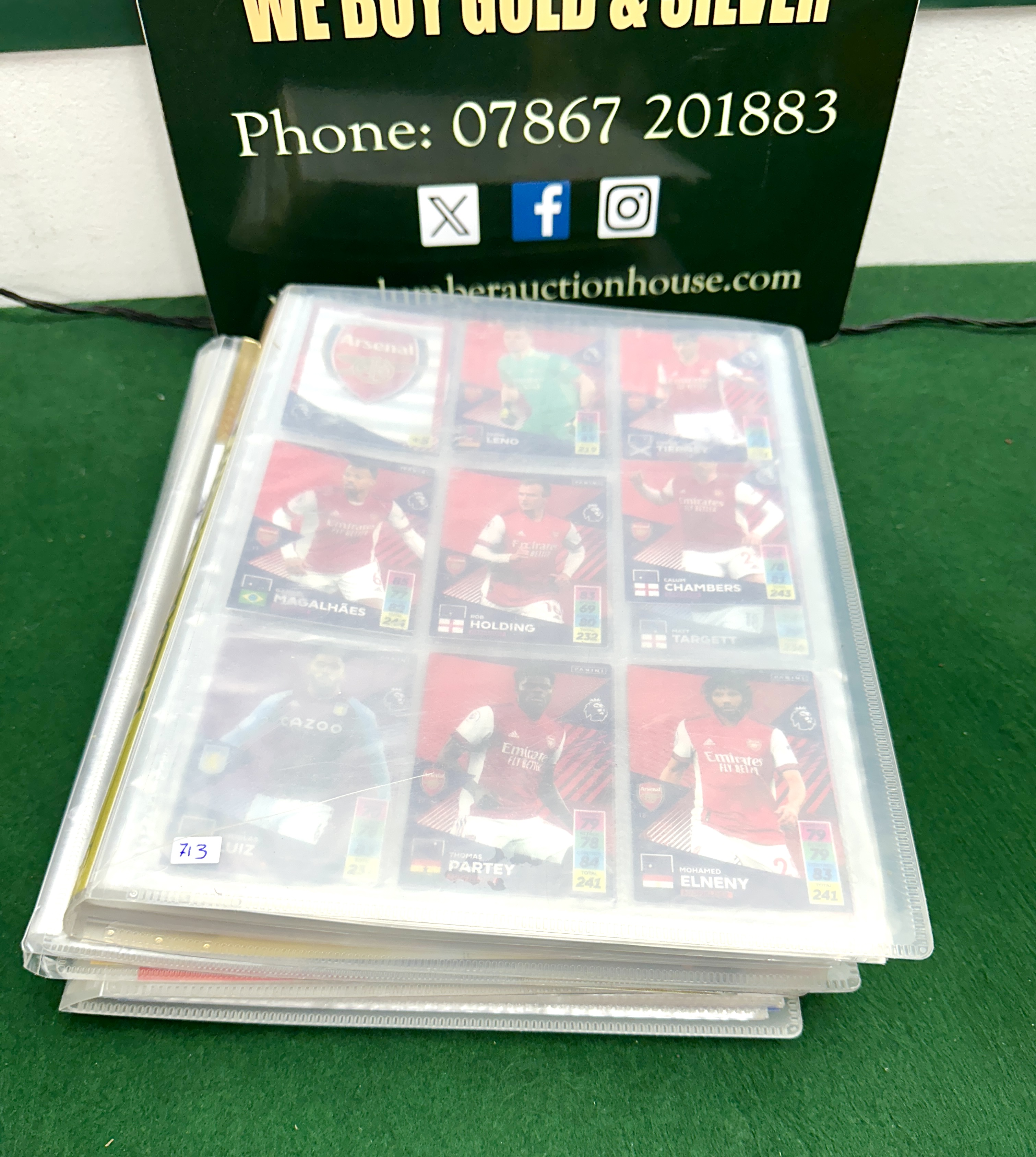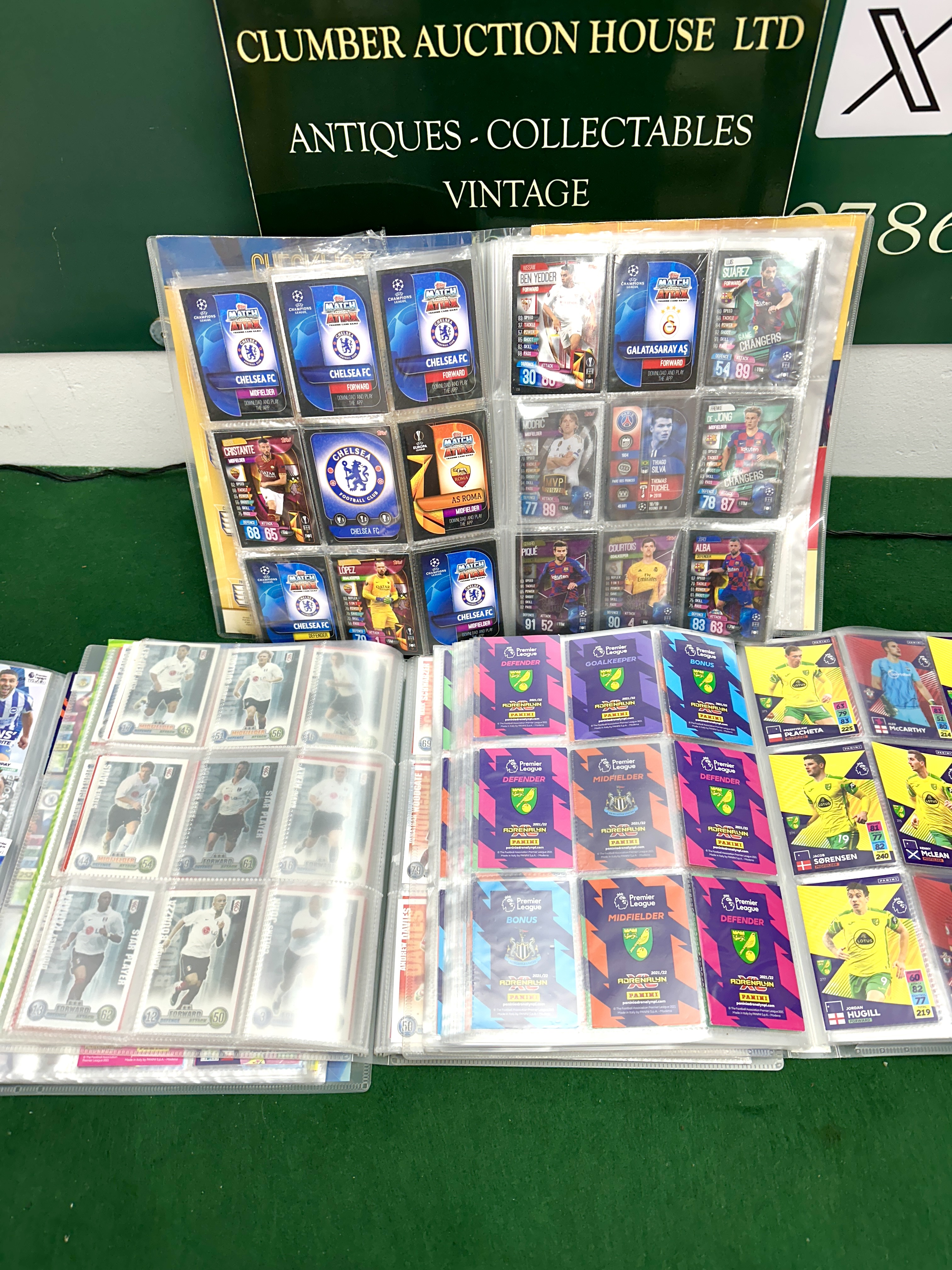 This lot comprises a large collection of football trading cards, primarily from the Topps Match Attax and Panini Adrenalyn XL series, spanning multiple seasons. The collection is organised within several dedicated collector binders and loose plastic pocket sheets. Key components include the Topps Match Attax Barclays Premier League 2007/2008 series featuring Fulham FC players such as Clint Dempsey (17), Jimmy Bullard (51), Simon Davies (46), Steven Davis (44), David Healy (16), Hameur Bouazza (12), and Collins John (3), alongside Star Player cards for Brian McBride (9) and Diomansy Kamara (13). Also included are cards from the Topps Match Attax 2019/2020 season and UEFA Champions and Europa League sets, featuring Ben Yedder, a holographic Game Changer Luis Suárez, a holographic MVP Luka Modrić, Gerard Piqué, and Thibaut Courtois. A significant portion of the collection consists of Panini Adrenalyn XL Premier League 2021/2022 cards, with subsets for Arsenal (Magalhães, Holding, Chambers, Targett, Partey, Elneny), Norwich City (Płacheta, Sørensen, Hernández, Hugill), Leeds United (Kalvin Phillips, Mateusz Klich), Everton (André Gomes, Alex Iwobi), and Southampton (Alex McCarthy, Jan Bed.