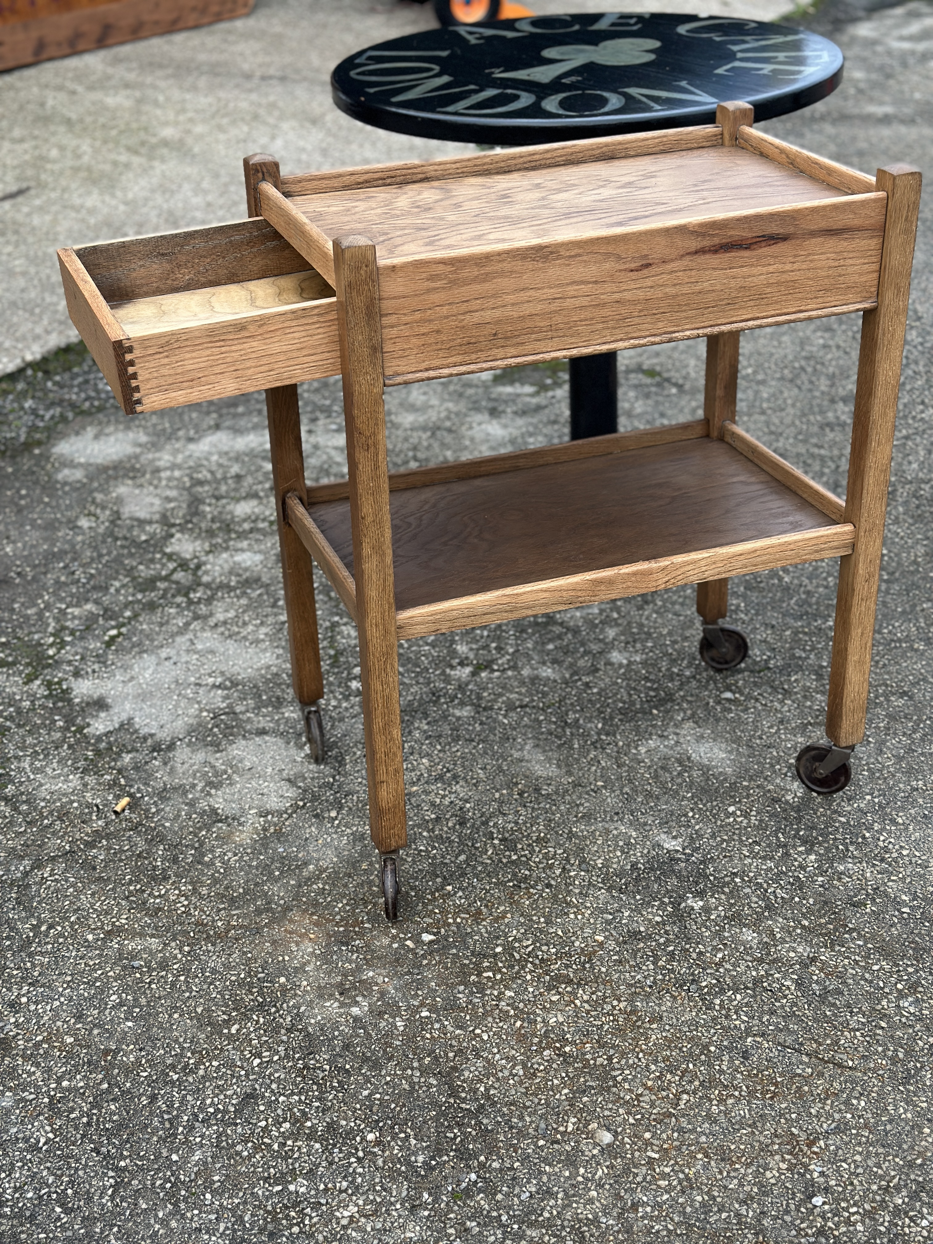 A mid-20th century oak tea or hostess trolley of rectangular form. The top tier features a raised gallery edge to three sides, positioned above a single full-width drawer. The drawer is of finger-jointed construction and is designed to pull out from the side. Below is a fixed rectangular undershelf. The structure is supported by four straight, square-section legs, each terminating in metal and rubber swivelling castors. The oak displays a light finish with a prominent grain. No maker’s marks or labels are visible on the exterior or the interior of the drawer. The design is in the style of the Cotswold School.