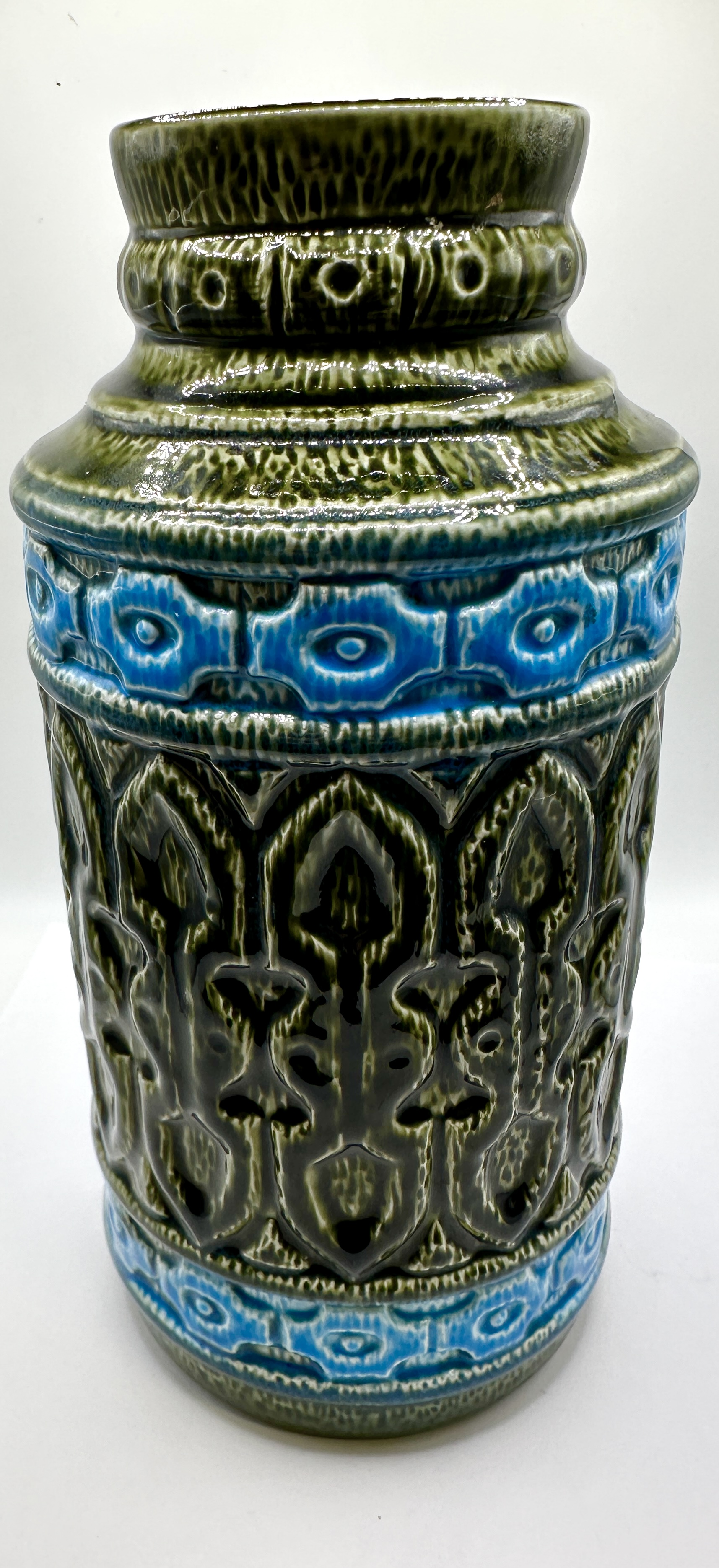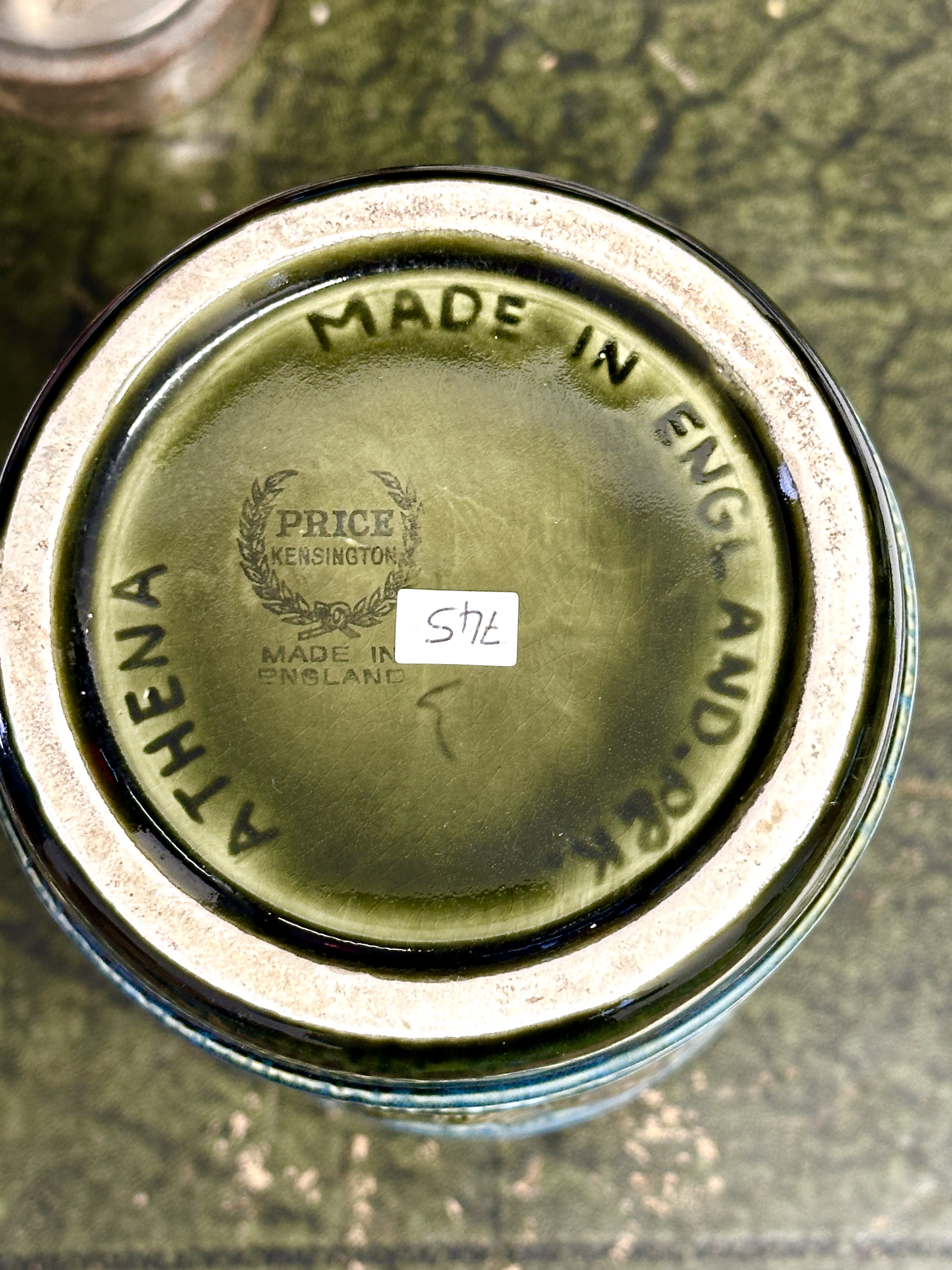 A Price and Kensington ceramic vase of cylindrical form featuring a stepped shoulder and ribbed neck. The exterior is decorated with relief-molded patterns, including a central frieze of repeating gothic-style arched motifs in an olive green glaze, bordered by two horizontal bands of geometric oval designs in turquoise blue. The piece is finished in a high-gloss variegated glaze. The base is marked with embossed circular text reading MADE IN ENGLAND, P&K, and ATHENA. It also features a black printed factory mark with a laurel wreath enclosing the words PRICE and KENSINGTON above the words MADE IN ENGLAND. An incised numeral 7 or hook mark is present on the underside.