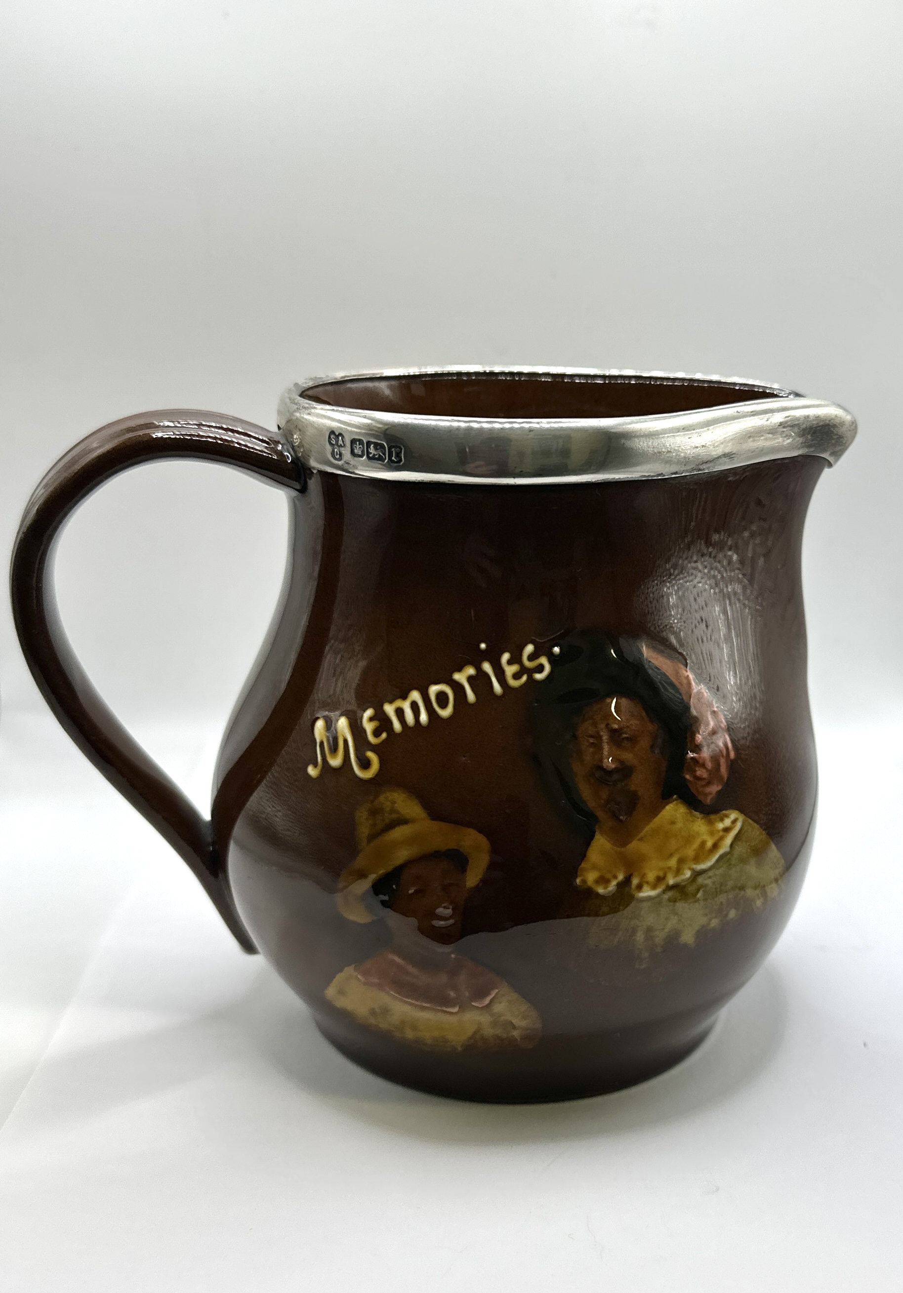 A Royal Doulton Kingsware earthenware jug in the Memories pattern, featuring a dark brown treacle glaze. The bulbous body is decorated with relief-moulded sprigged figures in period dress beneath the word Memories rendered in yellow slip-trailed script. The vessel is designed with a pinched pouring spout and a single loop handle. The rim is fitted with a sterling silver mount bearing British hallmarks. These marks include the maker’s mark SA over C for Saunders and Shepherd (Cornelius Desormeaux Saunders and James Francis Hollings Shepherd), the anchor for the Birmingham Assay Office, the lion passant for sterling silver, and the lowercase date letter r for 1916.