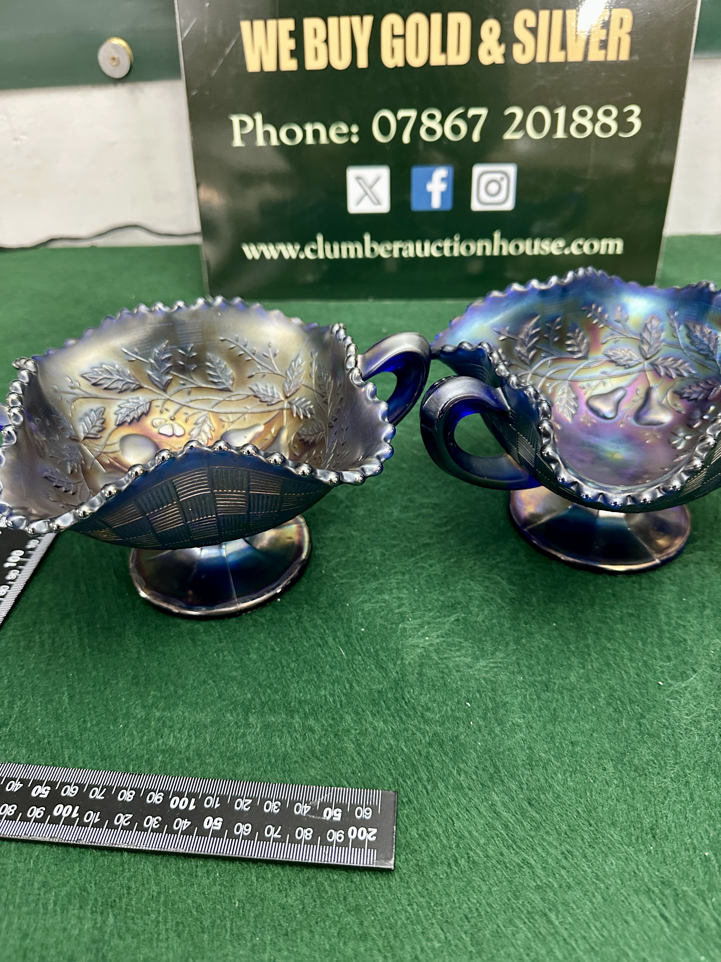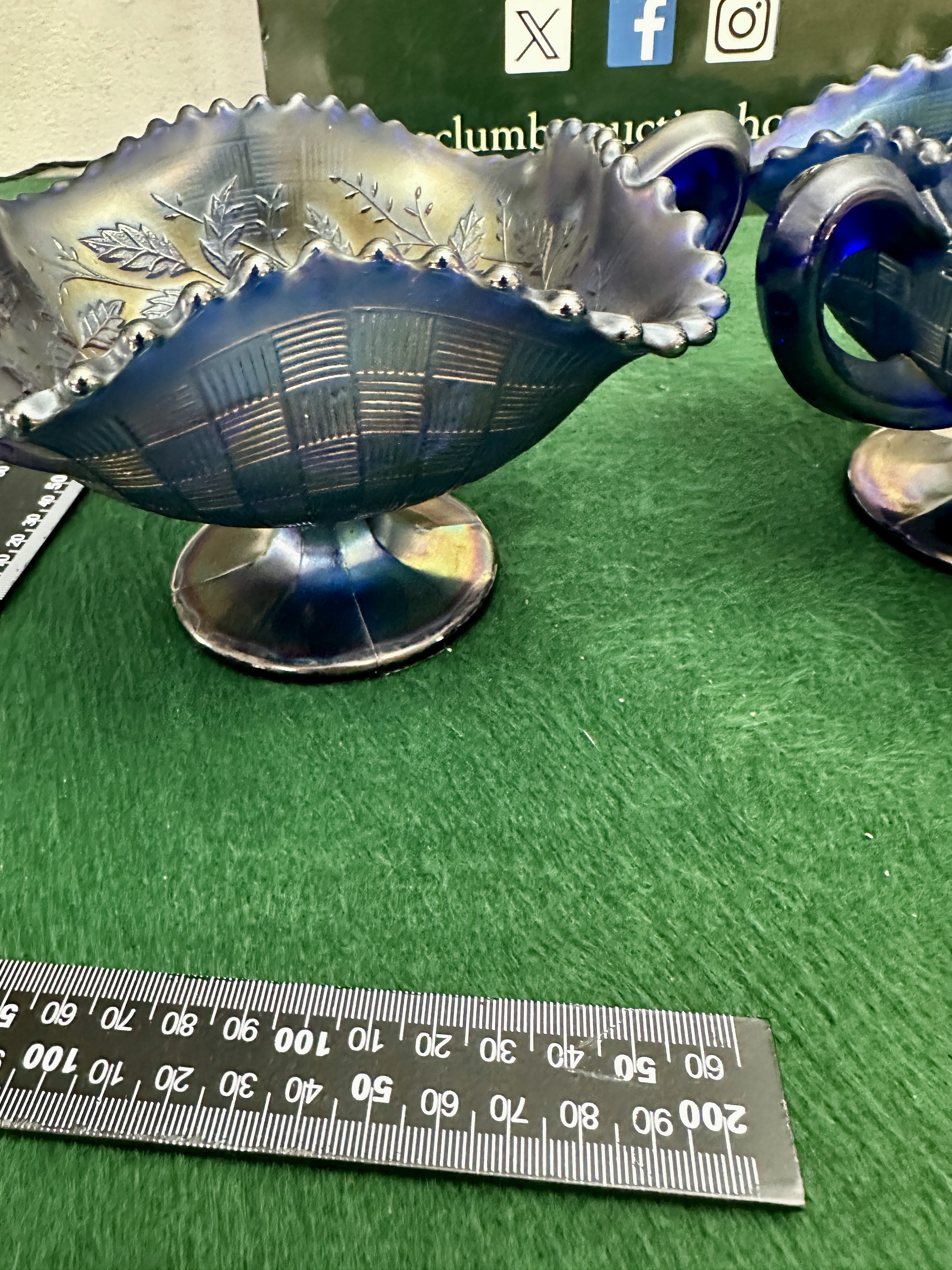 A pair of pressed carnival glass bonbon dishes, also referred to as nappies, featuring a cobalt blue base glass treated with a heavy iridescent finish. The interior of each dish is decorated in high relief with the Fruits and Flowers pattern, specifically depicting three pears centred among serrated leaves and small blossoms. The exterior of the bowls features a detailed moulded basketweave or lattice design. Each vessel is formed with a single applied loop handle and a deeply ruffled rim with beaded edging, all supported by a low flared circular pedestal foot. This specific combination of the interior fruit motif and exterior basketweave is characteristic of production by the Northwood Glass Company circa 1910-1920, although no maker marks are visible on these examples.