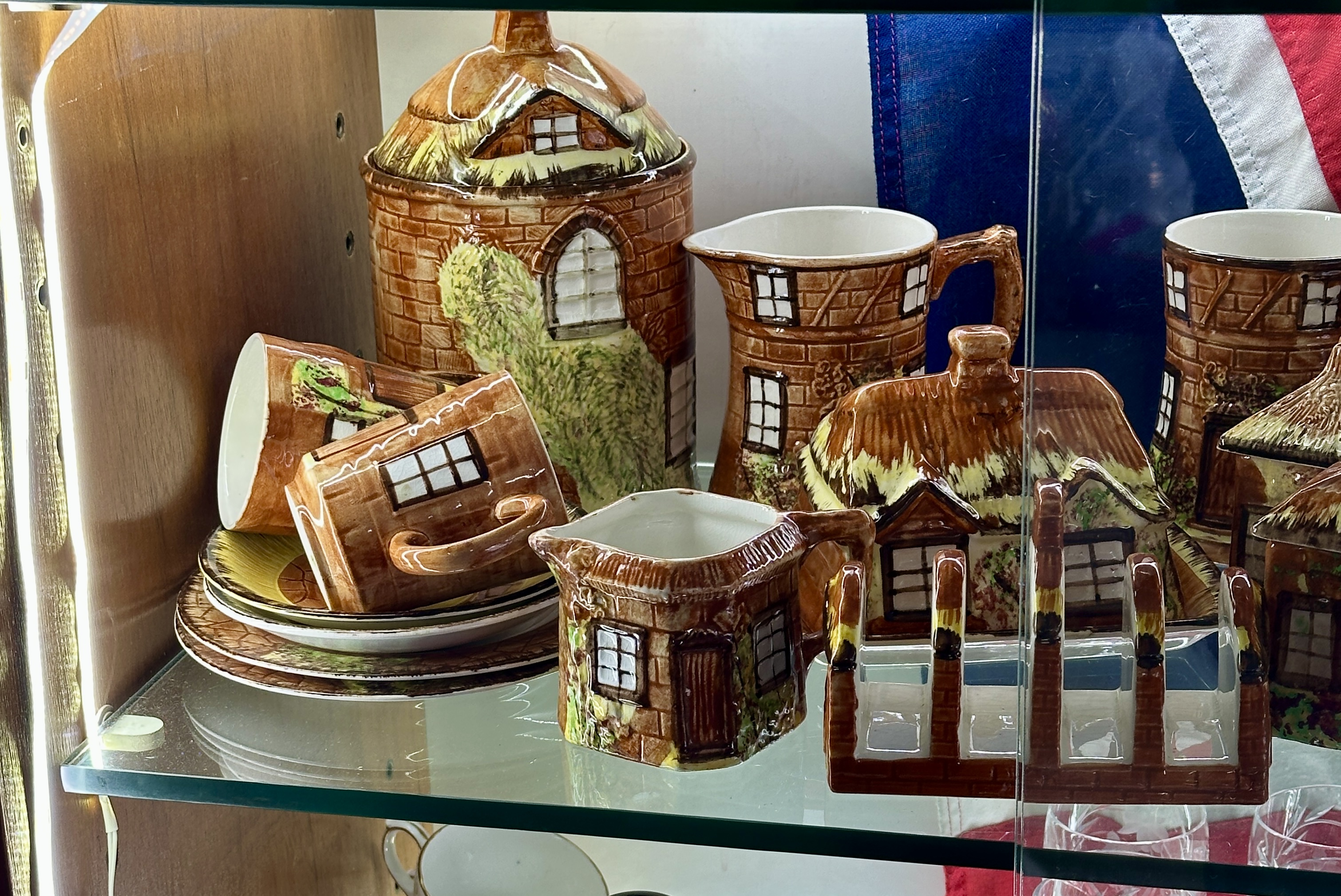 This collection of glazed earthenware is characteristic of the cottage ware style produced in the United Kingdom during the mid-20th century, specifically resembling the designs of Price Kensington. The assortment features various domestic and decorative items modelled as traditional thatched cottages, including teapots with thatched-roof lids, a tall cylindrical biscuit barrel, a water jug, a milk jug, and a set of egg cups on a rectangular tray. Also included are a toast rack with cottage dividers, a three-piece condiment set, lidded preserve jars, a butter dish, and several drinking vessels such as mugs, tea cups, and saucers. A novelty table bell completes the group. Each piece displays moulded architectural details including brickwork and windows, finished with hand-painted underglaze decoration in a palette of brown, yellow, and green with floral accents. No factory marks are visible on the bases.