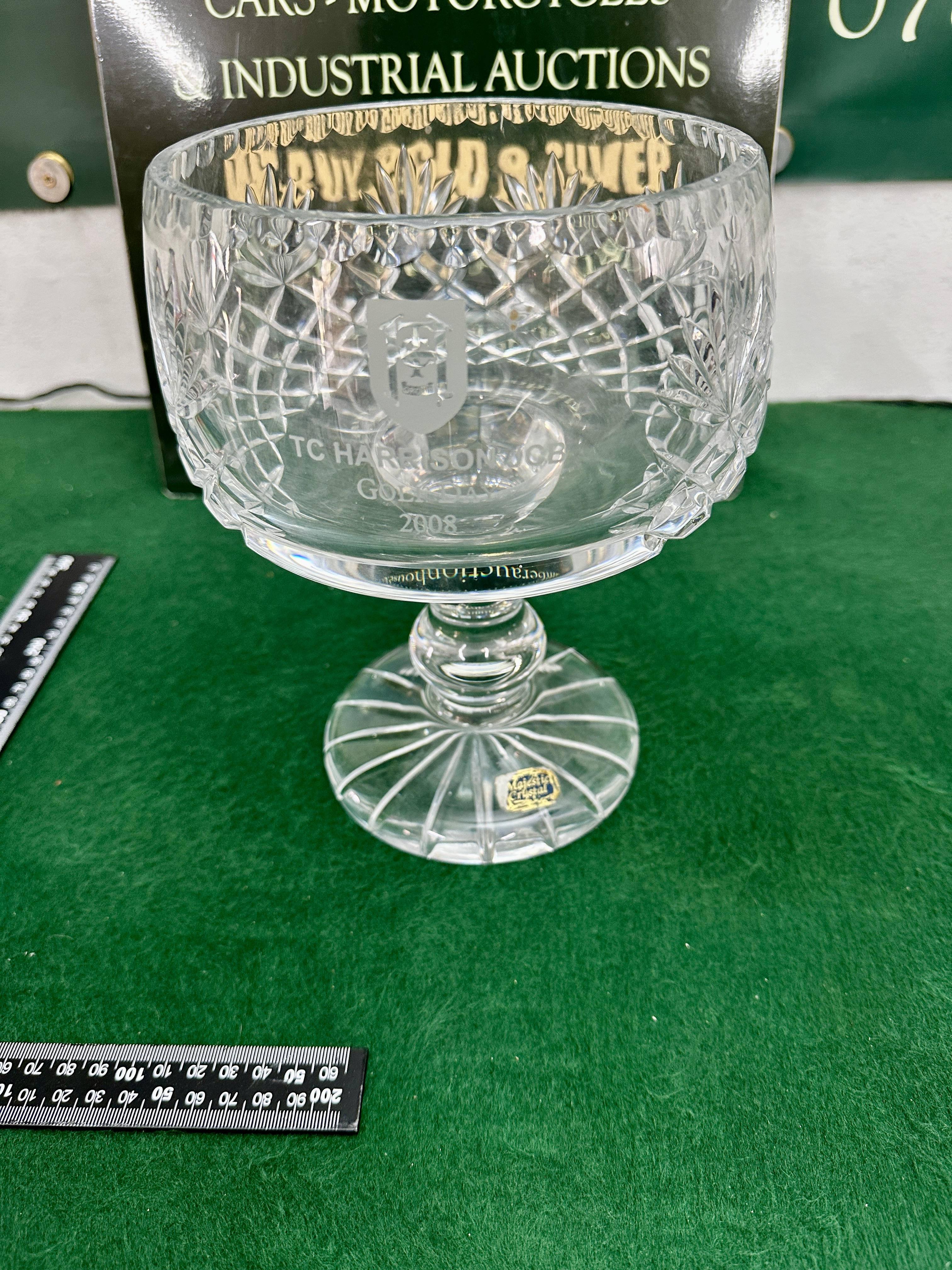 The item is in good condition with no visible chips, cracks, or repairs. The crystal retains high clarity. The etched inscription and crest are crisp and well-defined. The manufacturer label is present, showing only minor lifting at the edges.