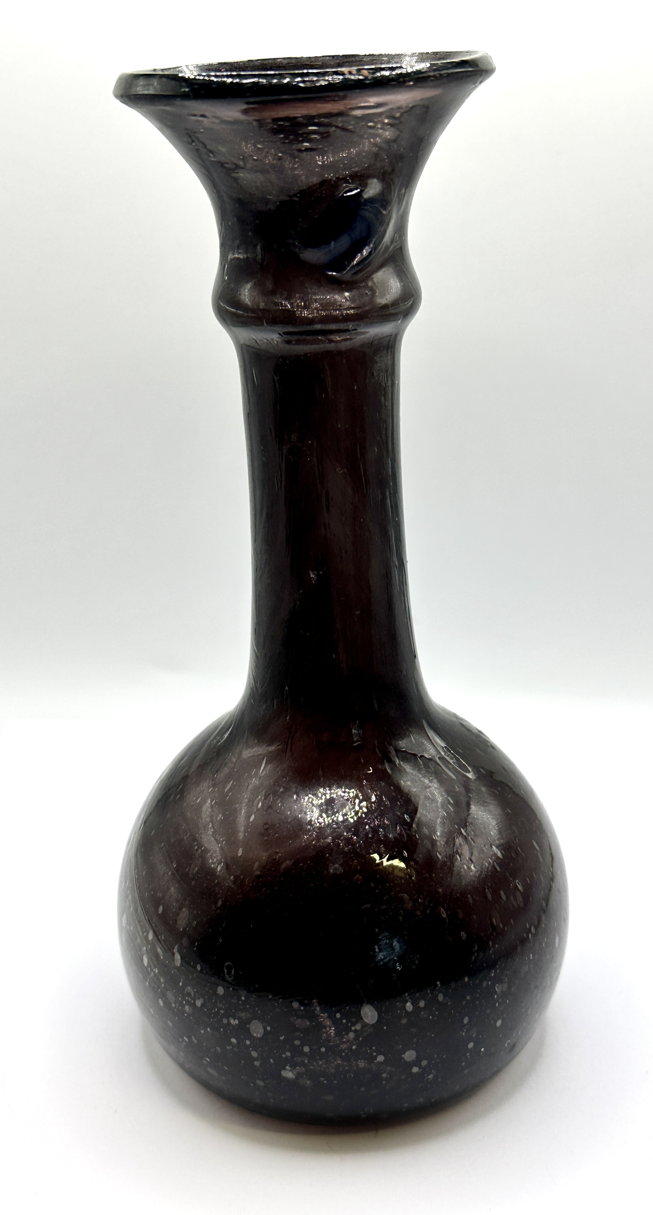 A hand-blown art glass vase of bottle form, featuring a bulbous, onion-shaped body transitioning into a long, cylindrical neck. The neck is accented with a single raised collar or ring toward the top, terminating in a wide, trumpet-flared rim. The vessel is crafted from deep amethyst glass, which appears nearly opaque in thicker sections. It features a dense internal decoration of white and grey speckled inclusions throughout the body, creating a mottled or galaxy-like effect. This decorative technique is most prominent on the lower half of the vessel. The irregular distribution of the speckling and the presence of small internal air bubbles, known as seeds, indicate a hand-blown manufacturing process. The piece is unattributed, as no maker marks or signatures are visible, though it is stylistically consistent with mid-century modern studio glass, potentially of British or Murano origin.
