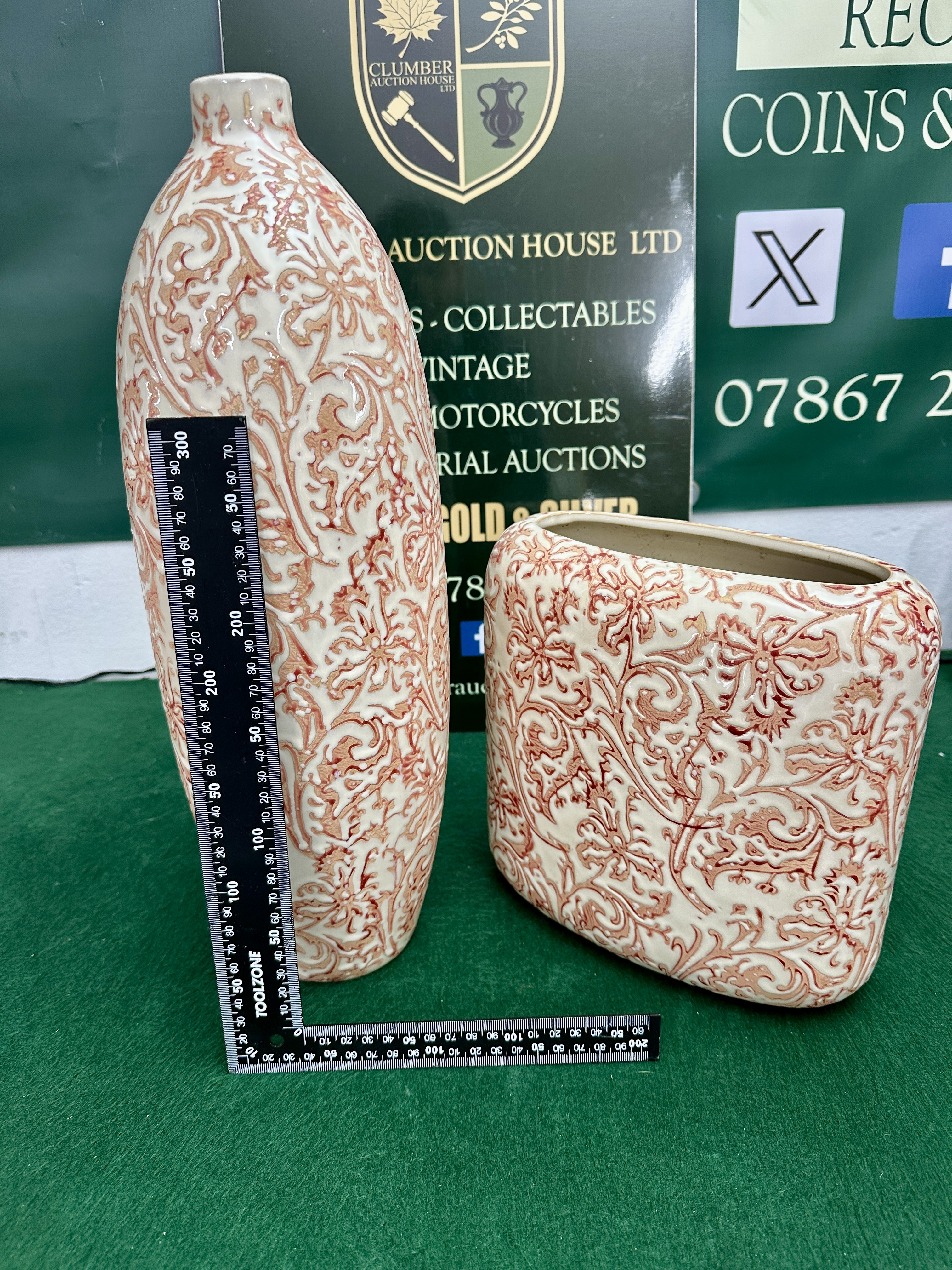 A pair of contemporary ceramic vases from the Eleanor collection by Accent Decor. The lot comprises two distinct forms: one tall, slender ovoid vase with a narrow neck and one shorter, rectangular pillow-form vase with rounded corners and a wide oval aperture. Both pieces are constructed from earthenware with a cream-coloured glazed ground. The exterior surfaces are decorated with an all-over raised relief pattern of scrolling foliage, damask-style motifs, and flowers in a chinoiserie style. This molded design is highlighted with a reddish-brown or coral-toned pigment that has been wiped over the surface to settle within the recesses, creating a distressed aesthetic. No maker marks or signatures are visible on the exterior of the items.