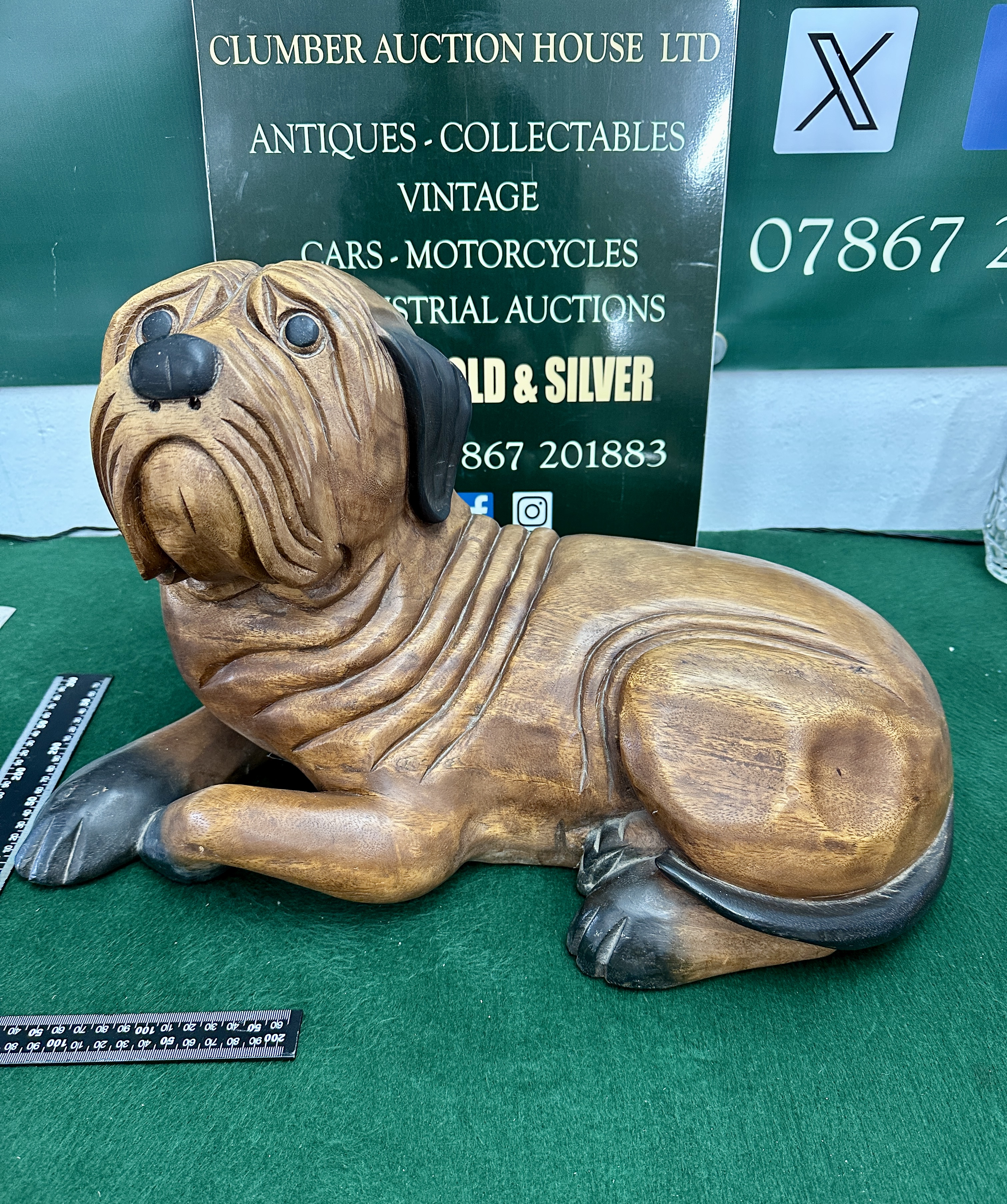 A large hand-carved wooden sculpture of a recumbent dog, possibly a Mastiff or Bloodhound. The figure is carved from a single block of hardwood and features stylised deep skin folds and heavy features. The dog is depicted in a resting pose with its head turned slightly upwards. The piece is finished with a warm brown stain highlighting the natural wood grain, with dark-stained or painted accents to the eyes, nose, ears, and paws. No maker marks or signatures are visible on the base or body.
