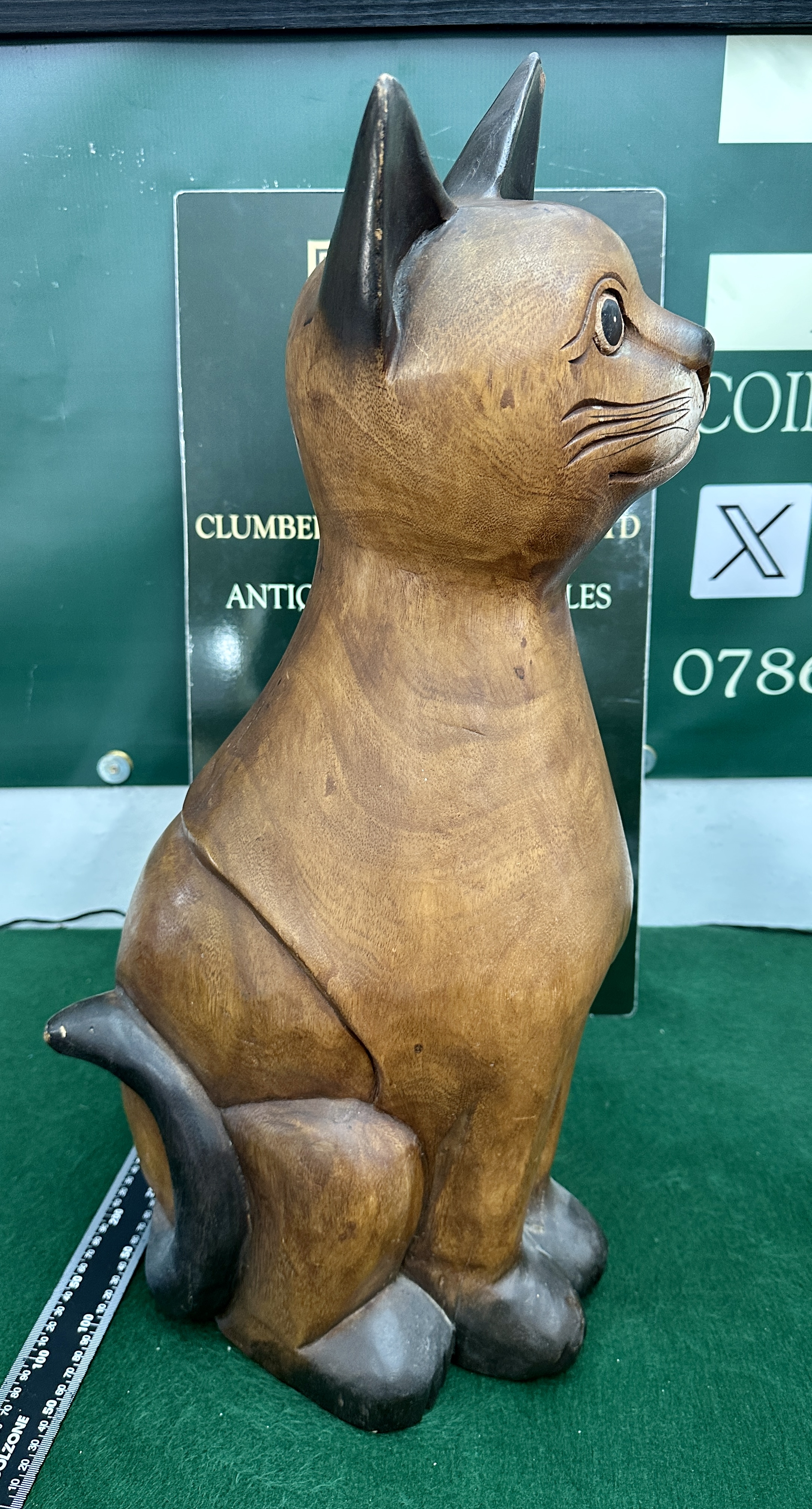 A large hand-carved wooden sculpture depicting a stylised cat in an upright seated position. The figure is constructed from wood with a visible natural grain, finished in a honey-toned stain with contrasting dark brown pigment applied to the ears, eyes, nose, whisker area, paws, and tail. The facial features include large circular eyes and incised lines for whiskers. The tail is carved in relief and curled against the right side of the body.