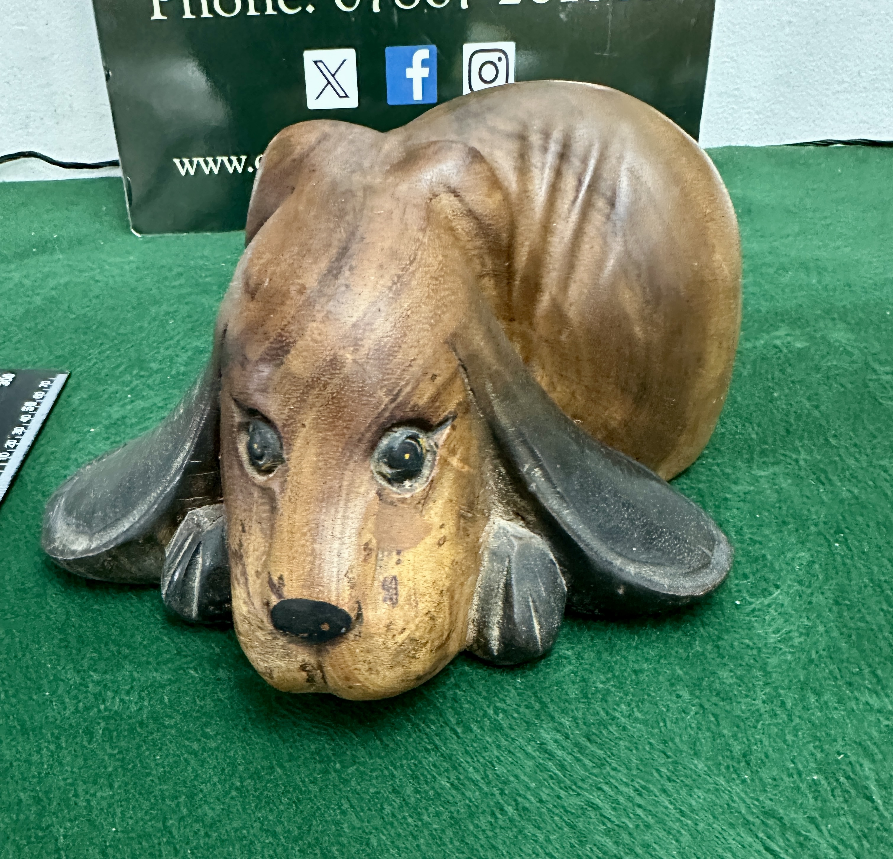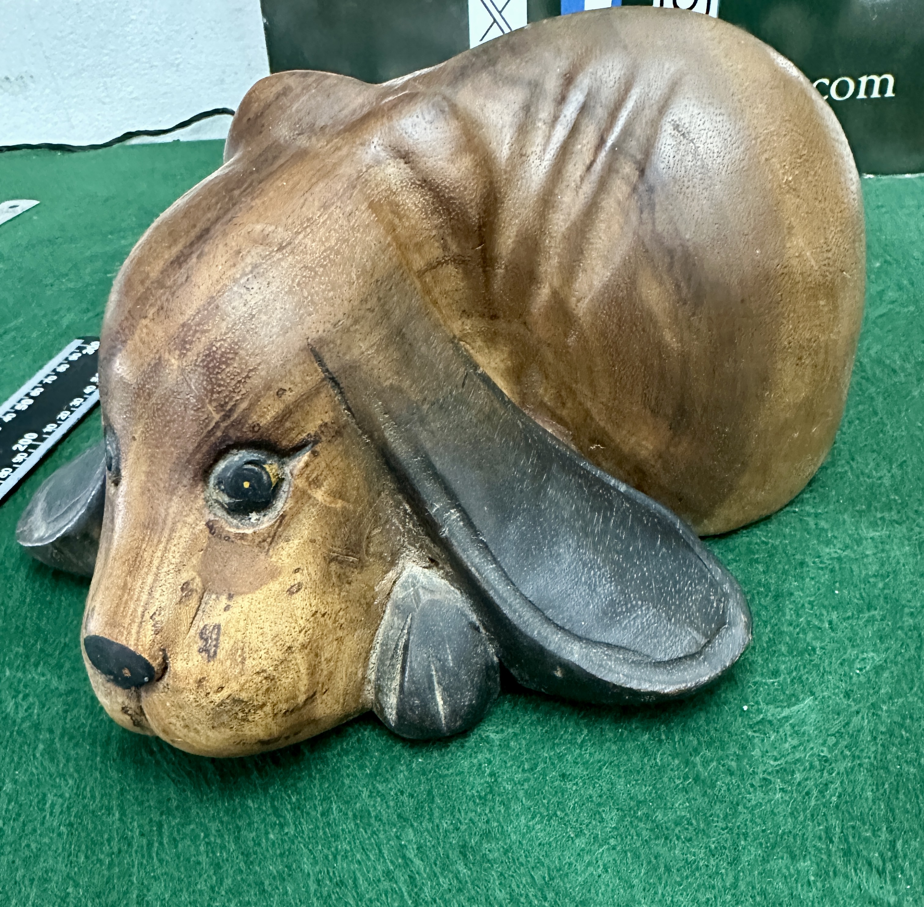 A hand-carved wooden decorative figure depicting a stylized hound dog, likely a basset hound or bloodhound, in a lying position with its head resting on its paws. The piece is carved from a single block of wood, displaying natural grain patterns throughout the body. It features exaggerated anatomical details including long, heavy ears and carved ridges along the back to represent skin folds. The ears and paws are finished with a dark stain, while the face and body retain a lighter wood tone. The eyes are hand-painted with yellow and black pigments, and the nose is finished in black. No maker’s marks or signatures are present.