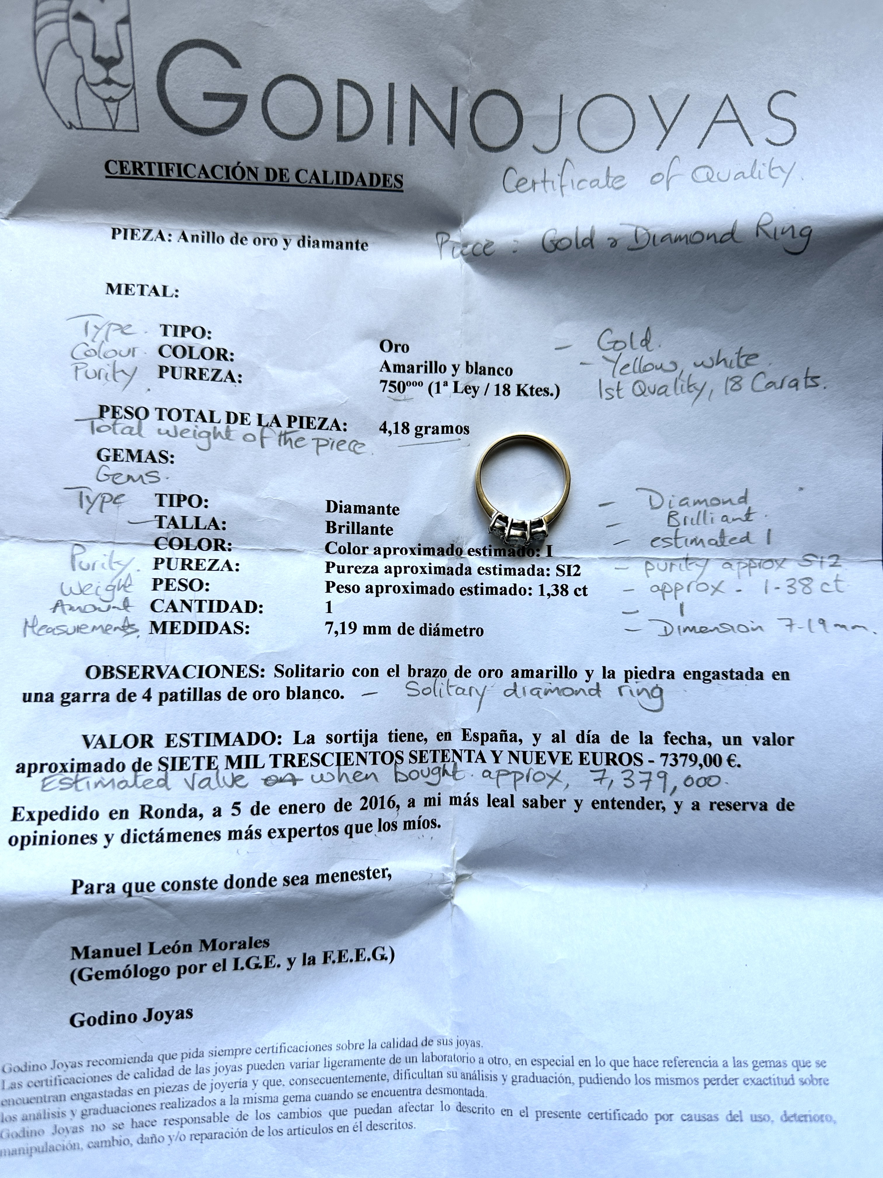 The ring is accompanied by a Spanish Certificación de Calidades from Godino Joyas, Ronda, dated 5th January 2016. The certificate identifies the metal as 18 carat gold (750/1000). It provides estimated qualities for the central stone, including a weight of 1.38 carats, a diameter of approximately 7.19mm, colour I, and clarity SI2.