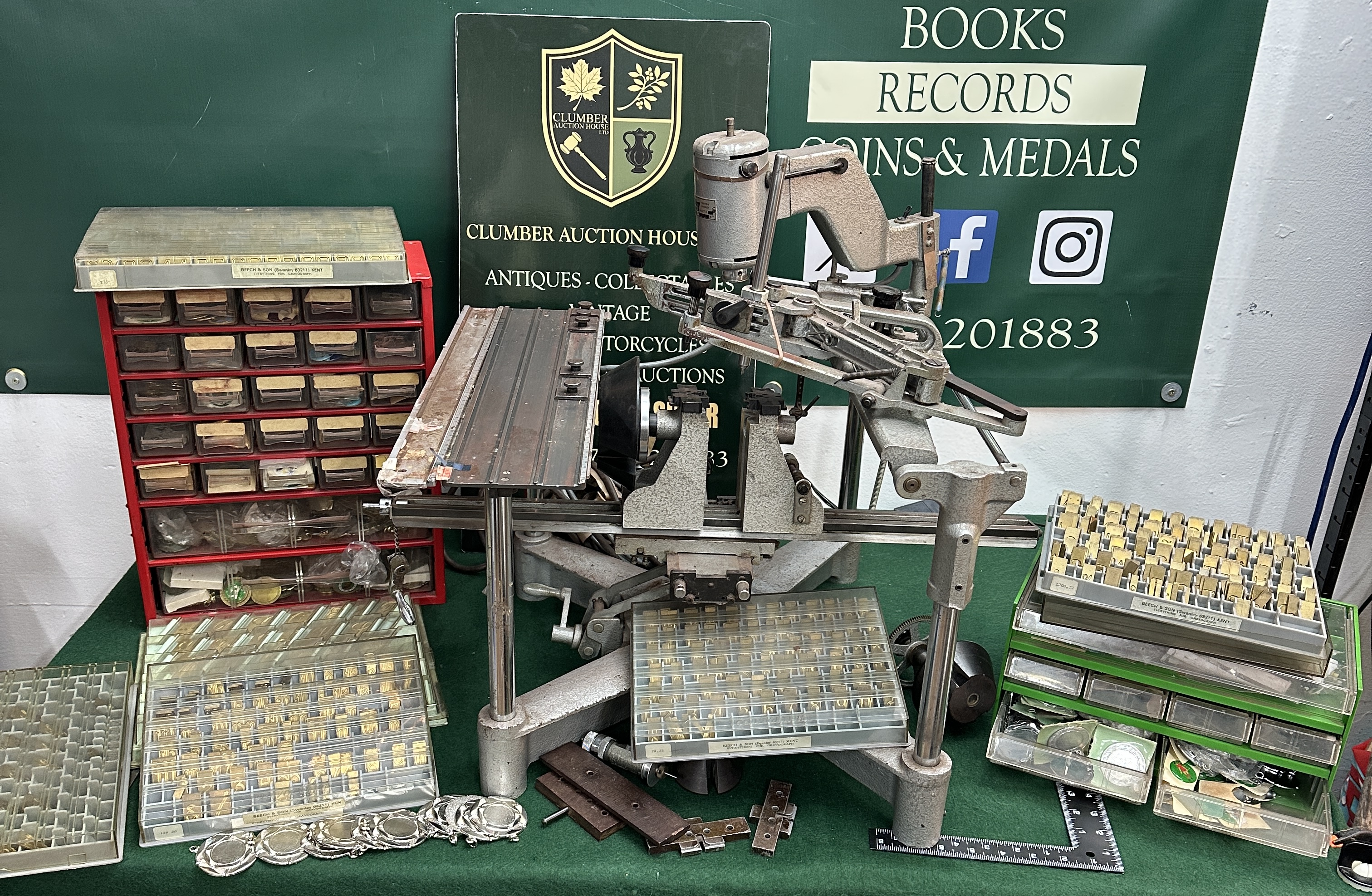 A professional manual pantograph engraving machine manufactured by Gravograph, Troyes, France. The machine is constructed from cast metal with a grey hammer-finish paint and features adjustable pantograph arms and a motor-driven spindle. The main arm is fitted with a manufacturer identification plate bearing the serial number N 33946. This comprehensive lot includes a collection of brass master engraving fonts, including multiple sets of alphabets, numerals, and symbols, organised in tiered plastic trays. The set is accompanied by a red 20-drawer storage unit containing an assortment of engraving blanks, medals, badges, and mechanical components. Additional accessories include various specialised clamping jigs, work-holding attachments, silver-toned blank medallions, trophy plates, and a metal L-square ruler. Several components bear distributor labels for Beech and Son, Swanley, Kent.