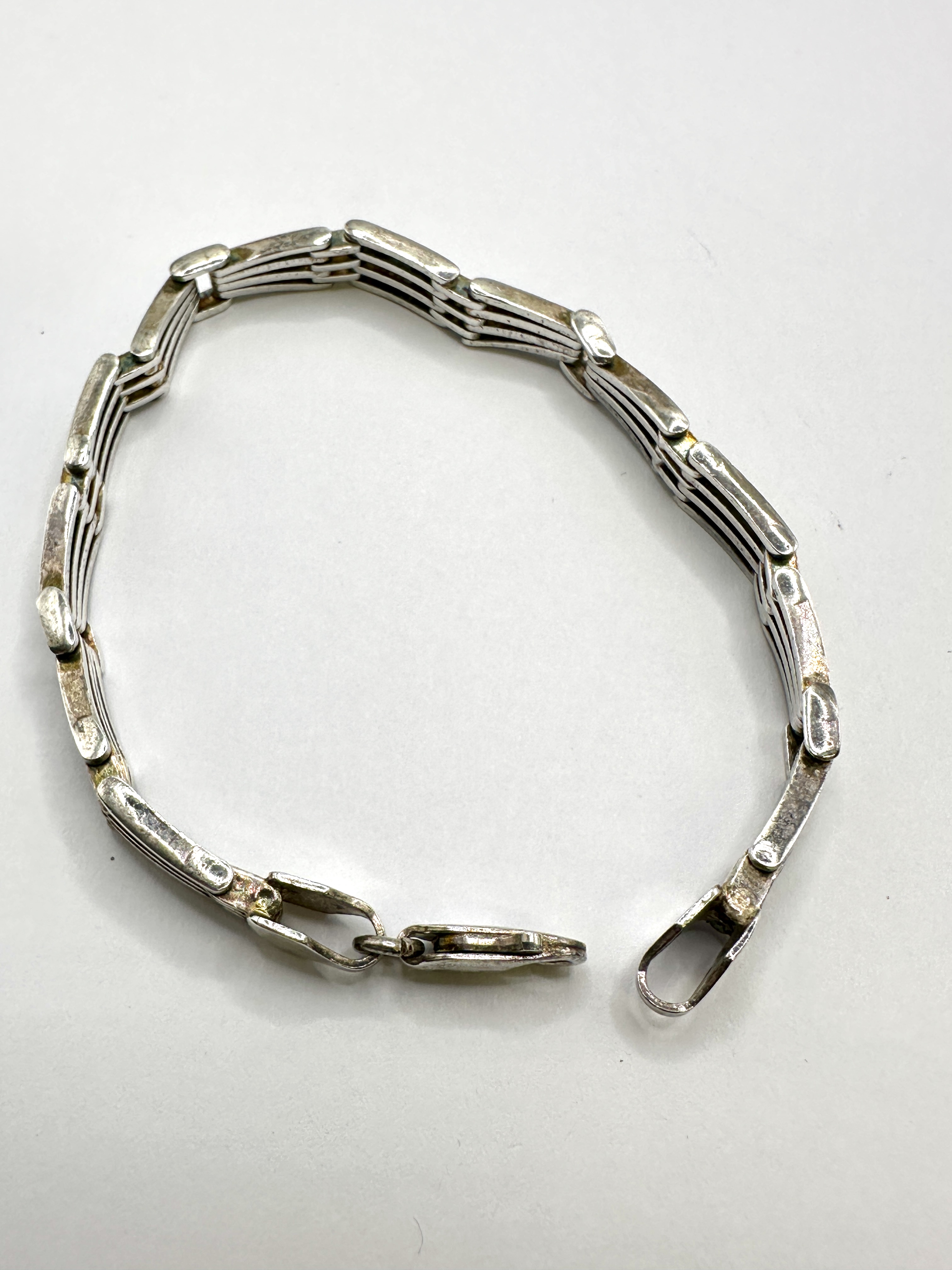 The bracelet is in fair to good condition. There is noticeable tarnishing and oxidation throughout the silver surfaces, particularly within the recessed areas of the gate links. Fine surface scratches and wear are present, consistent with age and regular use. The piece would benefit from professional cleaning and polishing.