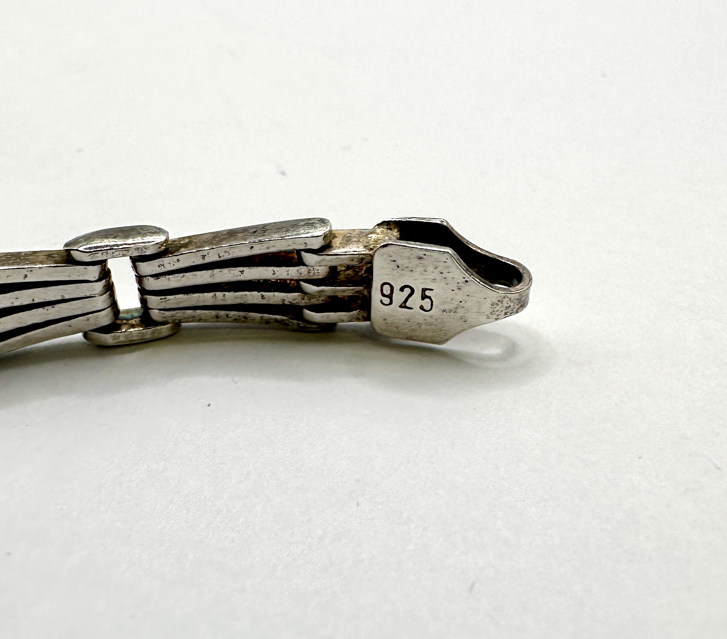 A sterling silver bracelet of gate link construction. The piece is composed of multiple articulated links, each featuring a stylized three-bar fluted design. The links are joined by transverse pin hinges. The bracelet is secured by a large lobster claw clasp and a corresponding loop terminal. One end cap is stamped with the fineness mark 925. The material is confirmed as 925 silver.