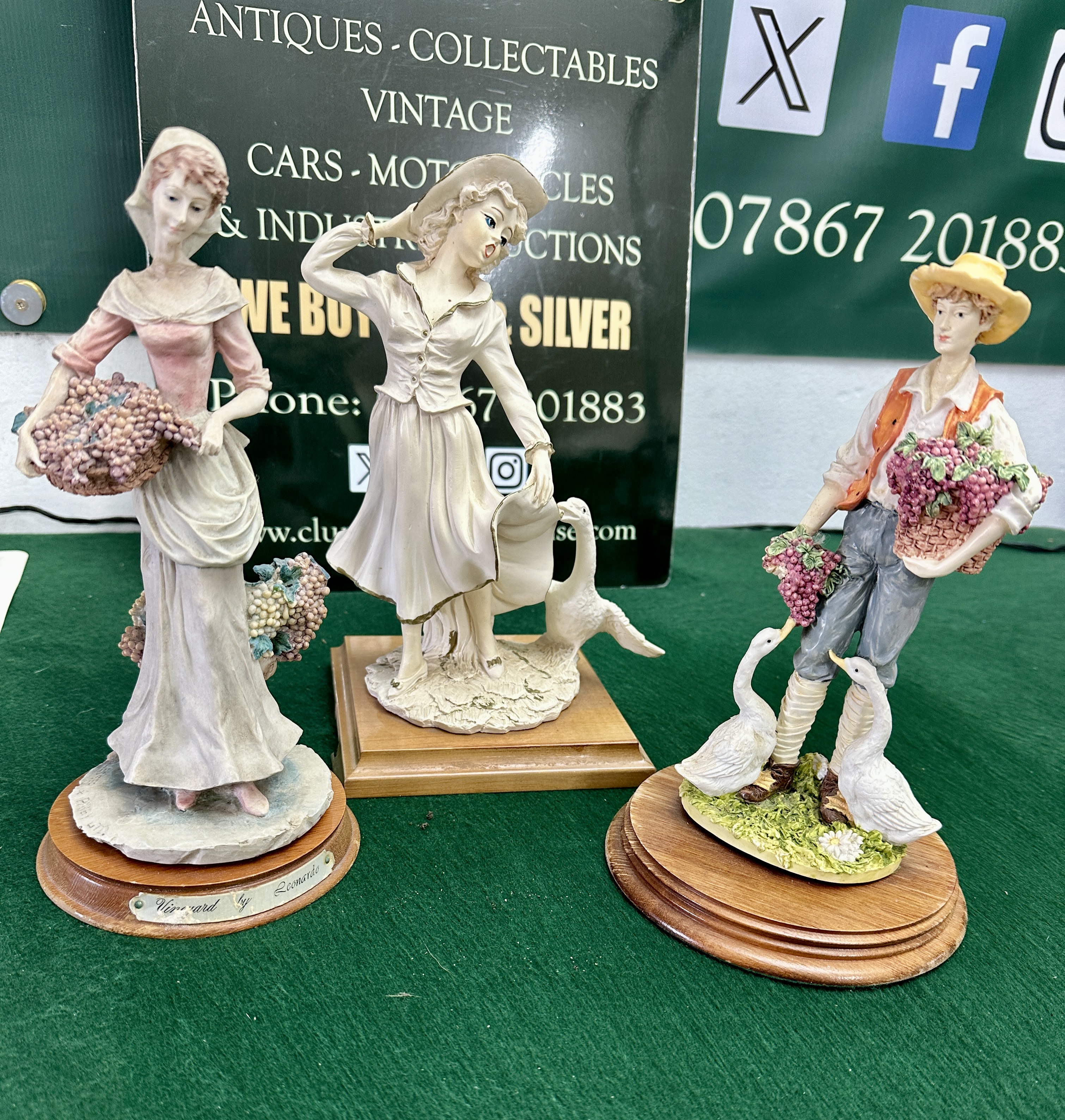 A trio of hand-painted figurines from The Leonardo Collection and similar, depicting pastoral and rustic themes. The collection is constructed from cast resin or cold-cast porcelain. The first figure, titled Vineyard, depicts a female grape picker in a pink bodice and lilac skirt, carrying a large woven basket of fruit. The second figure depicts a woman in a cream-coloured dress and sunhat accompanied by a white goose. The third figure depicts a male grape picker in an orange vest and blue trousers with two white geese at his feet. Each figure is mounted on a tiered, polished wooden base. The Vineyard figure features a brass-coloured identification plaque on the base and additional incised script on the integral resin base. The remaining two figures are unmarked but are executed in a style consistent with The Leonardo Collection.
