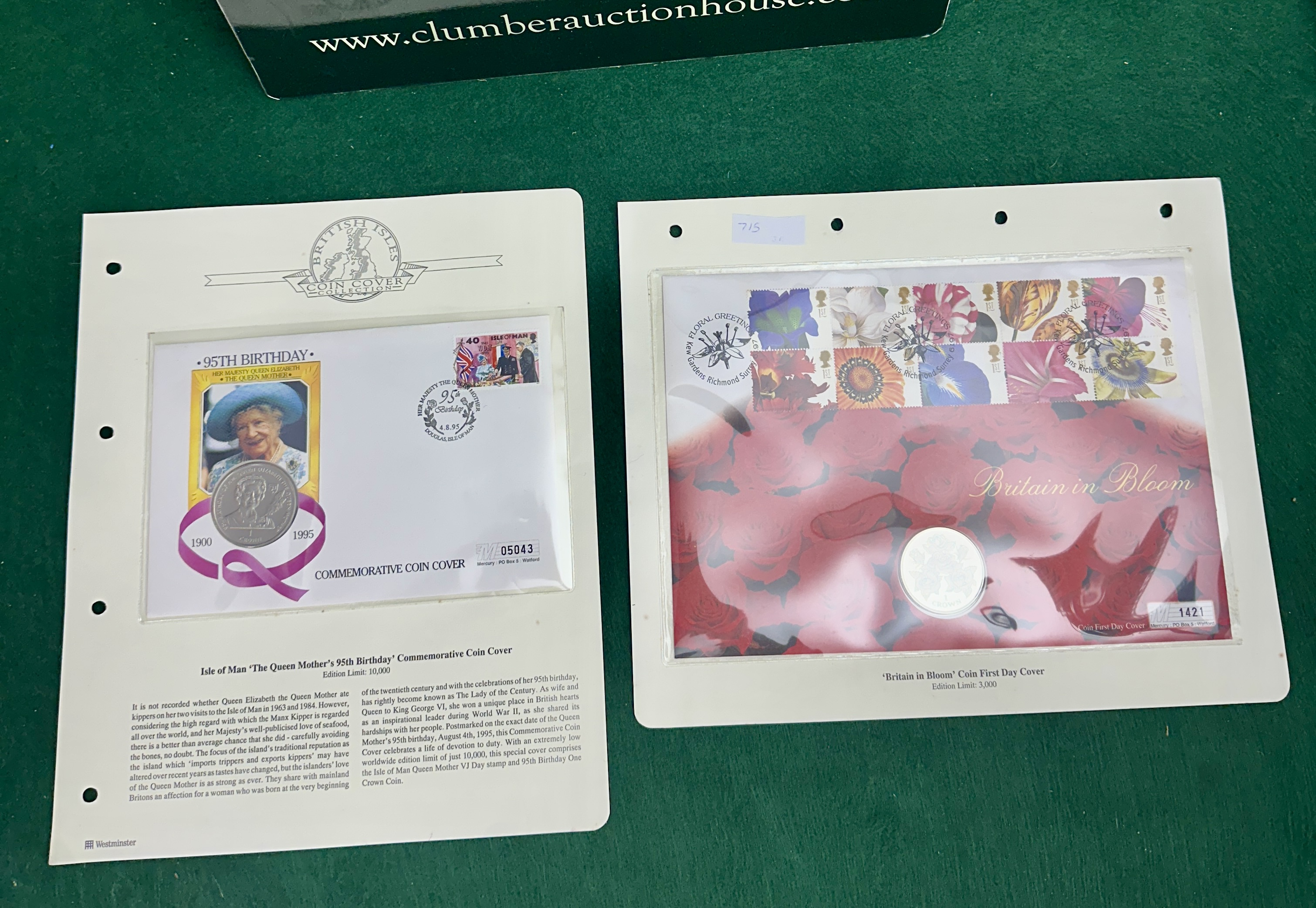 A pair of philatelic numismatic covers produced by Mercury, Watford. The first item is an Isle of Man commemorative coin cover for the 95th Birthday of HM Queen Elizabeth The Queen Mother, featuring a single 40p VJ Day issue stamp. It is cancelled with a pictorial circular date stamp from Douglas, Isle of Man, dated 4 August 1995. The cover includes an Isle of Man 1 Crown coin and is serial numbered M 05043 from an edition of 10,000. The second item is a UK Britain in Bloom coin first day cover featuring stamps from the 1997 Floral Greetings issue. These are cancelled with pictorial circular date stamps from Kew Gardens, Richmond, Surrey, dated 6 January 1997. The cover contains a 1 Crown coin and is serial numbered M 1421 from an edition of 3,000. Both covers are presented in protective sleeves on punched display cards.