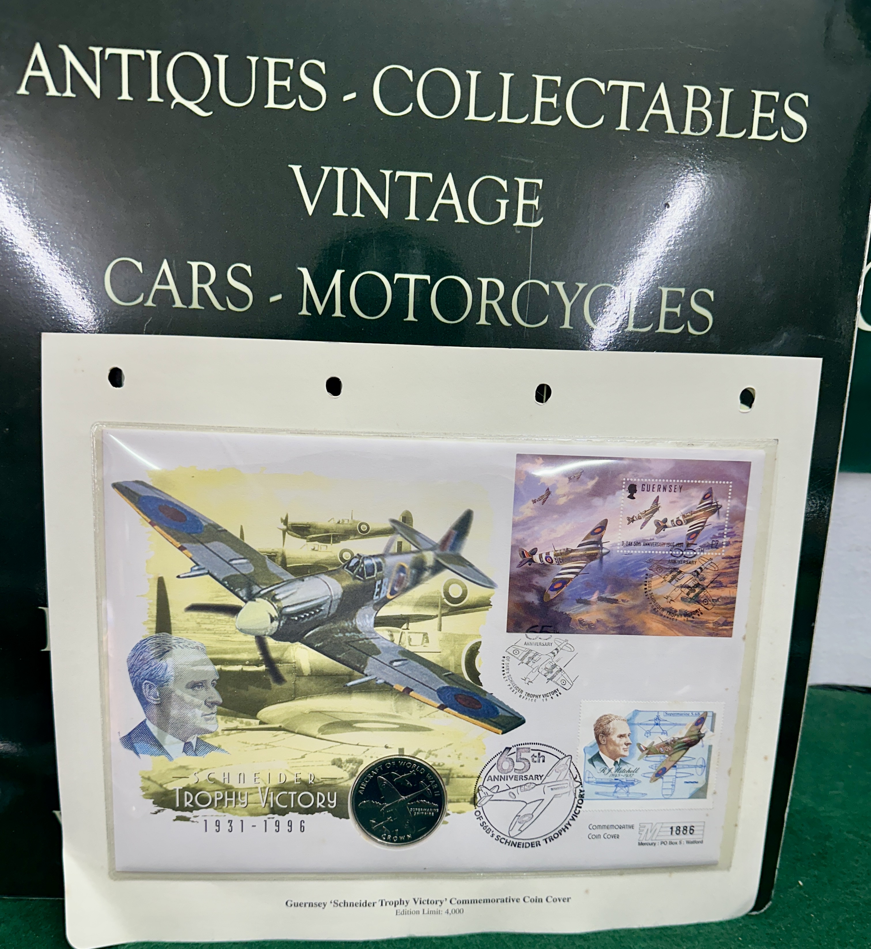 A Guernsey Schneider Trophy Victory 65th Anniversary commemorative coin cover, issued in 1996. The assembly features an Isle of Man 1 Crown coin from the Aircraft of World War II series. The reverse of the coin depicts three Supermarine Spitfire aircraft in flight with the inscriptions AIRCRAFT OF WORLD WAR II, SUPERMARINE SPITFIRE, and the denomination 1 CROWN. The obverse features the effigy of Queen Elizabeth II. The philatelic elements include a Guernsey miniature sheet and a commemorative label for R.J. Mitchell, cancelled by a pictorial postmark from the Guernsey Post Office dated 13 September 1996. The items are presented in a white card mount with printed illustrations and historical text on the reverse detailing the 1931 Schneider Trophy victory and the development of the Supermarine S6B and Spitfire. This item is from a limited edition of 4,000, with the specimen numbered 1886.
