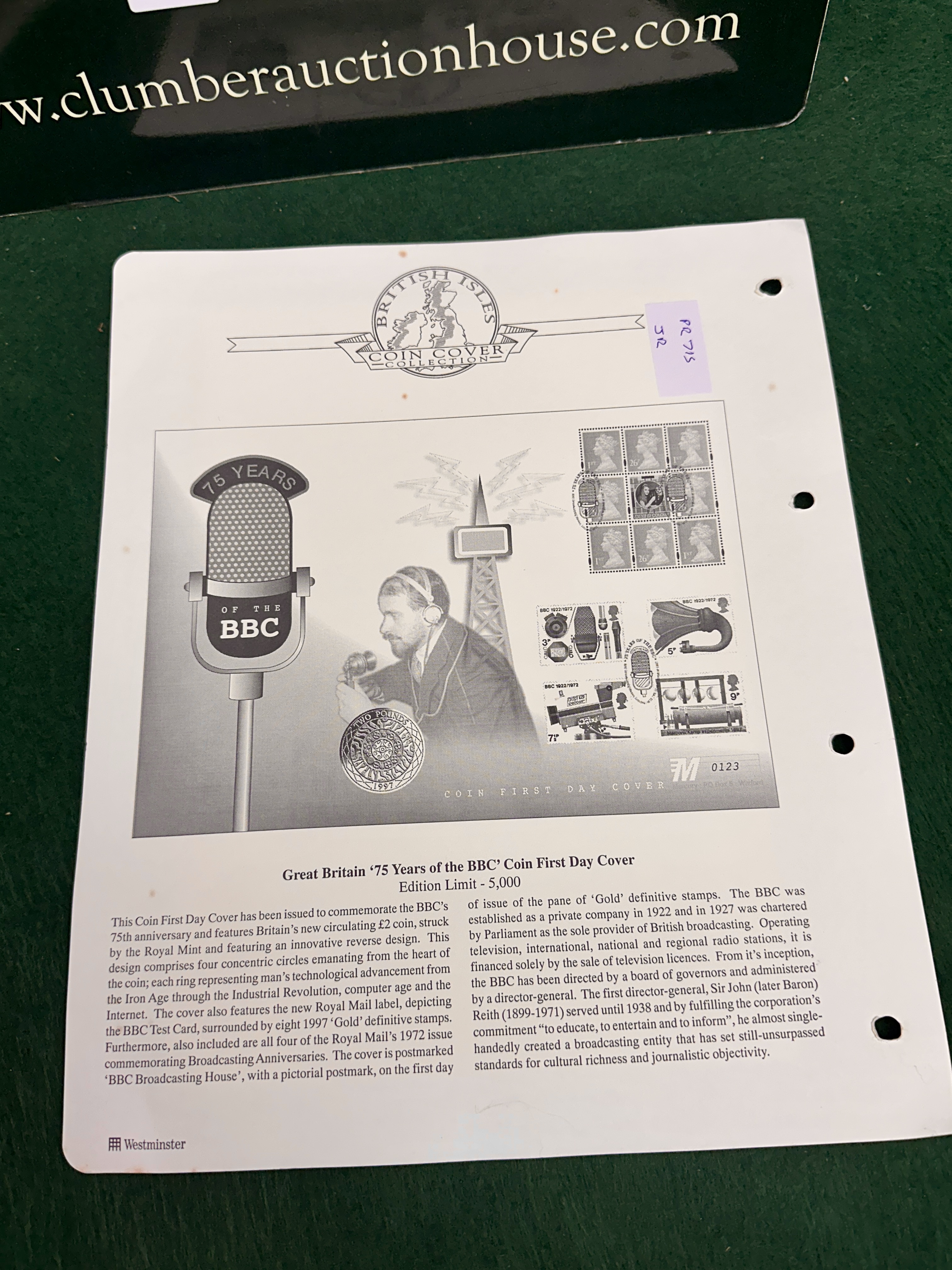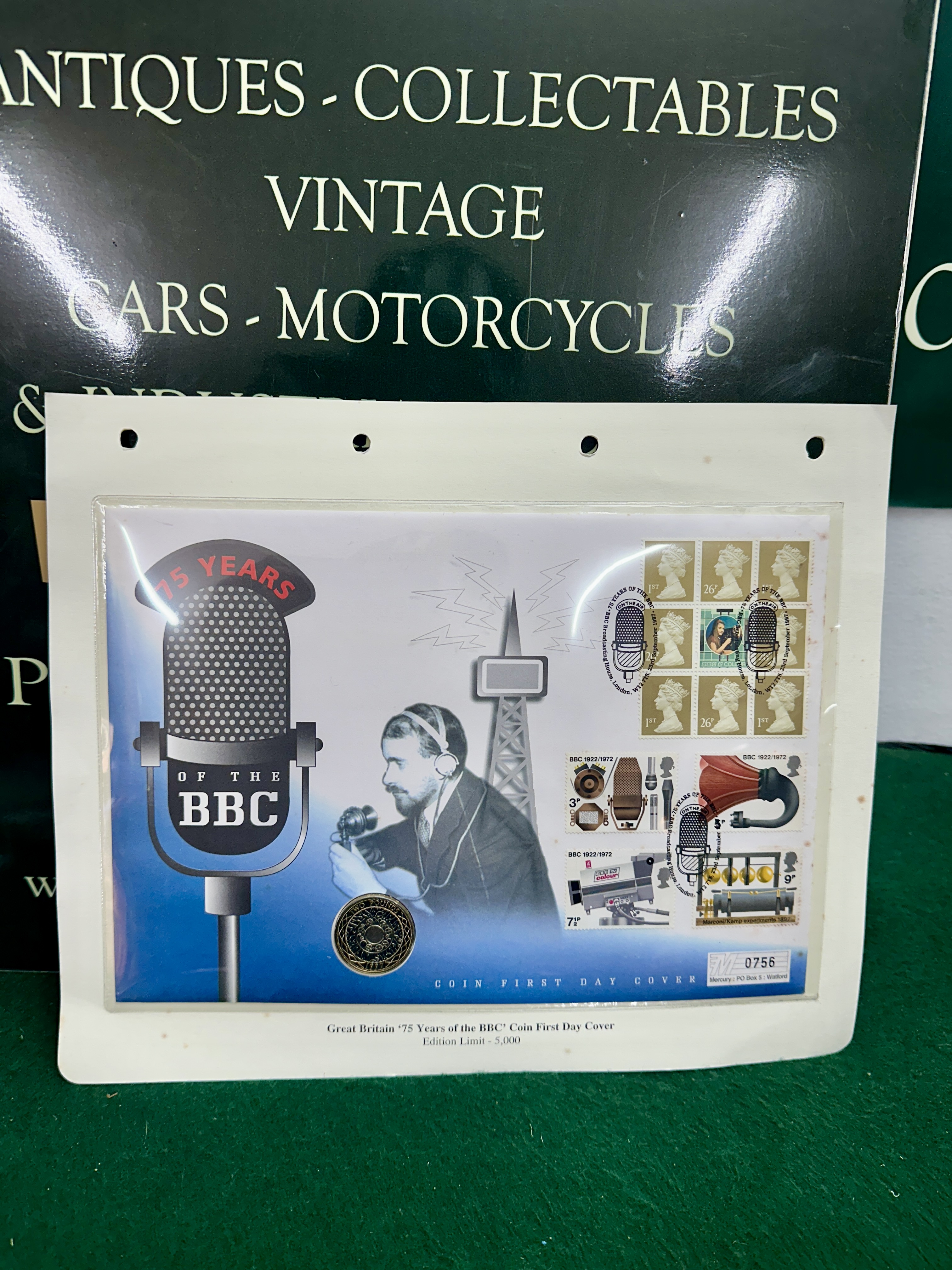 A philatelic and numismatic commemorative cover produced by Mercury (Watford) for Westminster to mark the 75th anniversary of the BBC. The cover features a block of eight gold-coloured perforated Machin definitive stamps, including 1ST and 26p denominations, surrounding a central label depicting the BBC television test card. Additionally, the cover bears a set of four perforated stamps from the 1972 BBC anniversary issue. All stamps are cancelled with pictorial circular date stamps from BBC Broadcasting House, London, W12, dated 23rd September 1997. The cover artwork includes a graphic of a vintage microphone and an image of a radio broadcaster. An uncirculated 1997 United Kingdom bi-metallic two pound coin is encapsulated within the cover, showing the concentric circles reverse design. This example is hand-numbered M 0756 from a limited edition of 5,000.