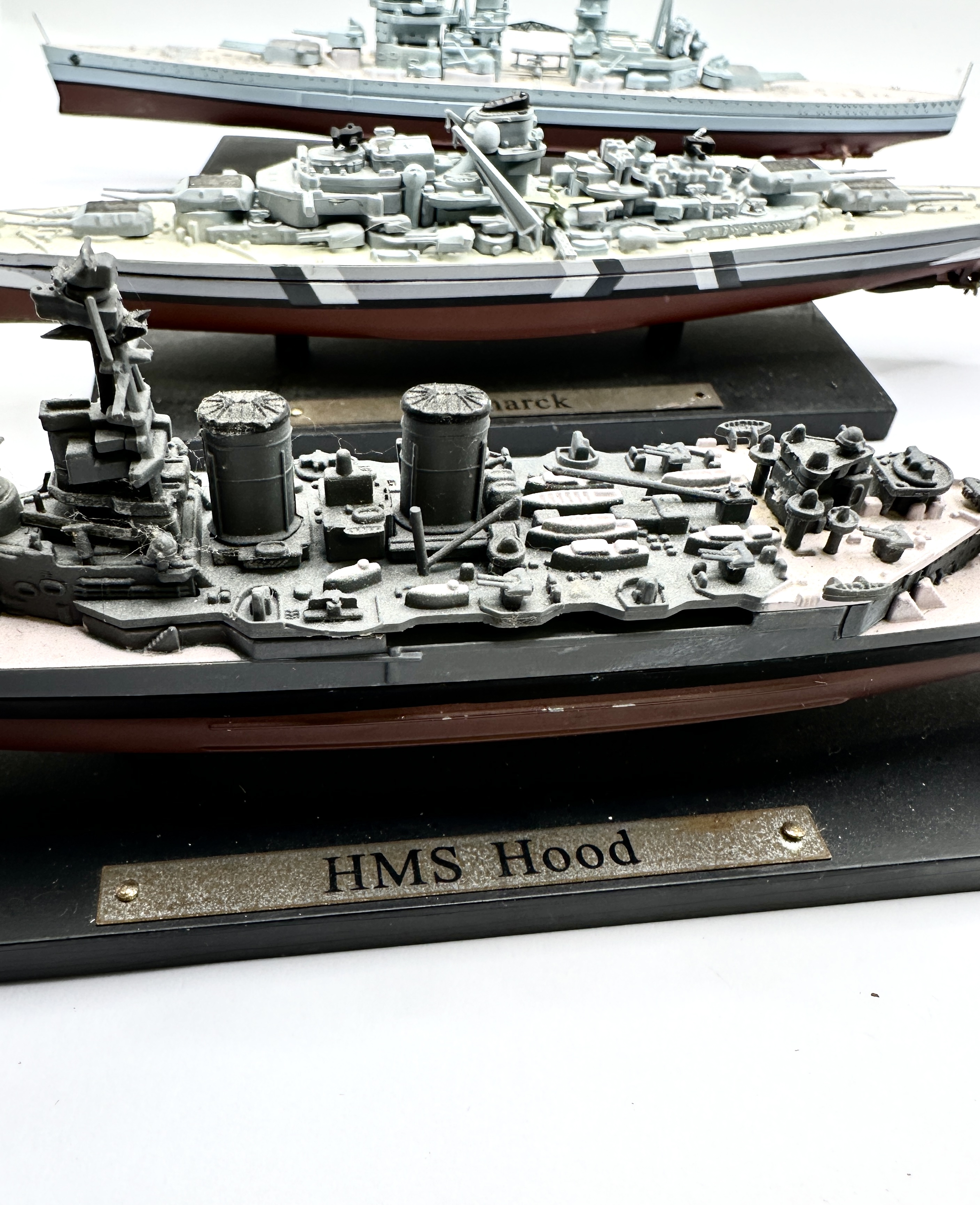 A trio of DeAgostini 1/1250 scale diecast model warships from the Warship Collection. The lot includes models of the British battlecruiser HMS Hood, the German battleship Bismarck, and the British battleship HMS Prince of Wales. Each vessel is constructed from diecast metal and plastic with pre-painted finishes representing historical military liveries and camouflage. The models are mounted on rectangular black bases, each featuring an identifying metal nameplate inscribed with the vessel name. Visible features include primary and secondary gun turrets, superstructure details, funnels, and deck-mounted armaments.