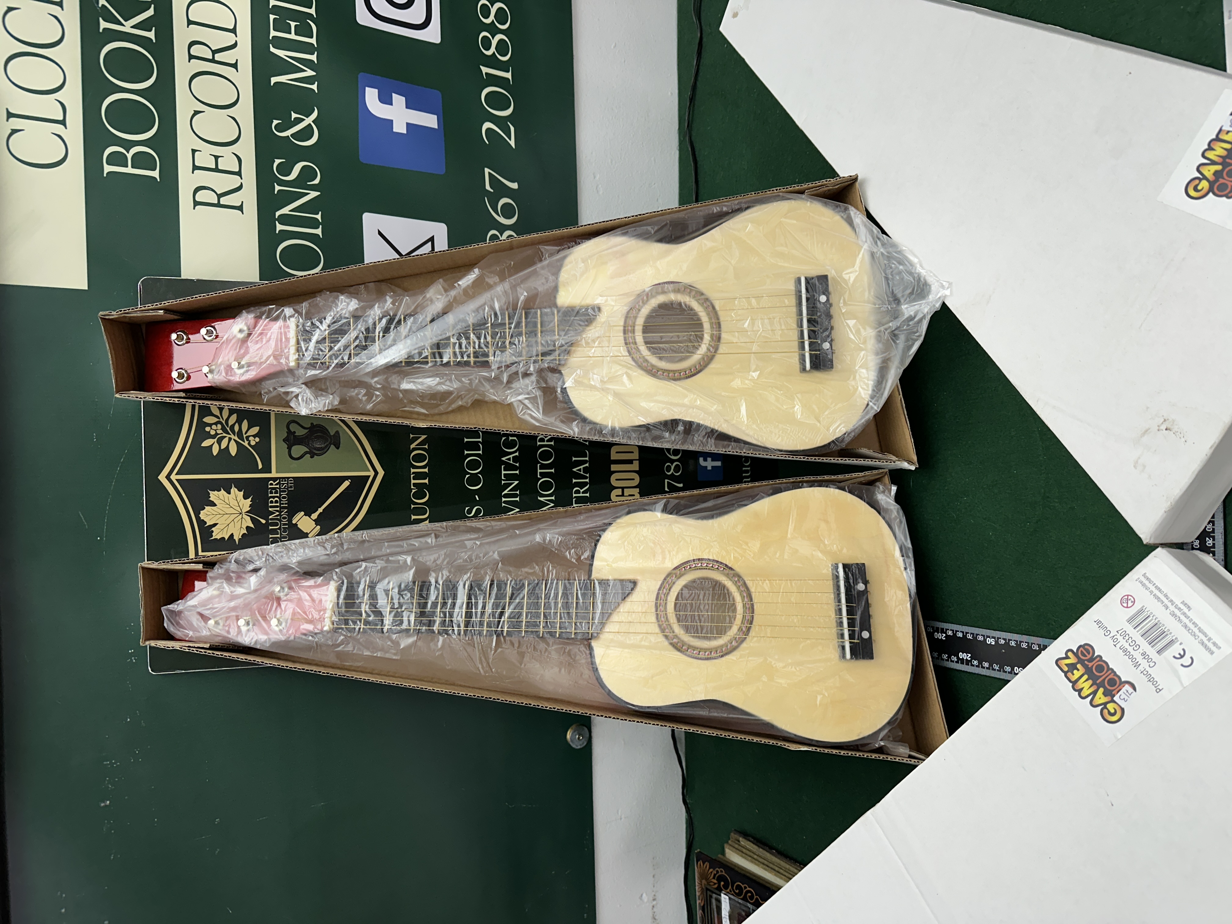 A pair of Gamez Galore wooden toy guitars, product code GG3307. Each instrument is constructed with a light-finished wooden body, a dark fretboard, and a decorative rosette surrounding the soundhole. The guitars feature a six-string configuration and headstocks finished in red. The items are housed within their original open-face cardboard shipping boxes and individual protective plastic sleeves.