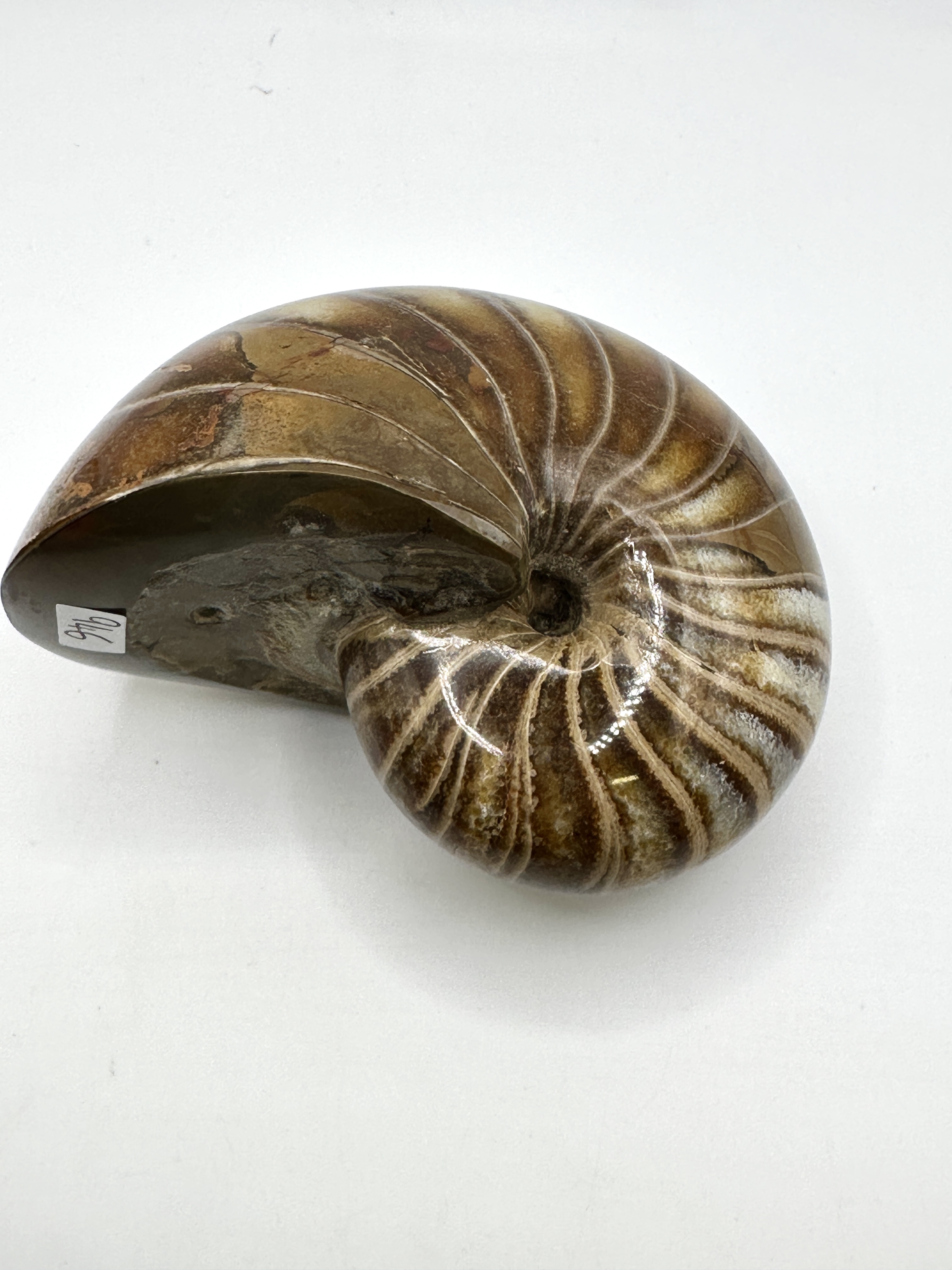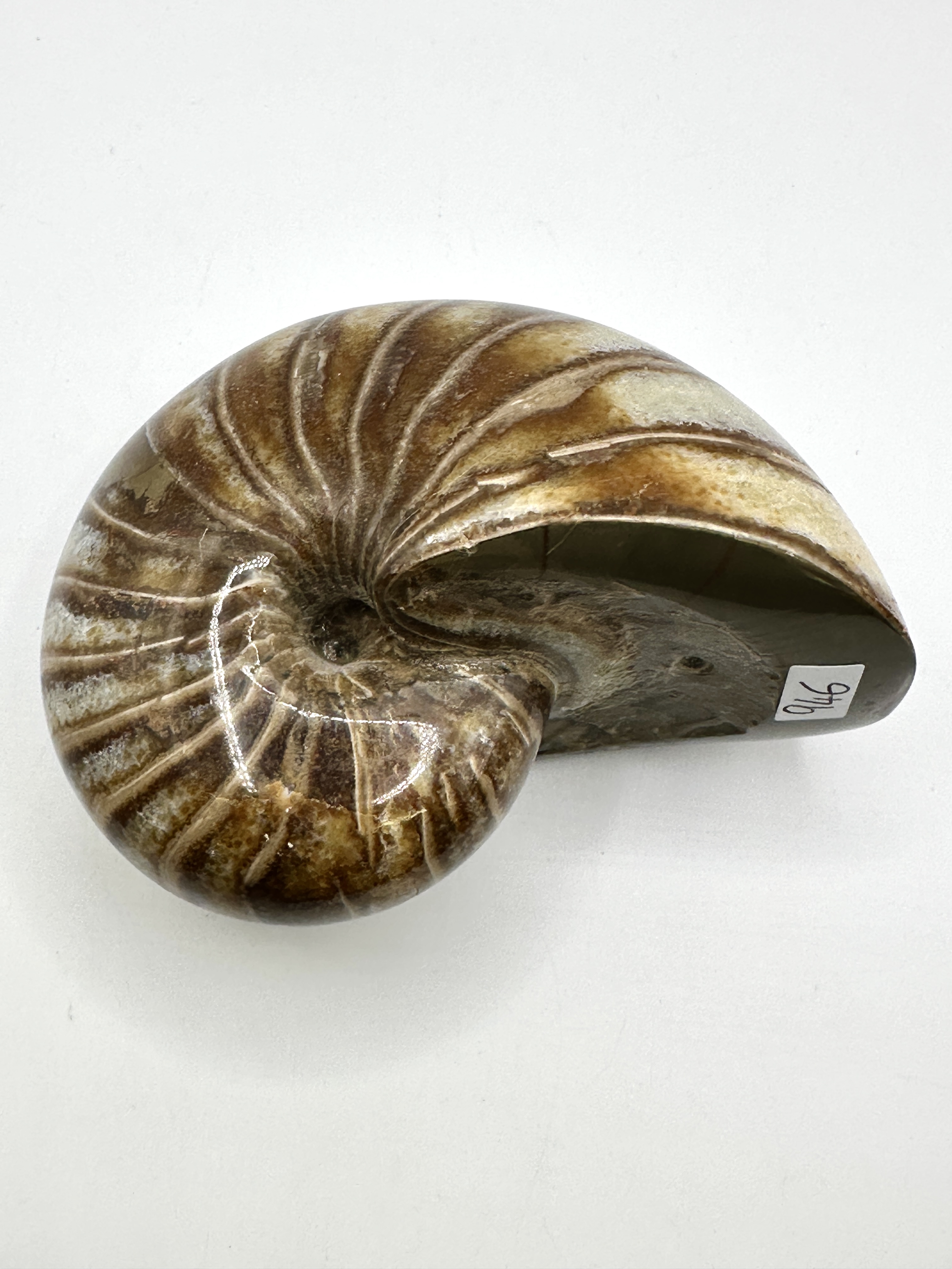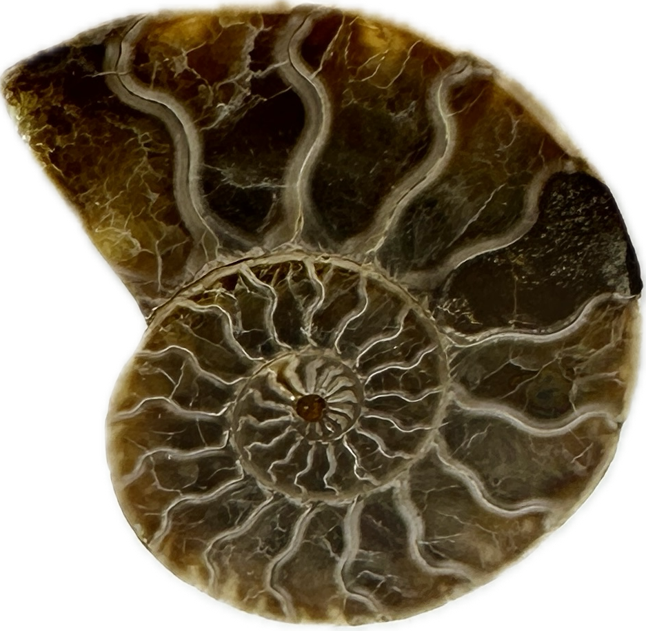 A fossilised specimen originating from Madagascar. A polished planispiral nautiloid shell, identified as Cymatoceras sakalavus from the Cretaceous period. The specimen displays a smooth surface with characteristic brown and cream-coloured banding. Close up you can see it shows cross-sections of an ammonite, showing the internal chambers and wavy septal walls filled with mineralised deposits.