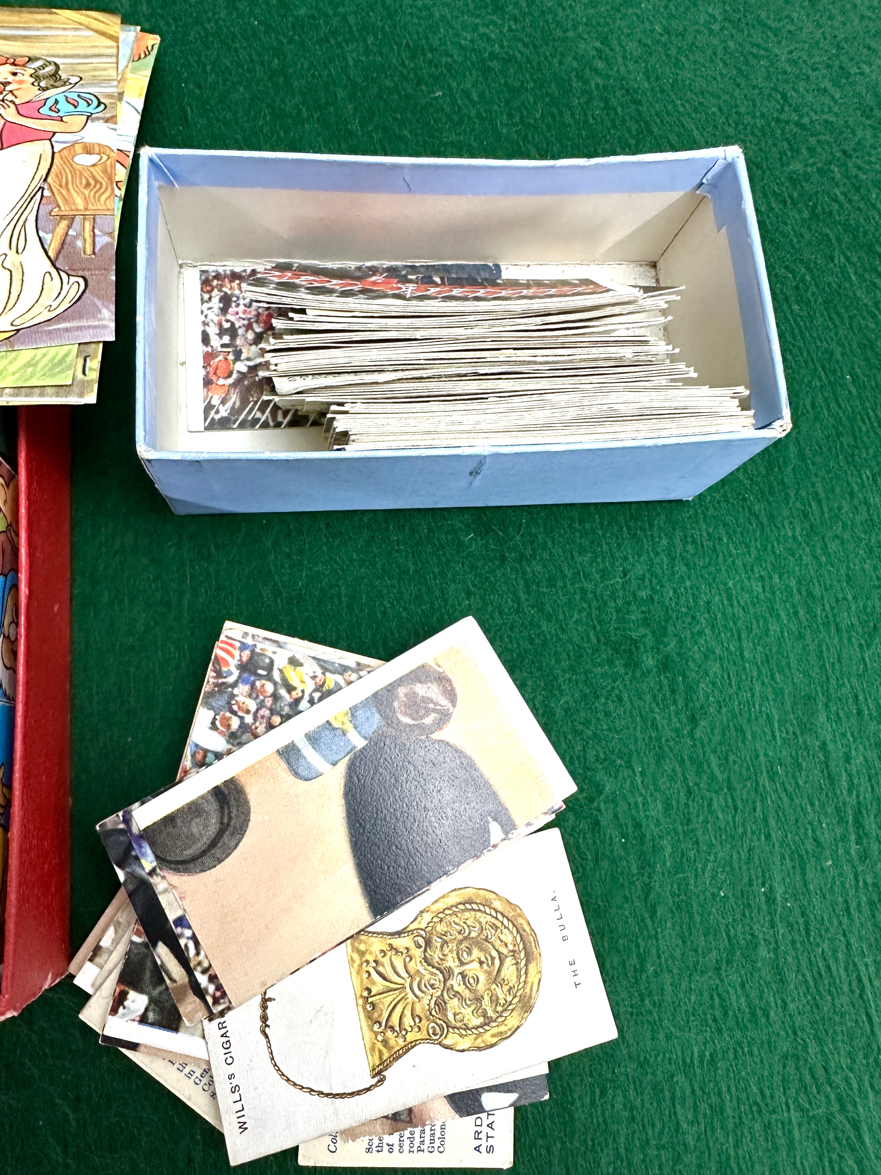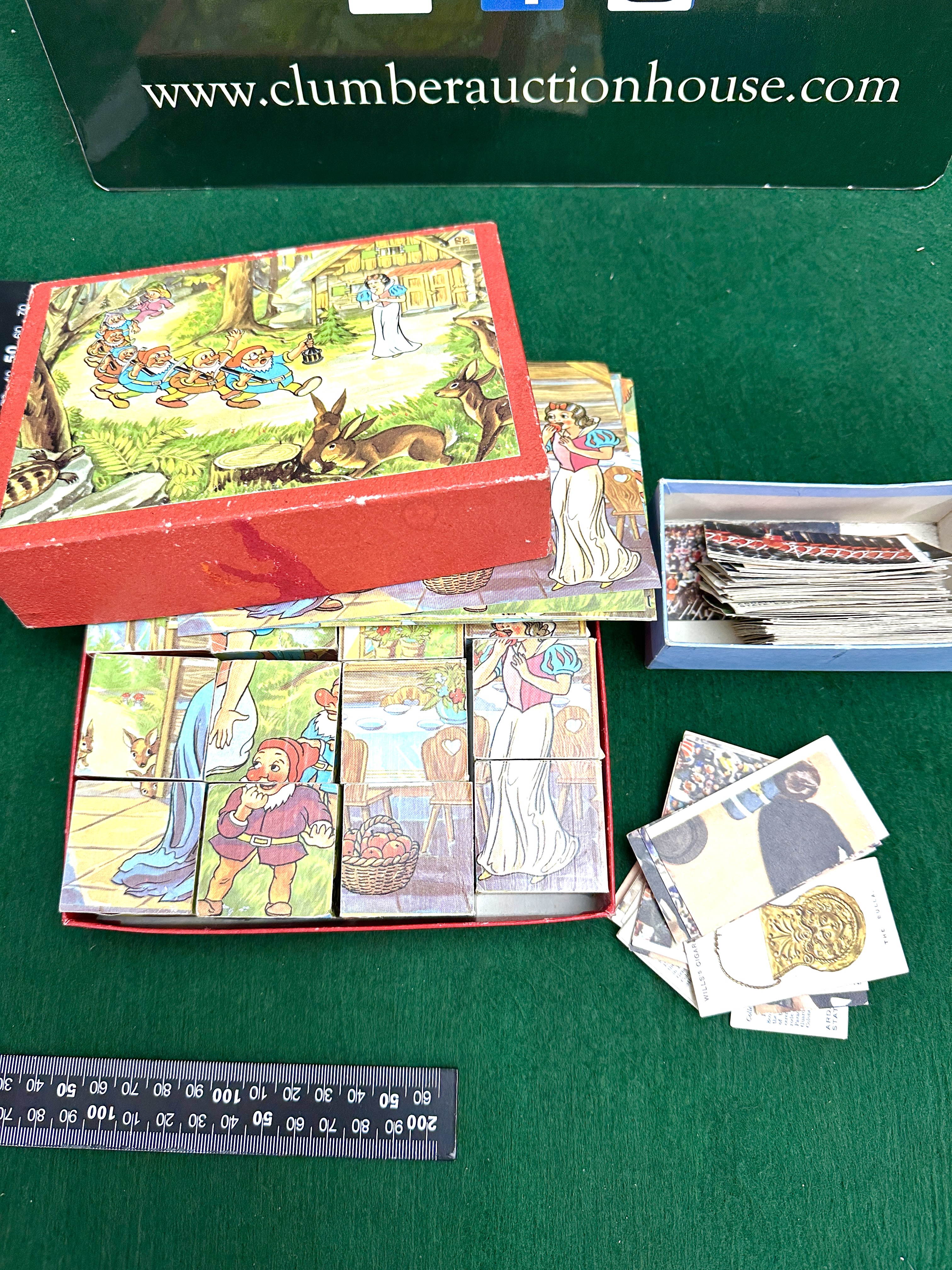 A mid-20th century Disney Snow White and the Seven Dwarfs wooden block puzzle, comprising multiple wooden cubes with paper-covered illustrations to each face. The set includes several colour-printed paper guide sheets and is housed in a red cardboard box with a pictorial lid depicting characters from the film. Accompanying the puzzle is a collection of vintage cigarette and trade cards, including examples from Wills’s Cigarettes and a card titled The Bulla. The cards are presented loose and within a plain blue cardboard box.