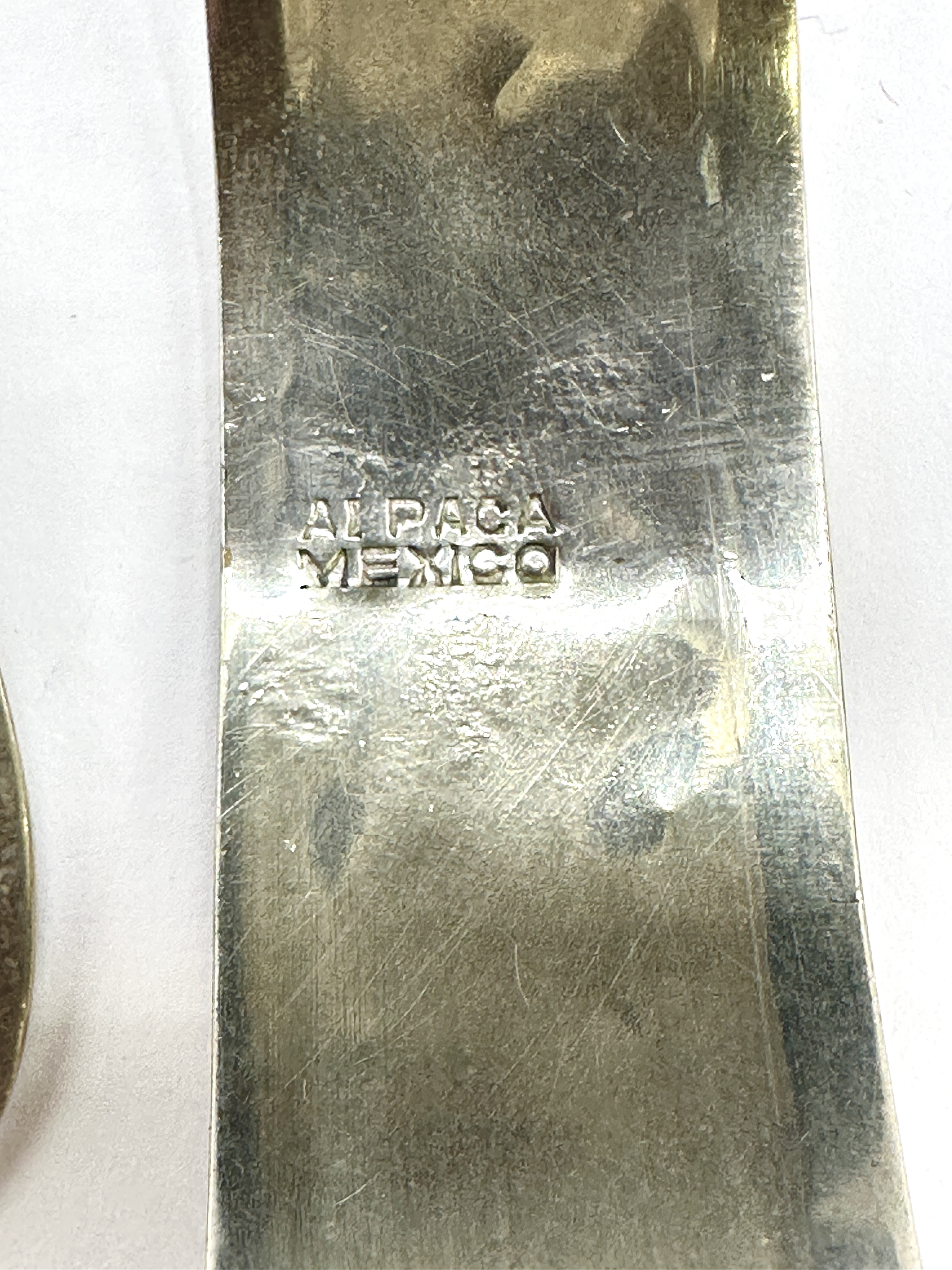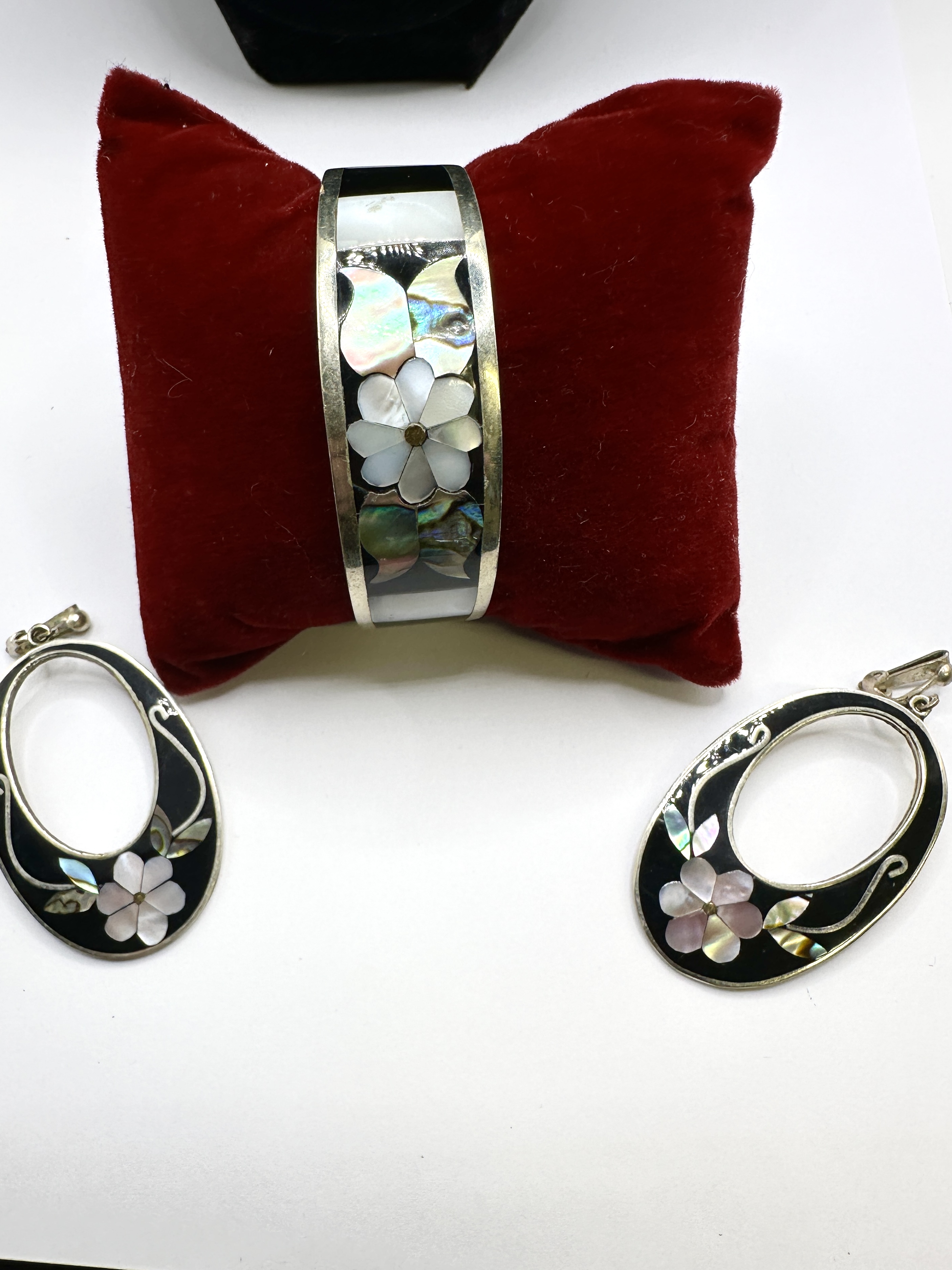 A trio of Paco Mexican silver jewellery comprising a wide hinged cuff bracelet and a pair of oval clip-on earrings. Each piece features decorative shell inlays including iridescent mother-of-pearl and abalone shell set against a black ground. The motifs depict floral and butterfly-inspired designs. The reverse of the items is stamped with the hallmark ALPACA MEXICO. The construction utilises Paco Mexican silver alloy with inset natural shell components.