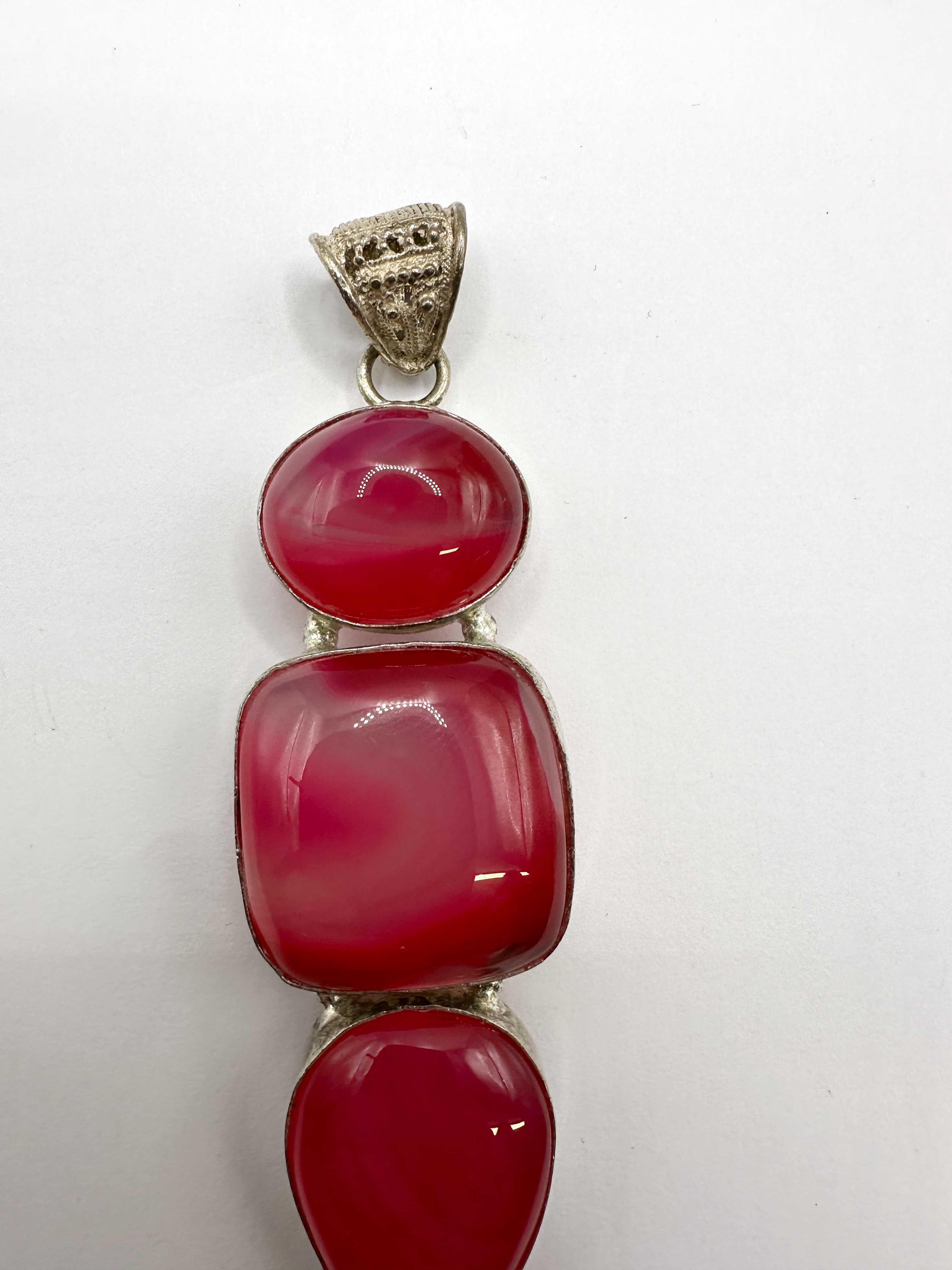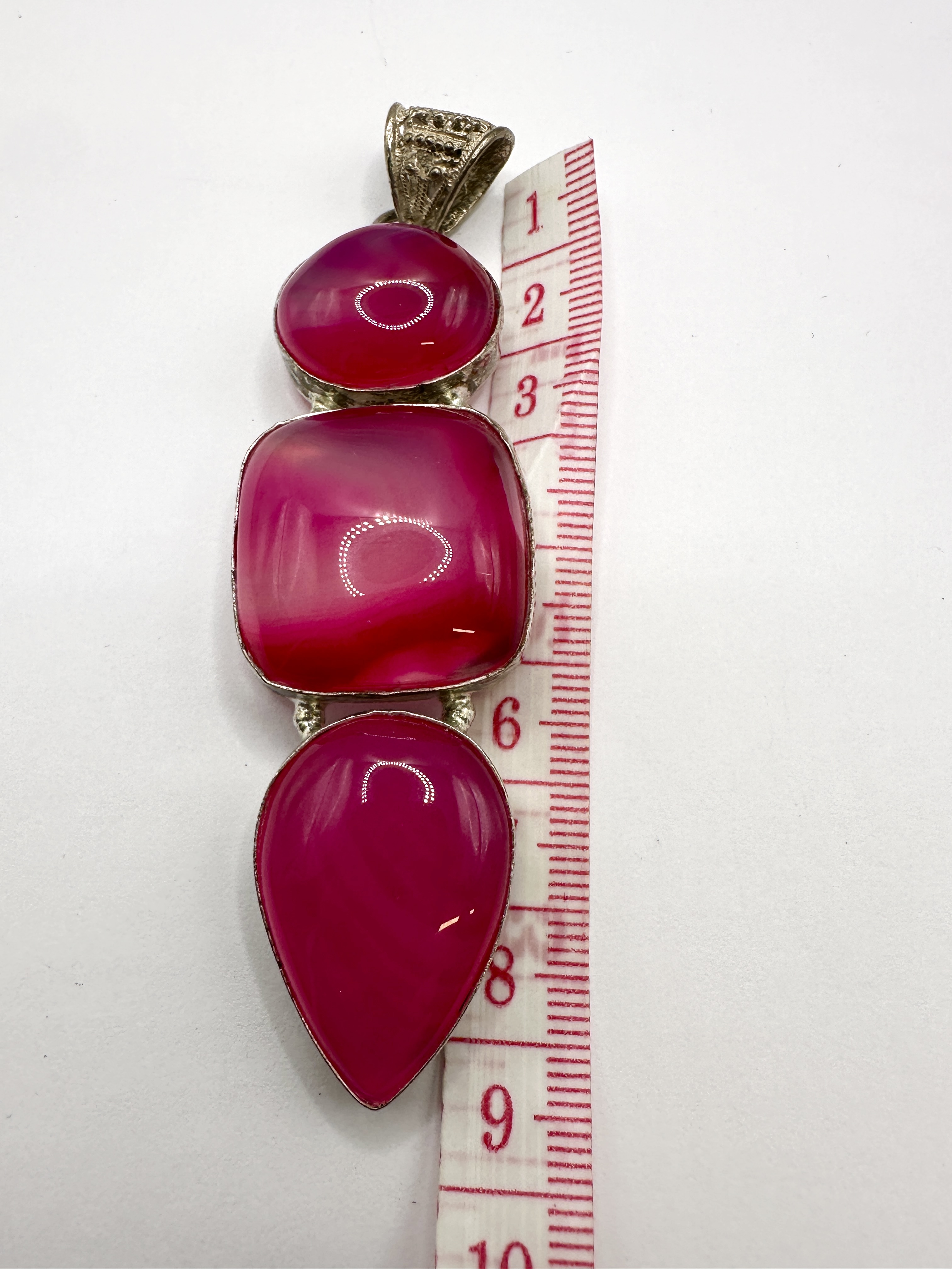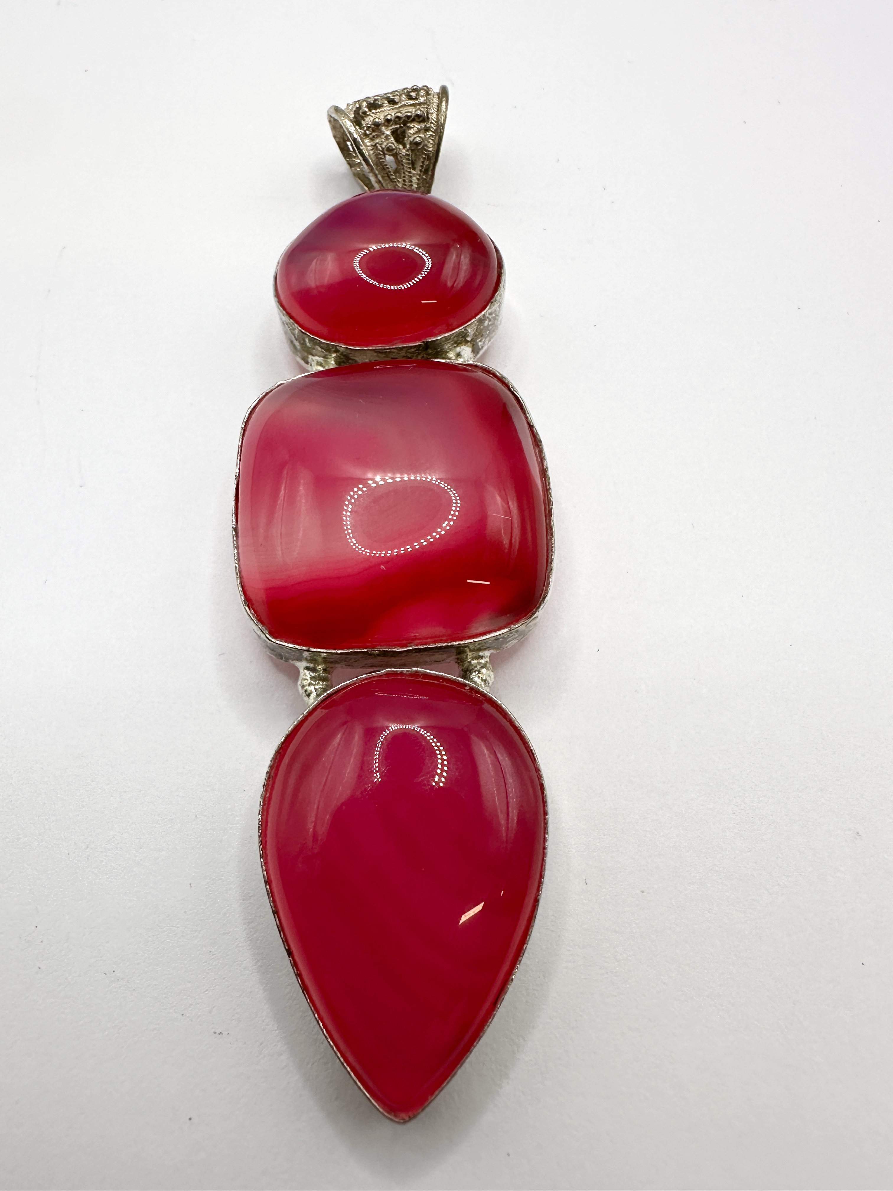 A 925 silver and pink agate three-stone drop pendant. The piece features three graduated magenta-dyed agate cabochons arranged vertically, including an oval top stone, a central square cushion-shaped stone, and a large teardrop-shaped terminal. The stones exhibit visible natural banding and are housed in 925 silver bezel settings. The pendant is suspended from an ornate bail decorated with filigree and granulated metalwork. No hallmarks are visible on the metal.