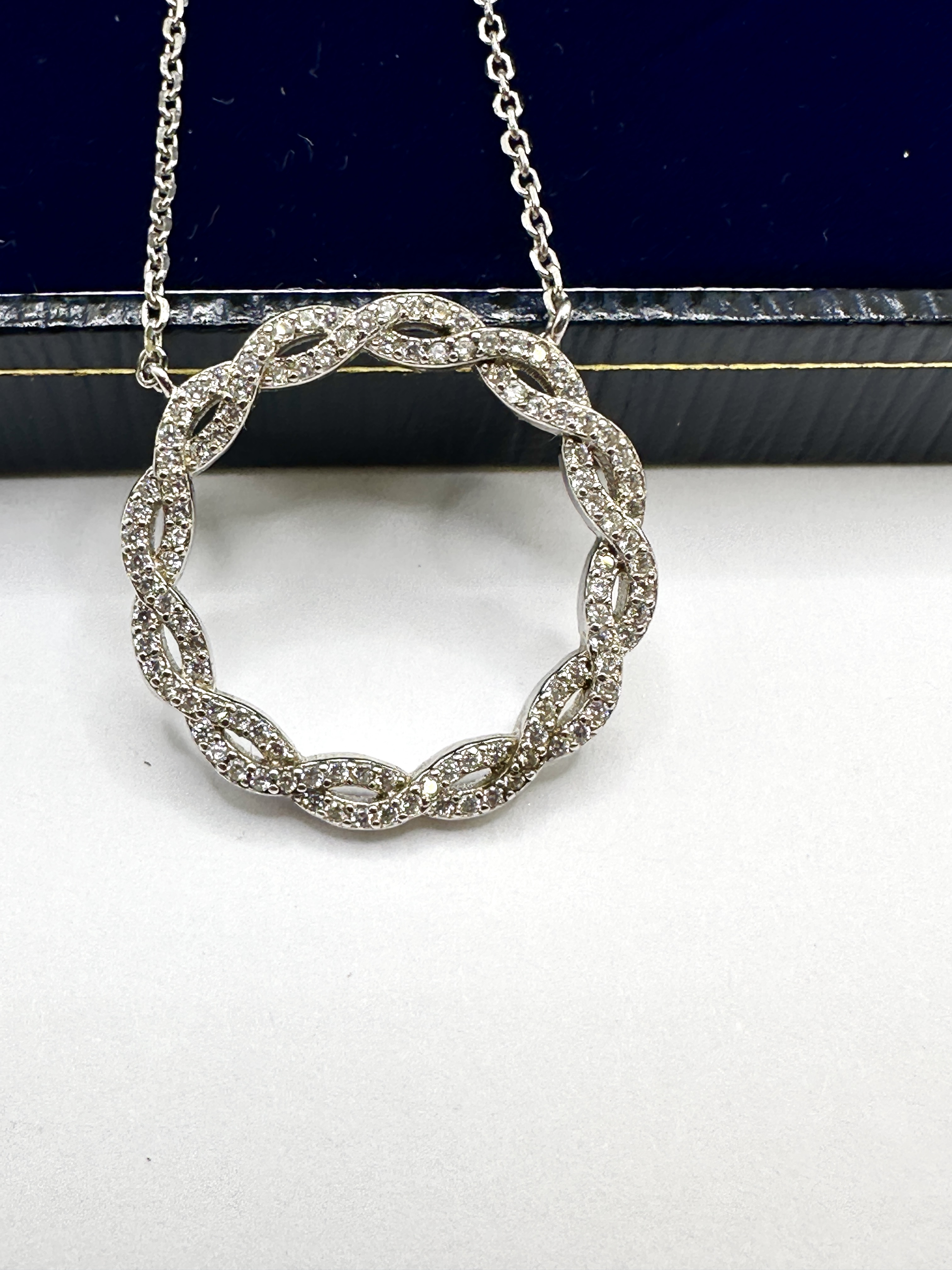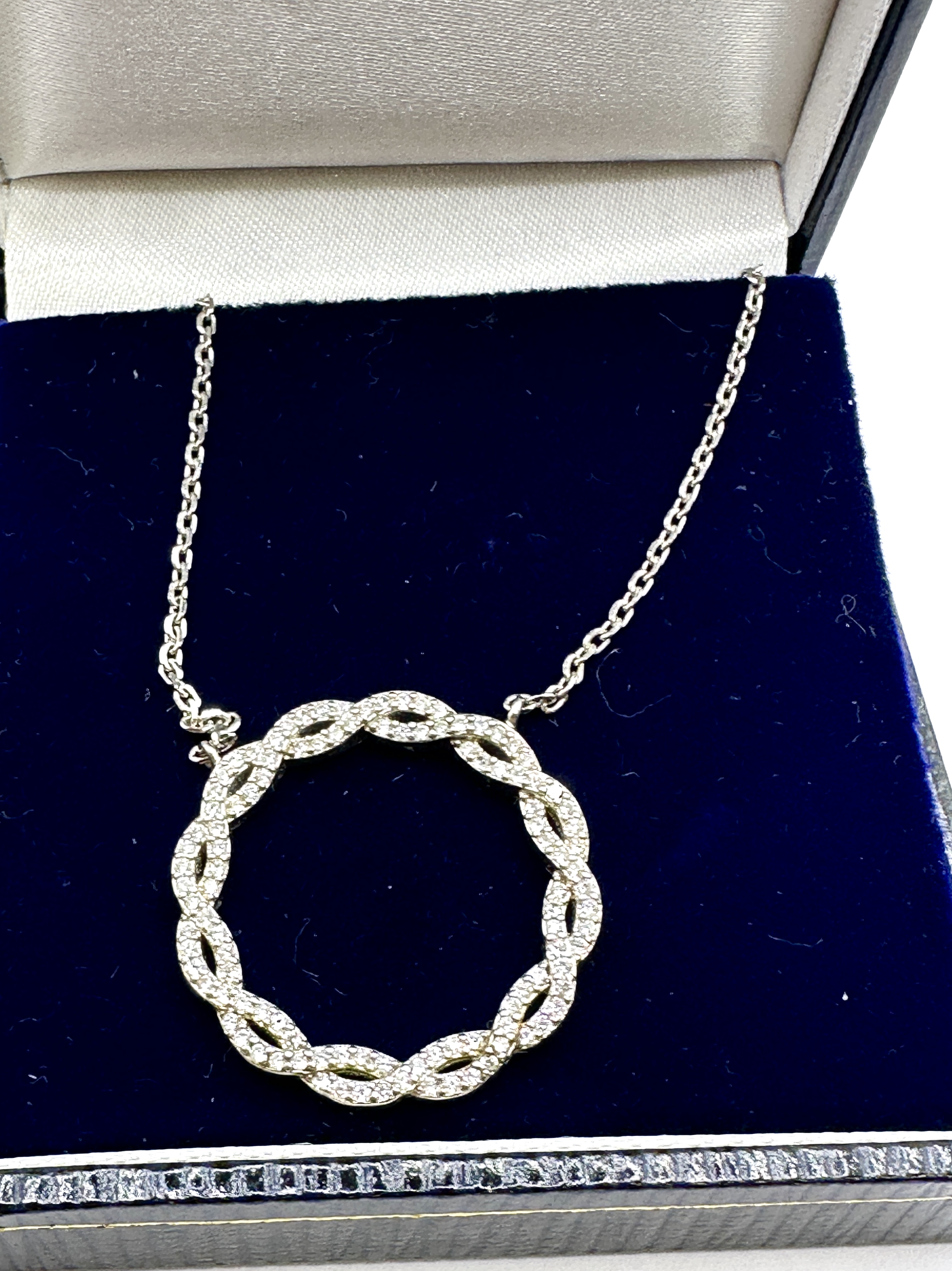 A contemporary pendant necklace of twist circle design, crafted from 925 silver. The pendant features an open circular form composed of three intertwined strands, each pavé-set with numerous small round-cut clear stones. These stones are consistent with created white sapphires as identified in similar retail examples of this design. The pendant is suspended from an integrated fine-link cable chain. The item is presented in a blue velvet-lined hinged presentation case. No hallmarks or maker’s marks are visible on the piece.