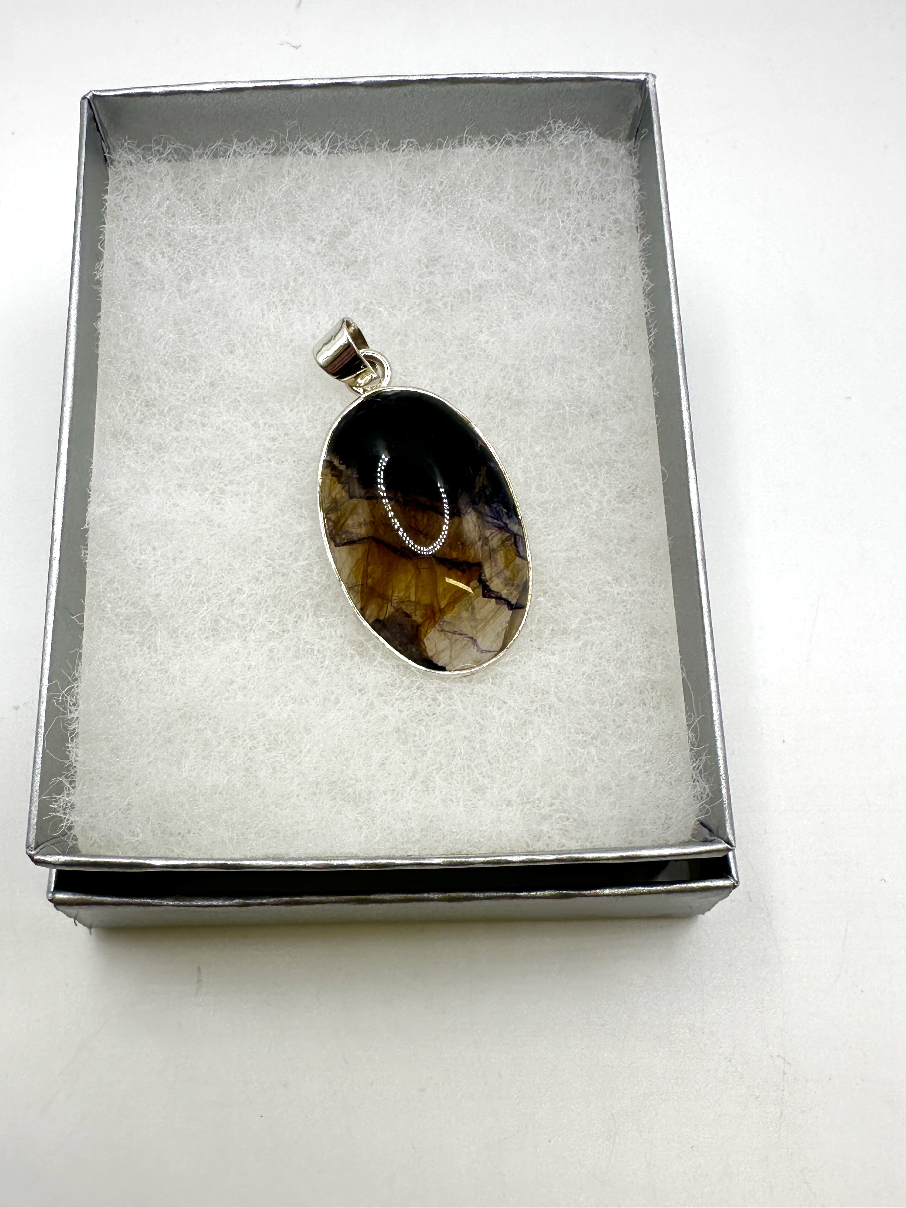 A 925 silver pendant featuring a large, polished oval cabochon of variegated fluorite. The stone displays distinctive bands of deep purple and translucent honey-yellow with internal veining, characteristic of fluorite varieties such as Blue John. The gemstone is secured in a simple bezel setting and suspended from a tapered bail. The reverse of the setting is stamped with a 925 hallmark, confirming the material as 925 silver. The pendant is presented in a silver-toned cardboard jewellery box with a fibrous insert.