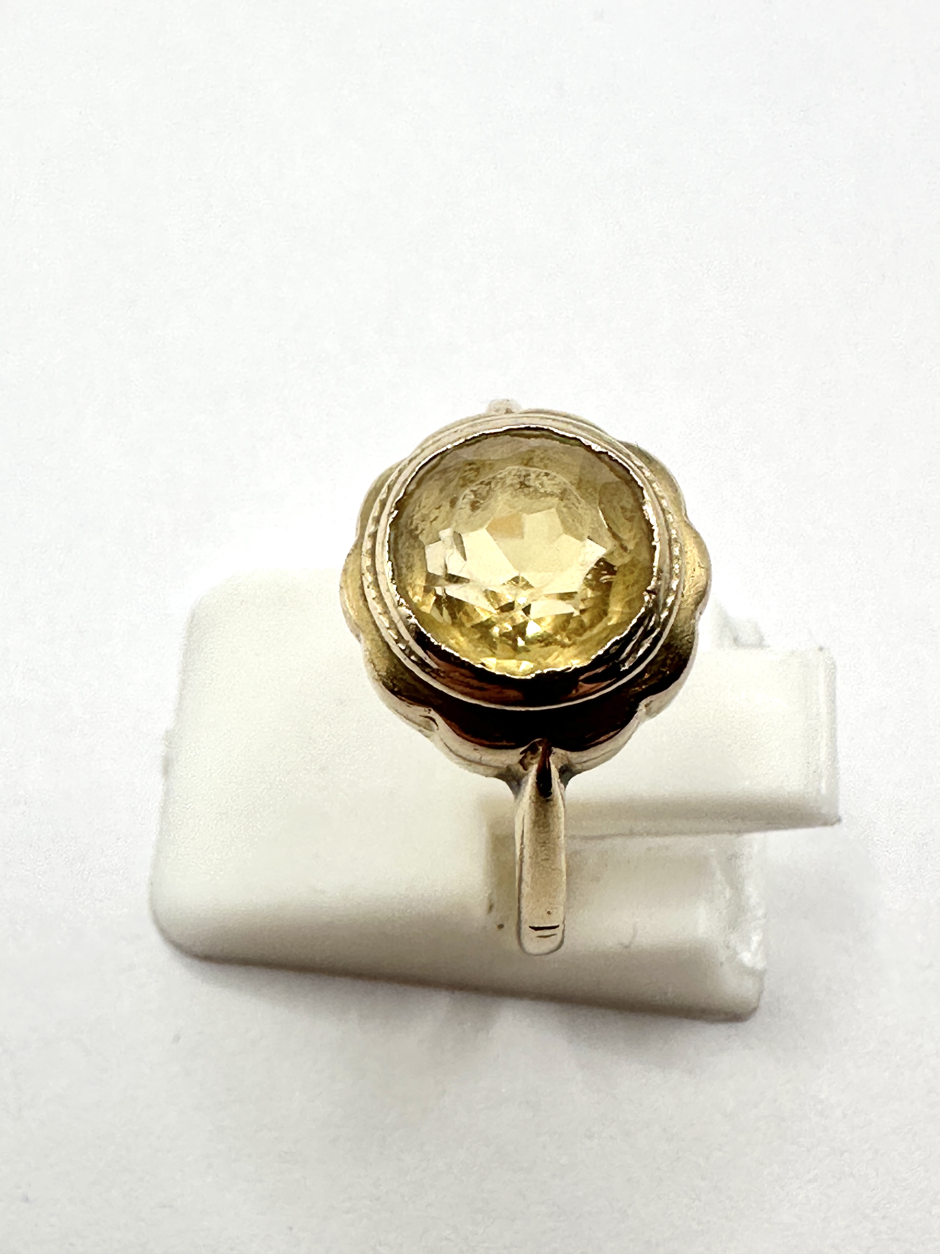 A 9k gold ring featuring a round faceted citrine. The gemstone is bezel-set within a scalloped surround. The ring is finished with a simple polished band. A small hallmark is visible to the interior of the shank.
