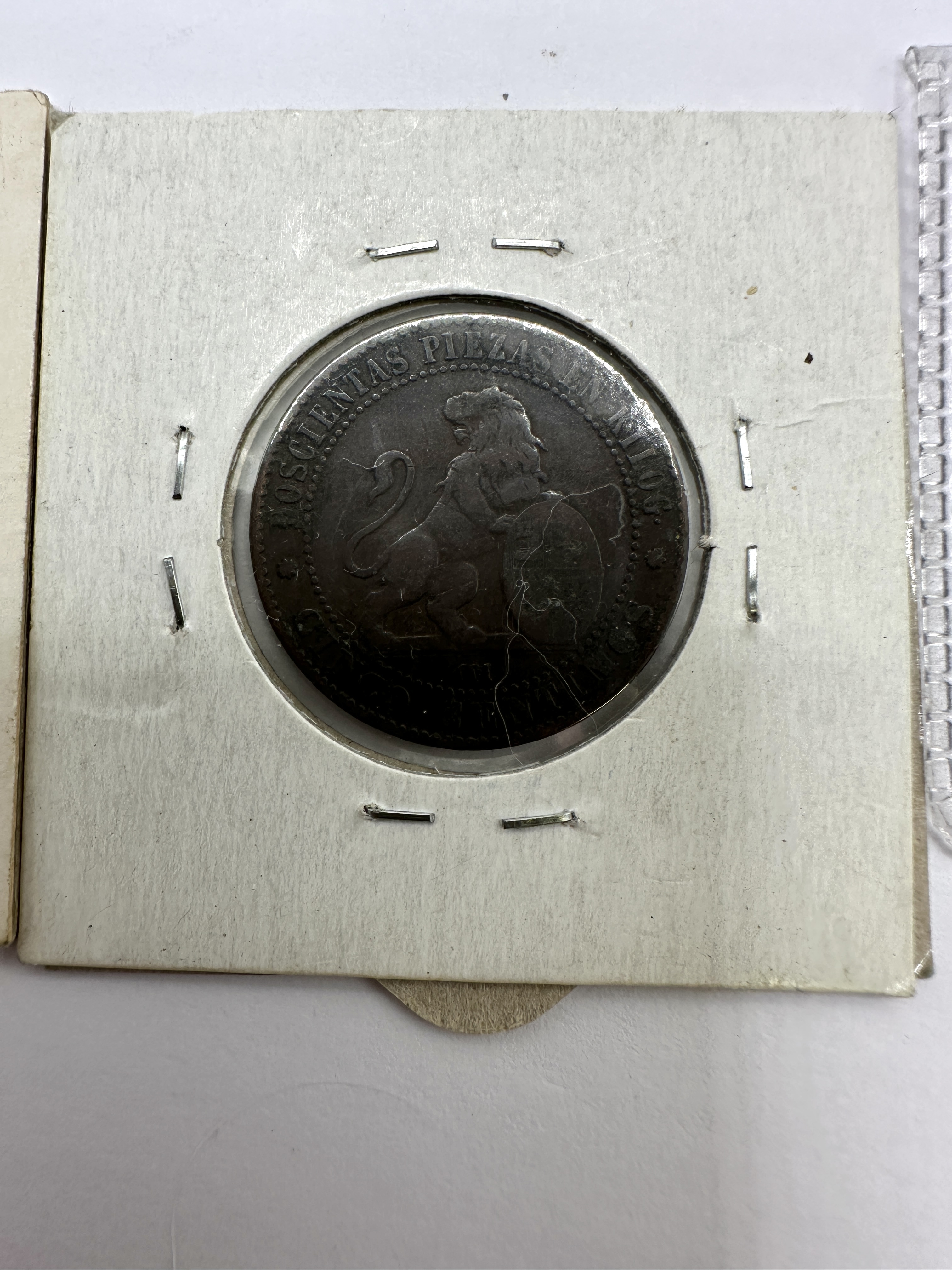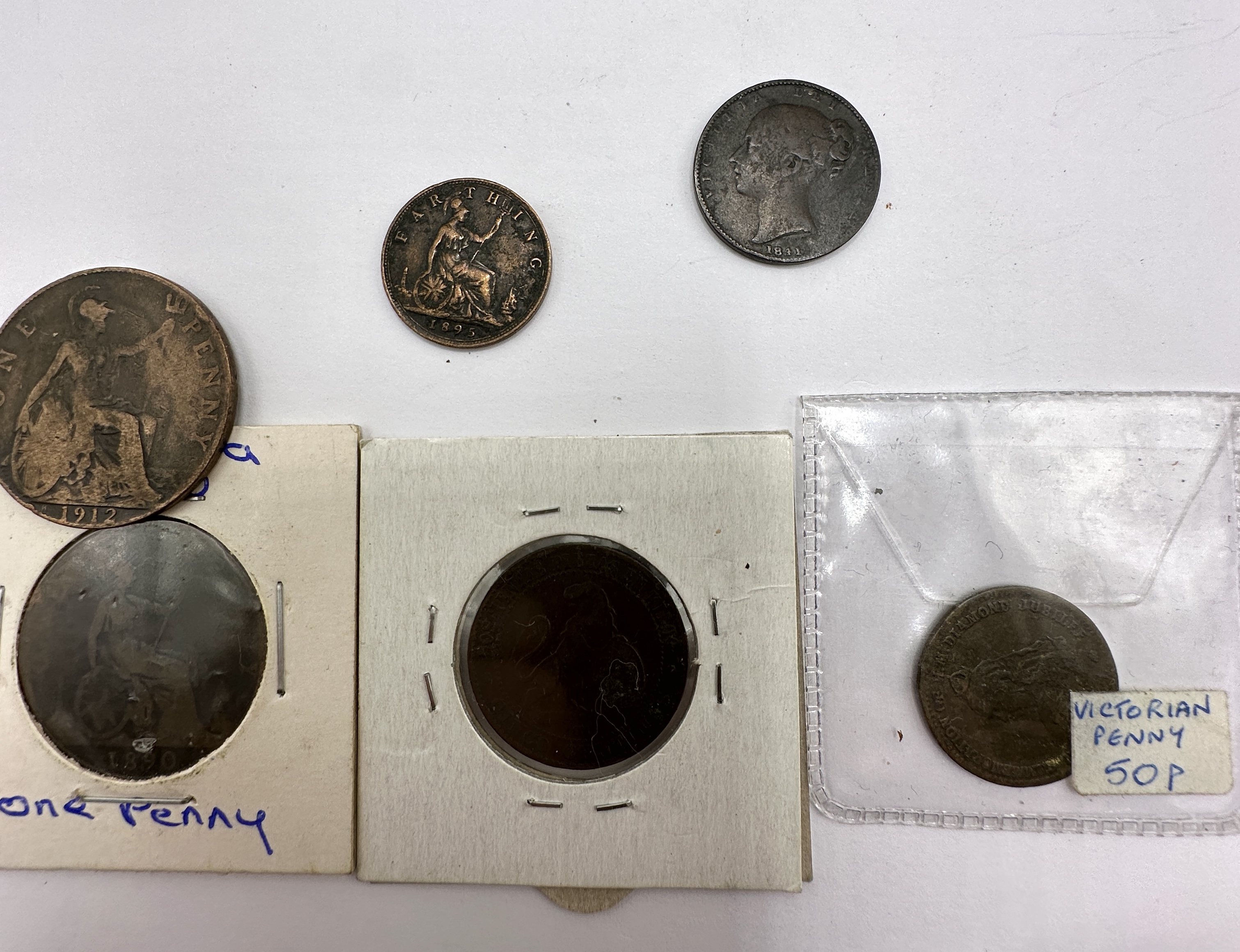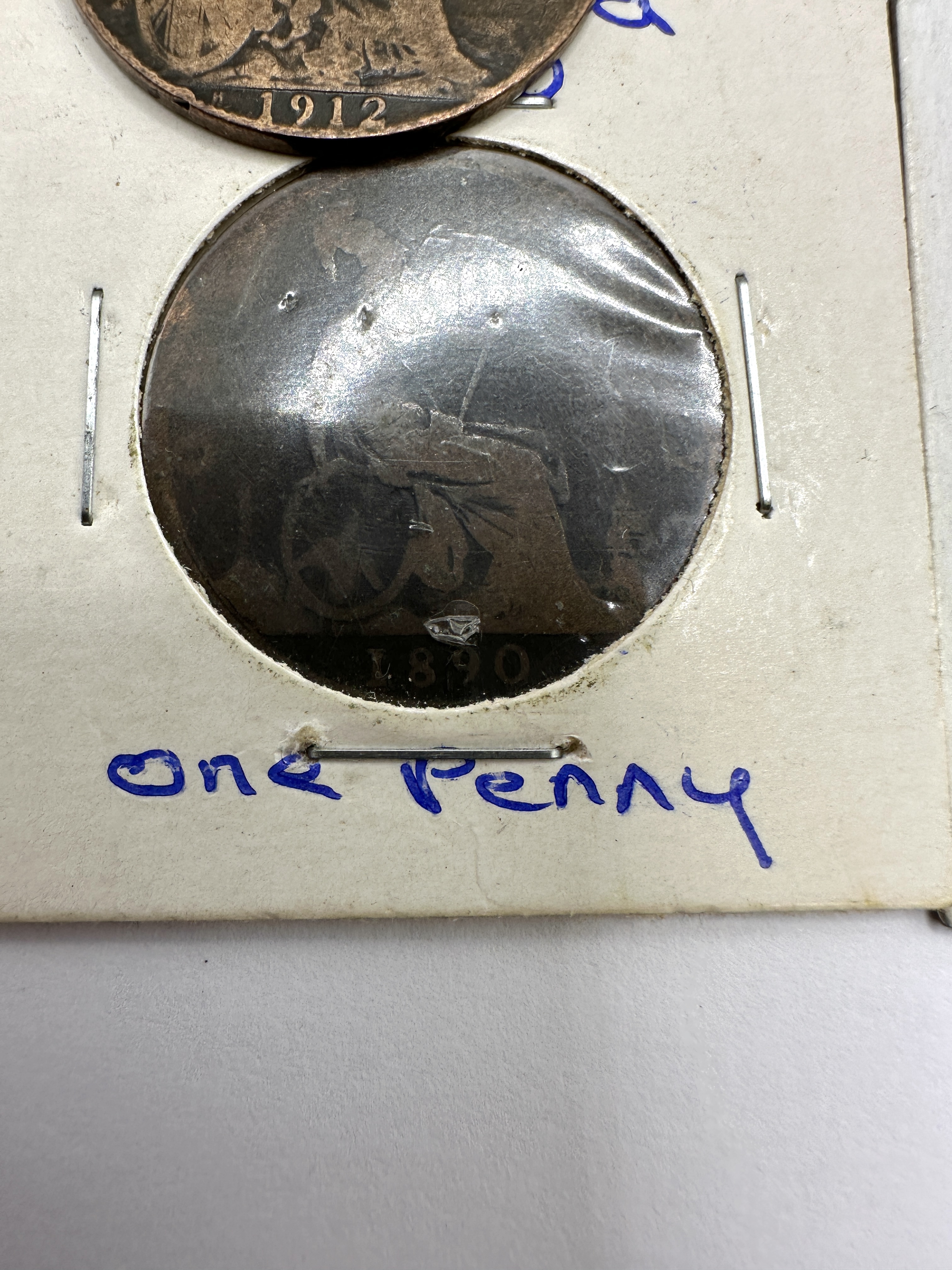 A collection of British and international historical currency and commemorative pieces. The group includes British bronze one penny coins dated 1890 and 1912, alongside a British bronze farthing dated 1895. Also featured is an 1841 silver-toned coin depicting the young head profile of Queen Victoria and a Spanish coin inscribed DOSCIENTAS PIEZAS EN KILOG. with a lion and shield motif. The lot is completed by a Victorian Diamond Jubilee commemorative token. Several pieces are presented in plastic sleeves or stapled cardboard flips with handwritten identifications.