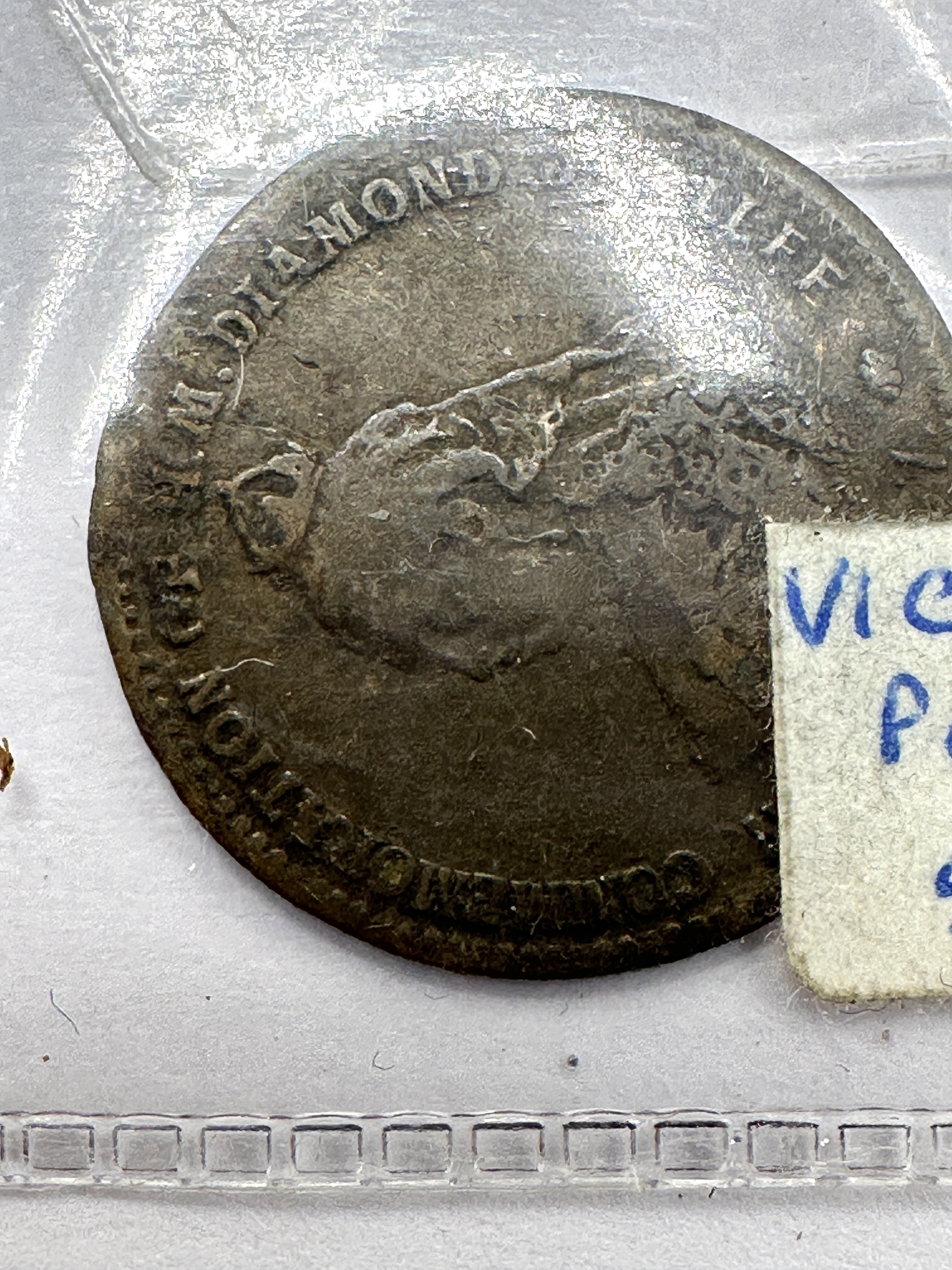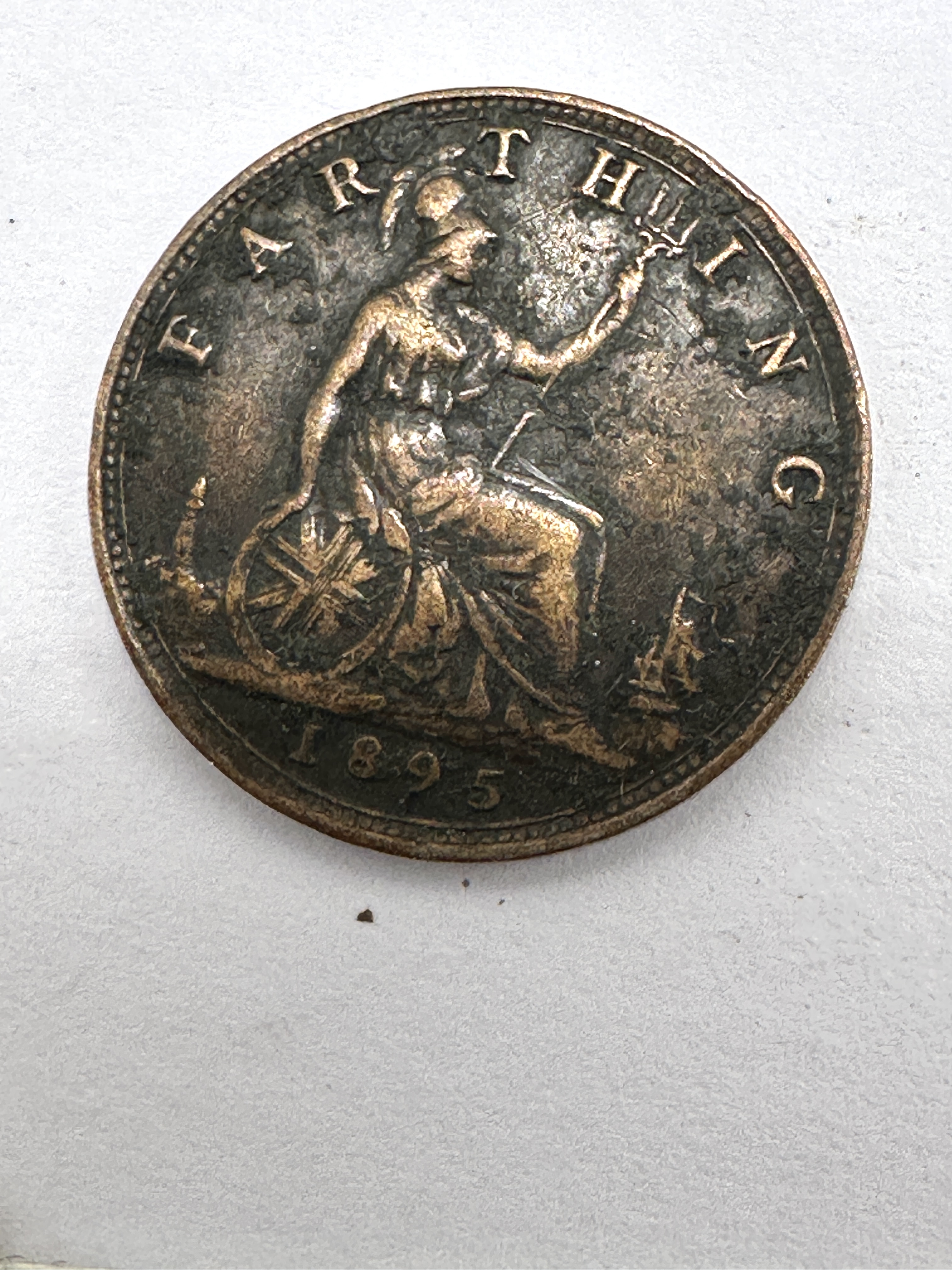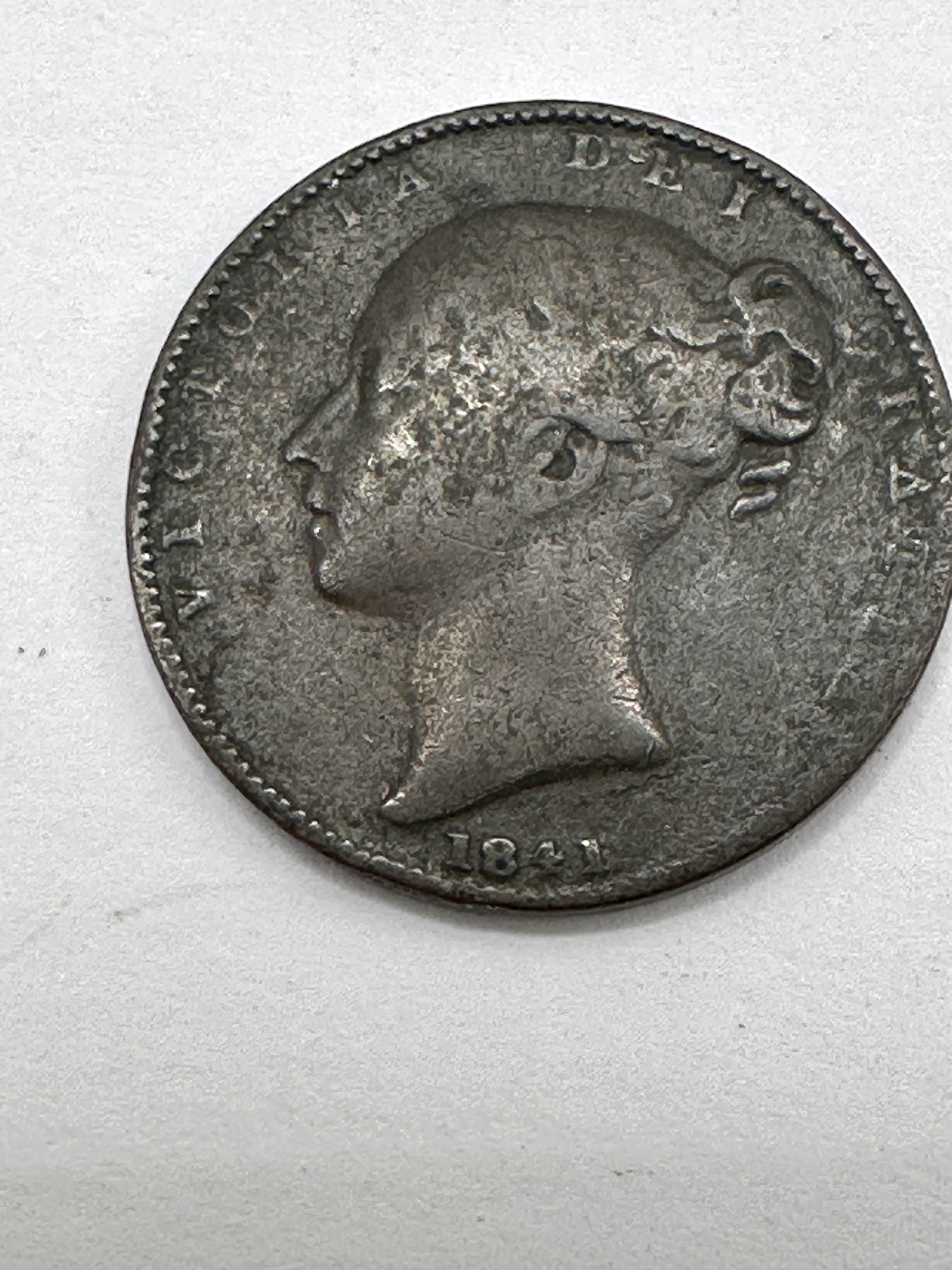 A collection of British and international historical currency and commemorative pieces. The group includes British bronze one penny coins dated 1890 and 1912, alongside a British bronze farthing dated 1895. Also featured is an 1841 silver-toned coin depicting the young head profile of Queen Victoria and a Spanish coin inscribed DOSCIENTAS PIEZAS EN KILOG. with a lion and shield motif. The lot is completed by a Victorian Diamond Jubilee commemorative token. Several pieces are presented in plastic sleeves or stapled cardboard flips with handwritten identifications.