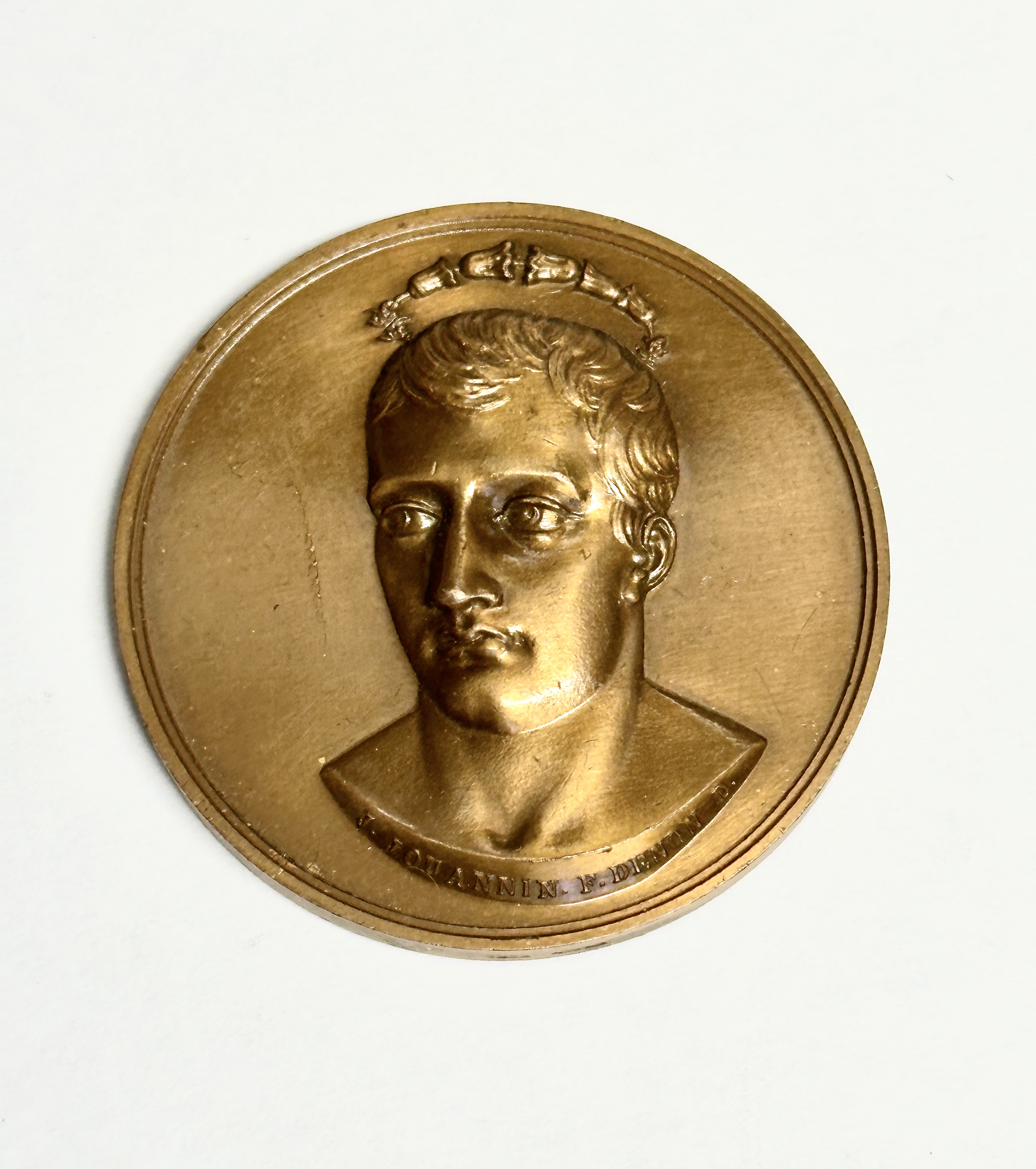 A Napoleonic commemorative medal, L’Egypte Conquise, designed by Denon and engraved by Jouannin and Brenet. This piece celebrates the conquest of Egypt in 1798. The obverse features a high-relief neoclassical bust of a youthful Napoleon Bonaparte wearing a laurel wreath, with the inscription J. JOUANNIN. F. DENON. D. along the bottom edge of the portrait. The reverse depicts a symbolic scene of a general in a chariot drawn by two camels, being crowned by a winged Victory figure, set between an Egyptian obelisk and a classical column. This side is inscribed L’EGYPTE CONQUISE and dated MDCCXCVIII in Roman numerals, with the engraver mark BRENET. F. DENON. D. at the base.