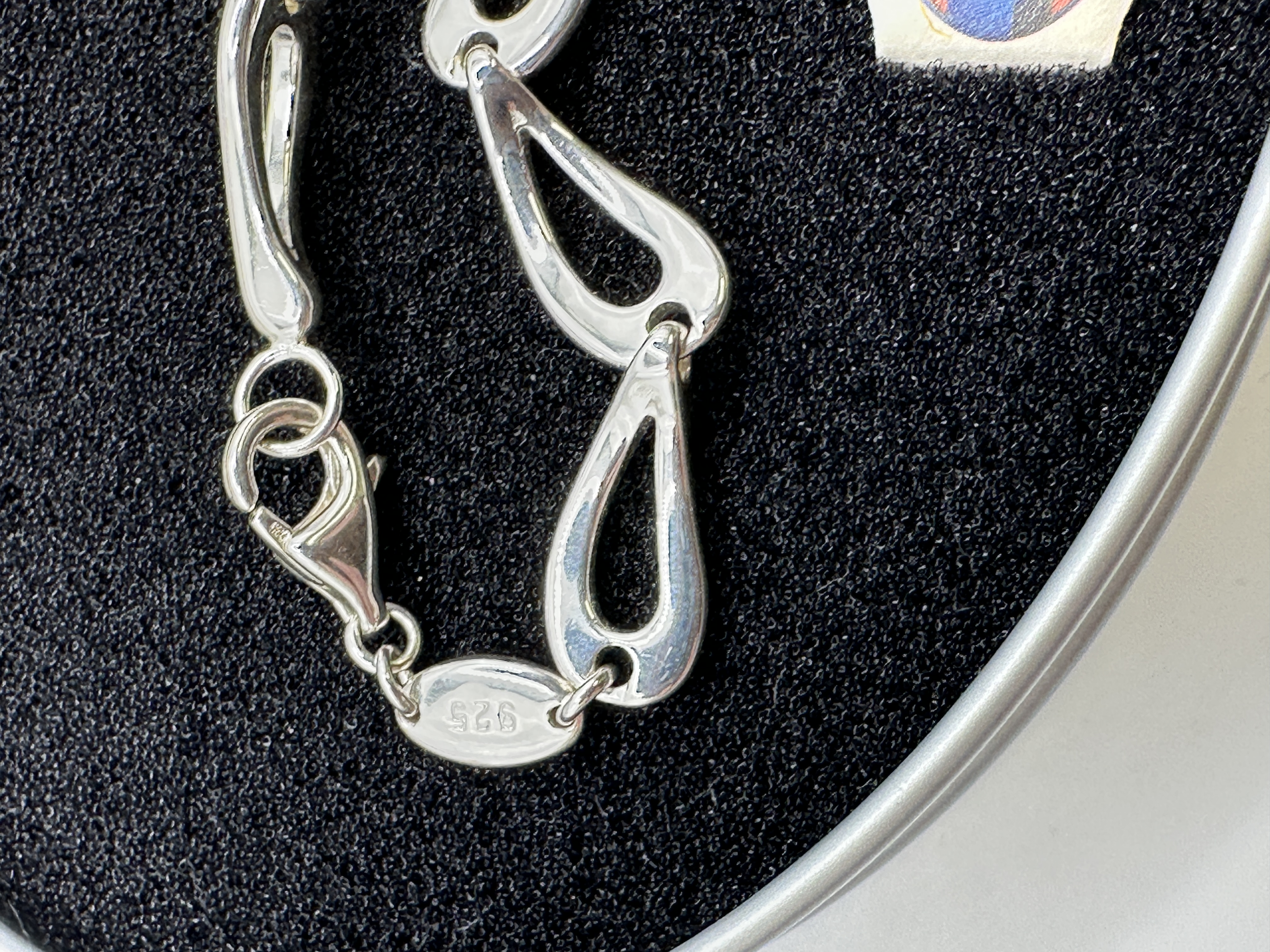 A 925 silver link bracelet by Fossil. The piece is composed of a series of polished, open teardrop-shaped links and is secured with a lobster claw clasp. An oval metal tag near the clasp is marked FOSSIL on one side and 925 on the reverse. The bracelet is presented in its original decorative oval metal tin, which features a lid with a pink and yellow floral and butterfly motif and a cursive Fossil logo.