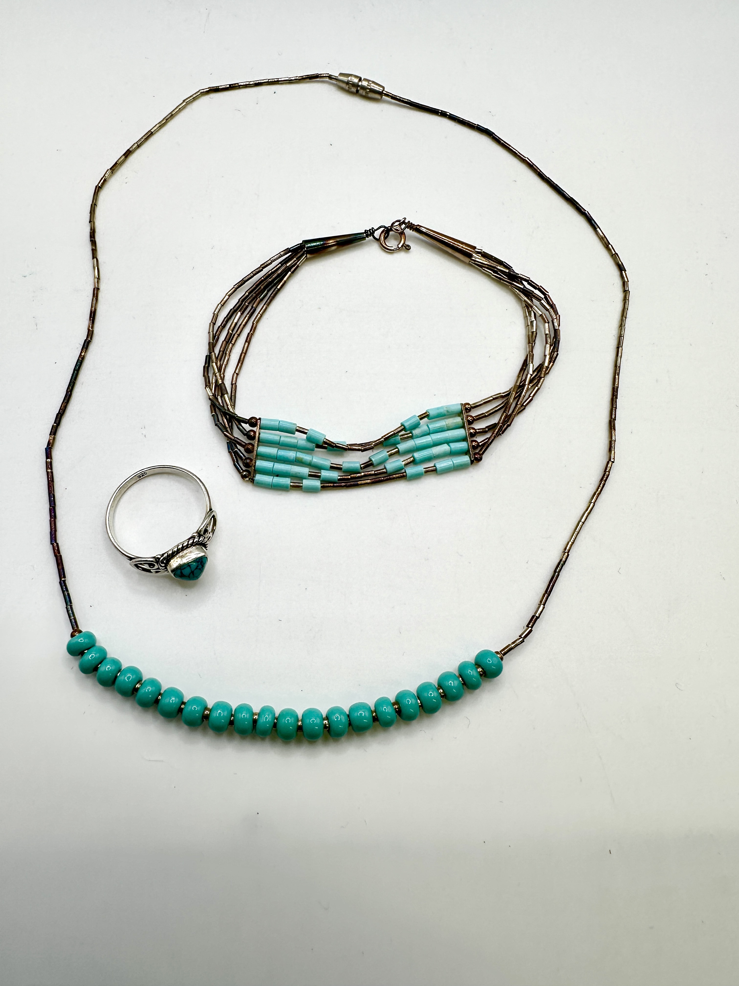 A trio of 925 silver jewellery items in the Southwest style, comprising a necklace, a multi-strand bracelet, and a ring. The necklace is constructed from fine liquid silver beads with a central section of rounded turquoise beads and is finished with a barrel clasp. The multi-strand bracelet features several rows of liquid silver beads with segments of cylindrical turquoise beads, terminating in conical end caps with a spring ring clasp. The ring centres a pear-shaped turquoise stone set within a decorative bezel featuring rope-twist and filigree-style details. The inner band of the ring bears a 925 hallmark.