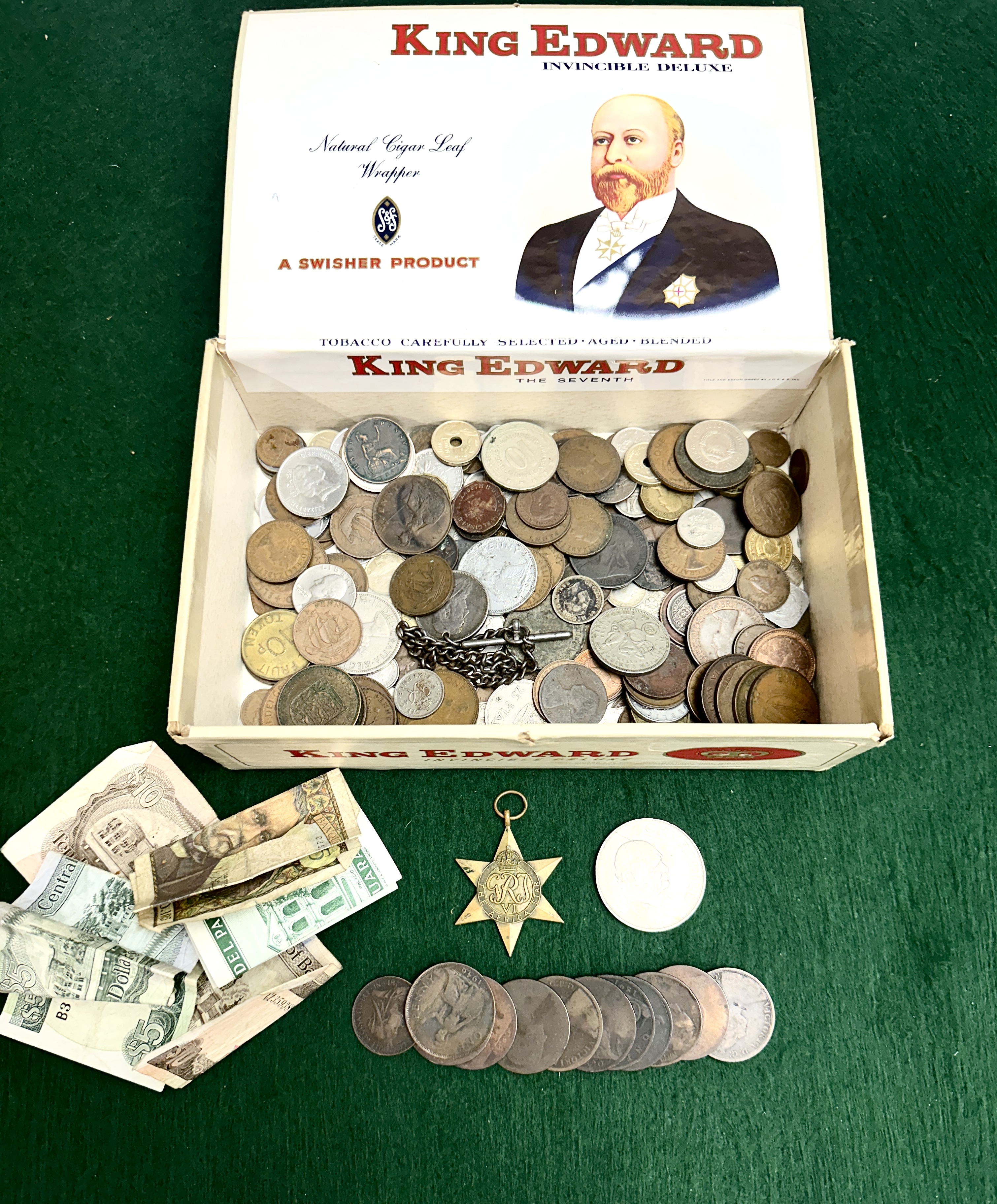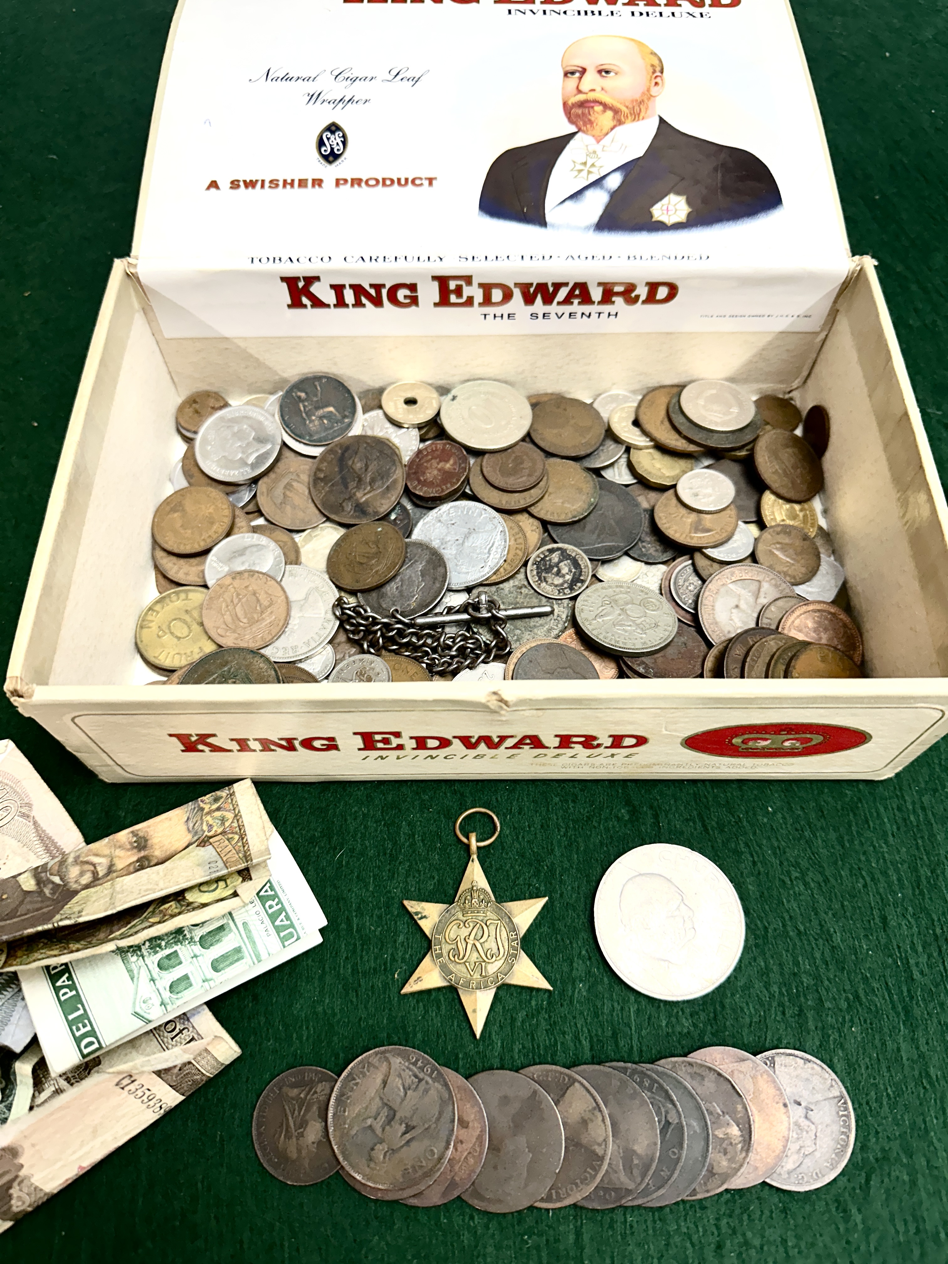 A collection of international numismatics and militaria presented within a vintage King Edward Invincible Deluxe cardboard cigar box. The lot includes a group of various world coins in copper and silver-coloured alloys, alongside a British Africa Star military medal featuring the Royal Cypher for King George VI. Additional items comprise several circulated international banknotes, including currency from Paraguay (Cinco Mil Guaranies), and multiple large-format copper-alloy pennies featuring portraits of British monarchs including Queen Victoria and George VI. The cigar box is a Swisher product featuring a portrait of King Edward VII on the inner and outer lid. The medal is of six-pointed star design with a circular centre and crown suspension.