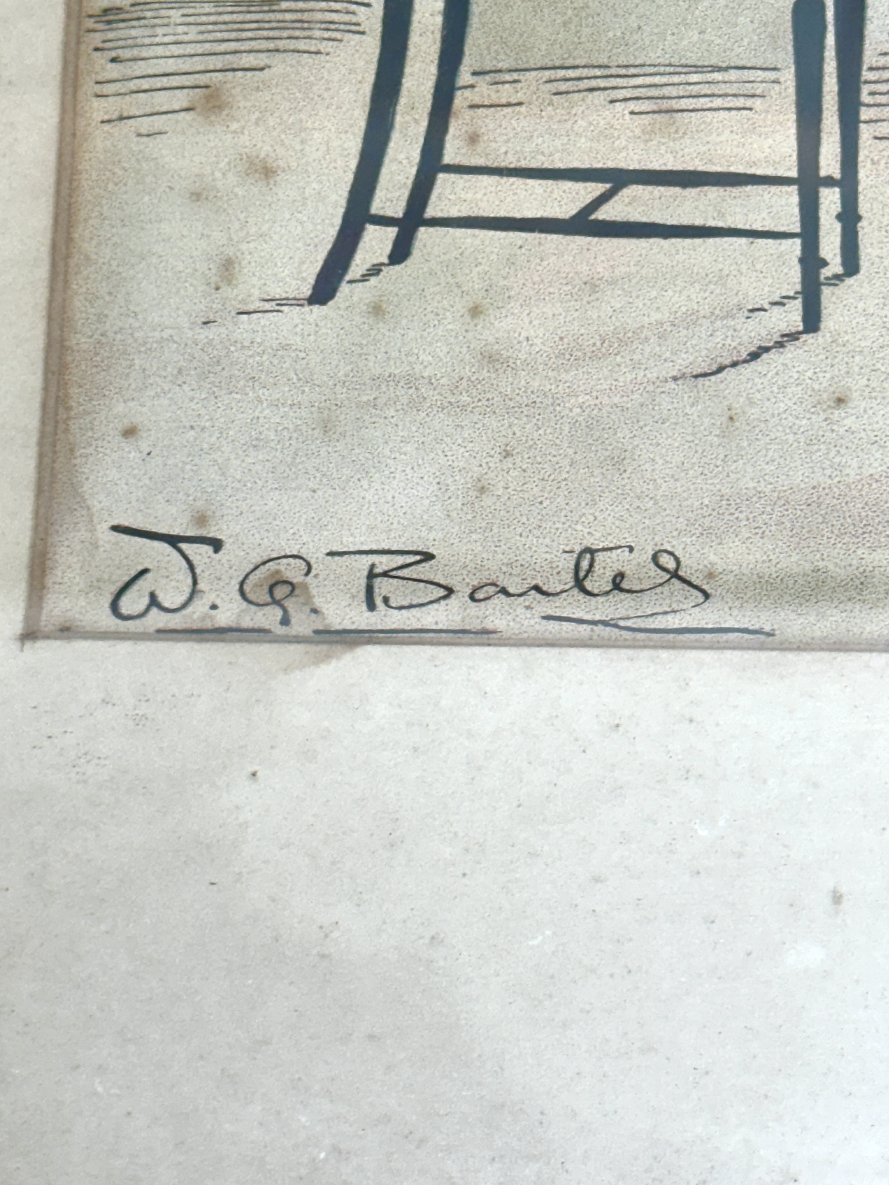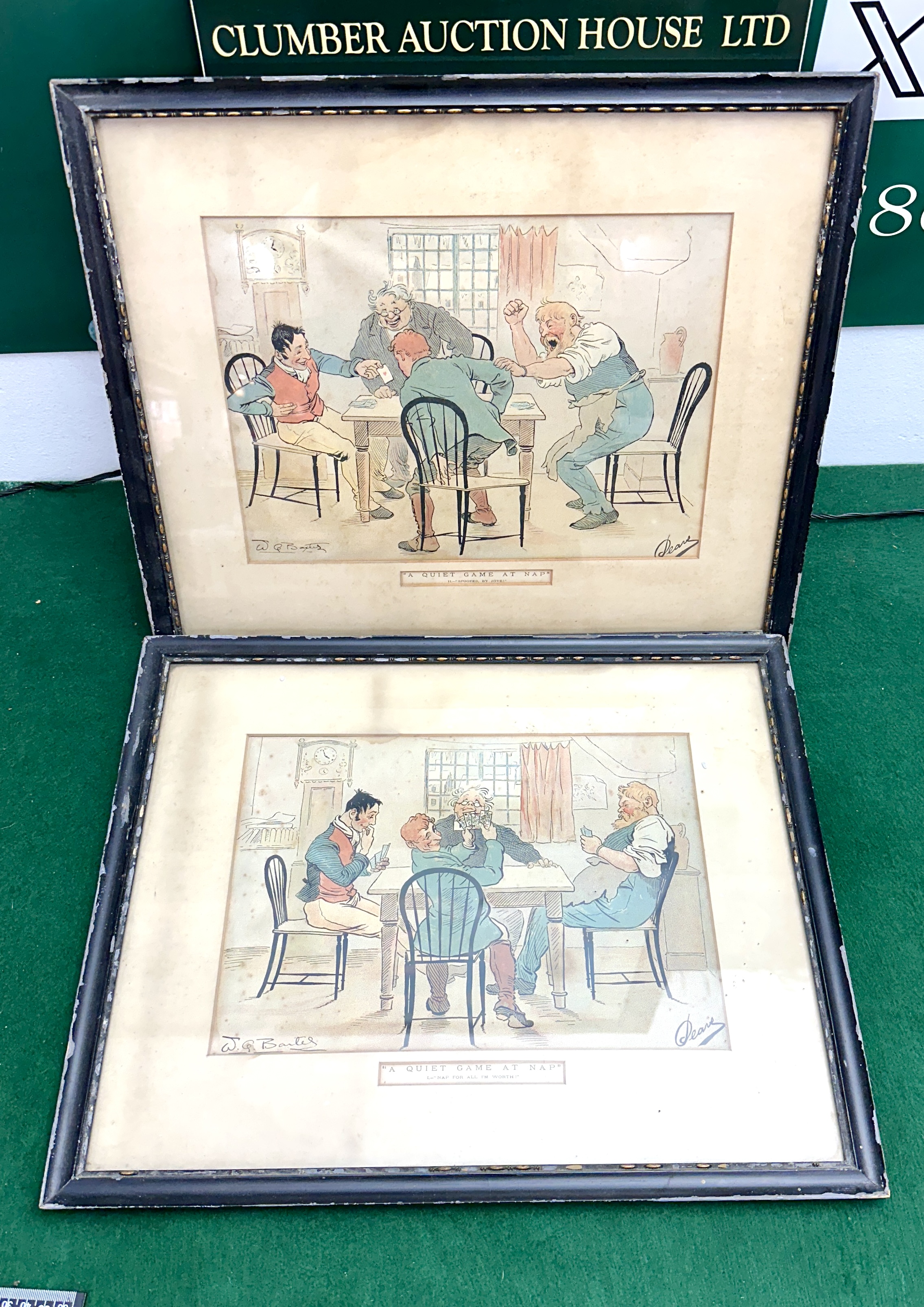 A pair of early 20th-century colour prints titled A Quiet Game at Nap, after original illustrations by W. G. Baxter (1856-1888) produced for Pears. The Victorian-style caricatures depict a group of men engaged in a card game within a domestic interior. The first print is subtitled I. – NAP FOR ALL I’M WORTH! and the second is subtitled II. – SPOOFED, BY JOVE!. Both pieces feature the printed signatures of W. G. Baxter to the lower left corner and Pears to the lower right corner. The prints are presented in mounts and housed within glazed, black-painted wooden frames with gilt inner details.