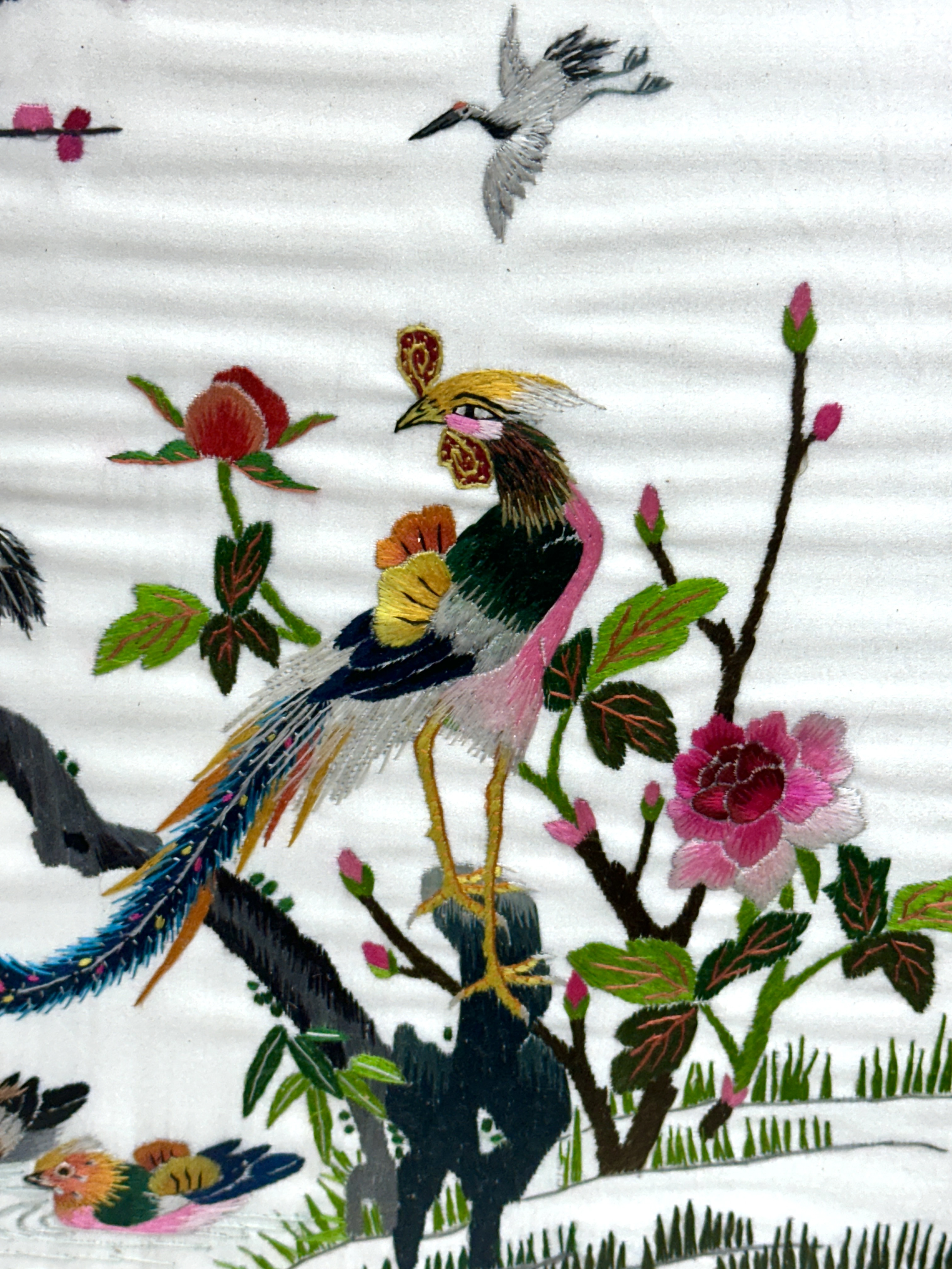 The silk embroidery remains bright with good colour retention. The silk grounds show visible horizontal rippling throughout. There is evidence of light foxing and staining, particularly concentrated in the lower-left corner of the peacock panel. The frames exhibit minor surface wear consistent with age.